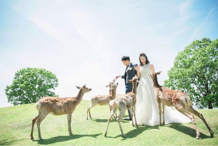Nara Park features expansive greenery and freely roaming deer. The blend of natural light and historic ambiance creates lively, natural pre-wedding photography. Interactions with deer add unique, memorable storytelling elements.