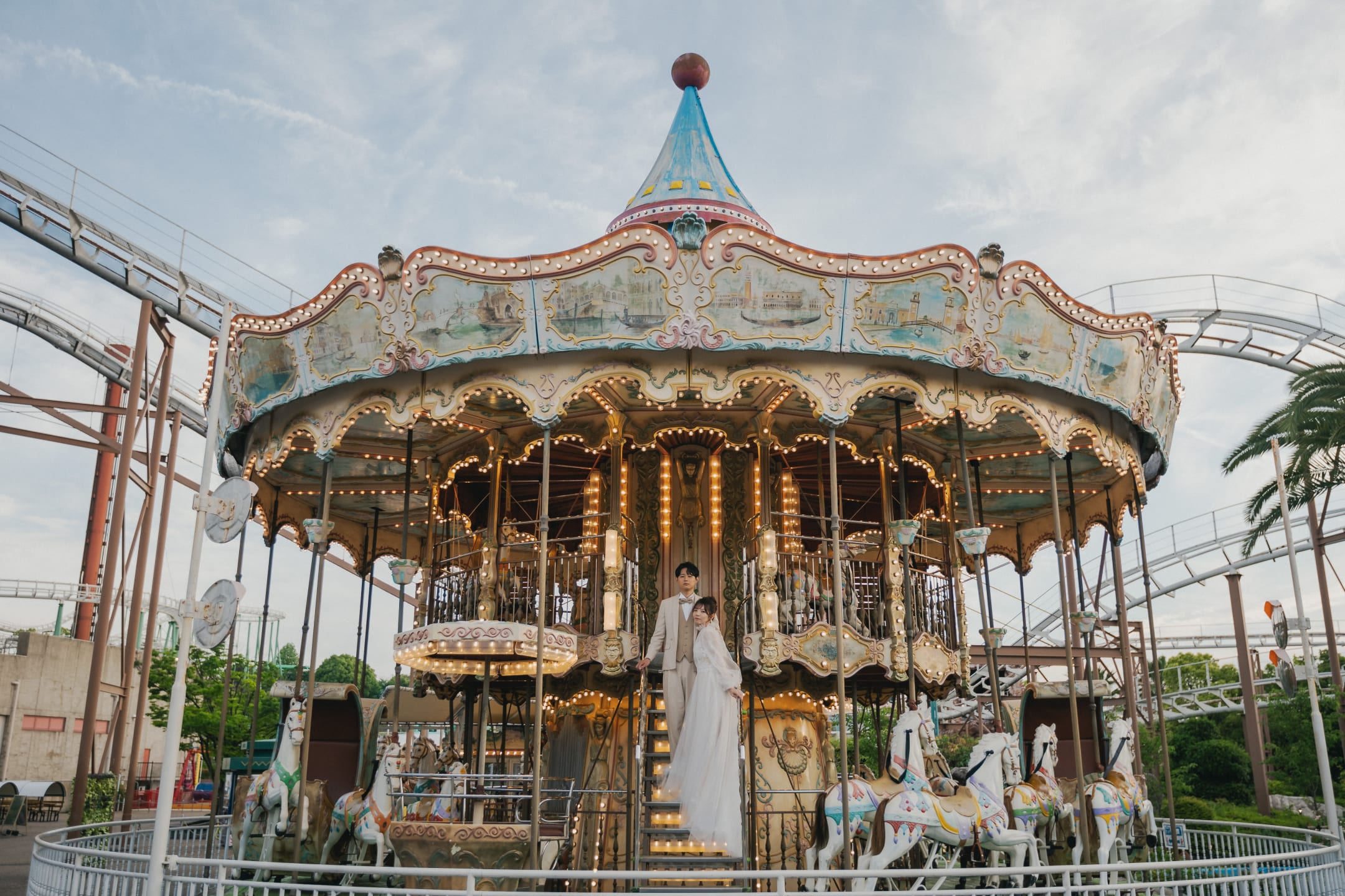 Osaka Castle, an iconic landmark of Osaka, provides a powerful backdrop with its imposing stone walls and majestic main keep. The historic grandeur combined with the expansive greenery of the surrounding park enables dynamic and visually striking pre-wedding photography.