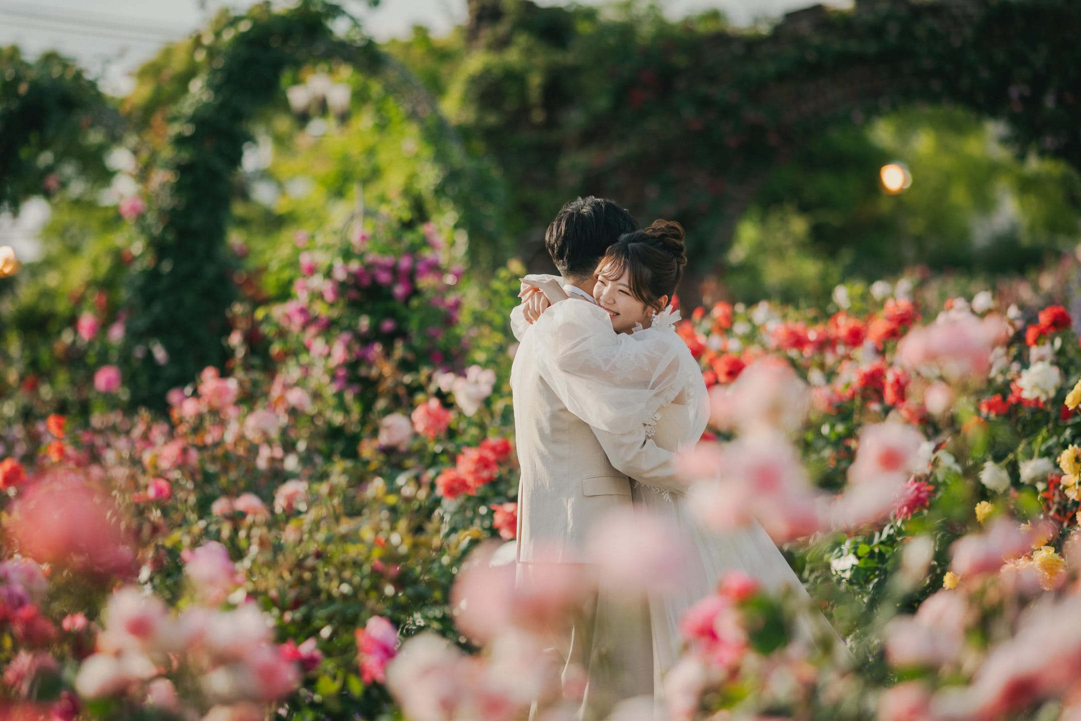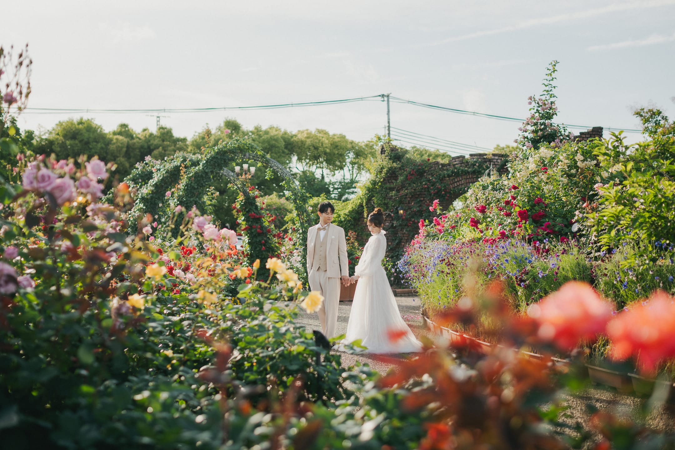 Facing Osaka Bay, Marble Beach is a scenic location where white stones and the deep blue sea form a striking contrast. The sea breeze and open atmosphere allow for natural, airy pre-wedding photos, and the area is also known for its beautiful silhouette shots at sunset.