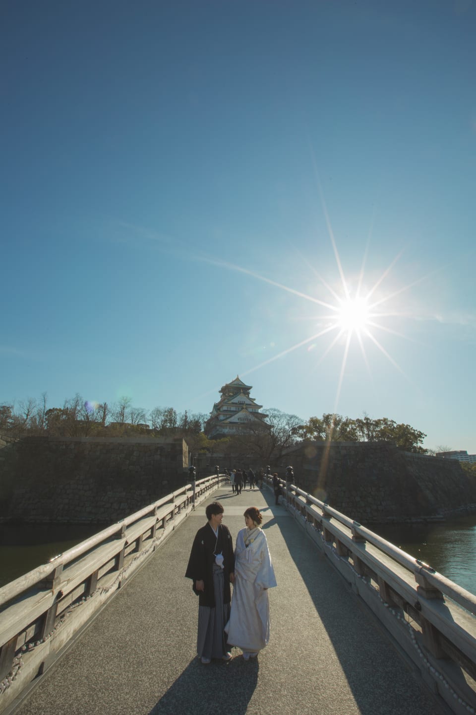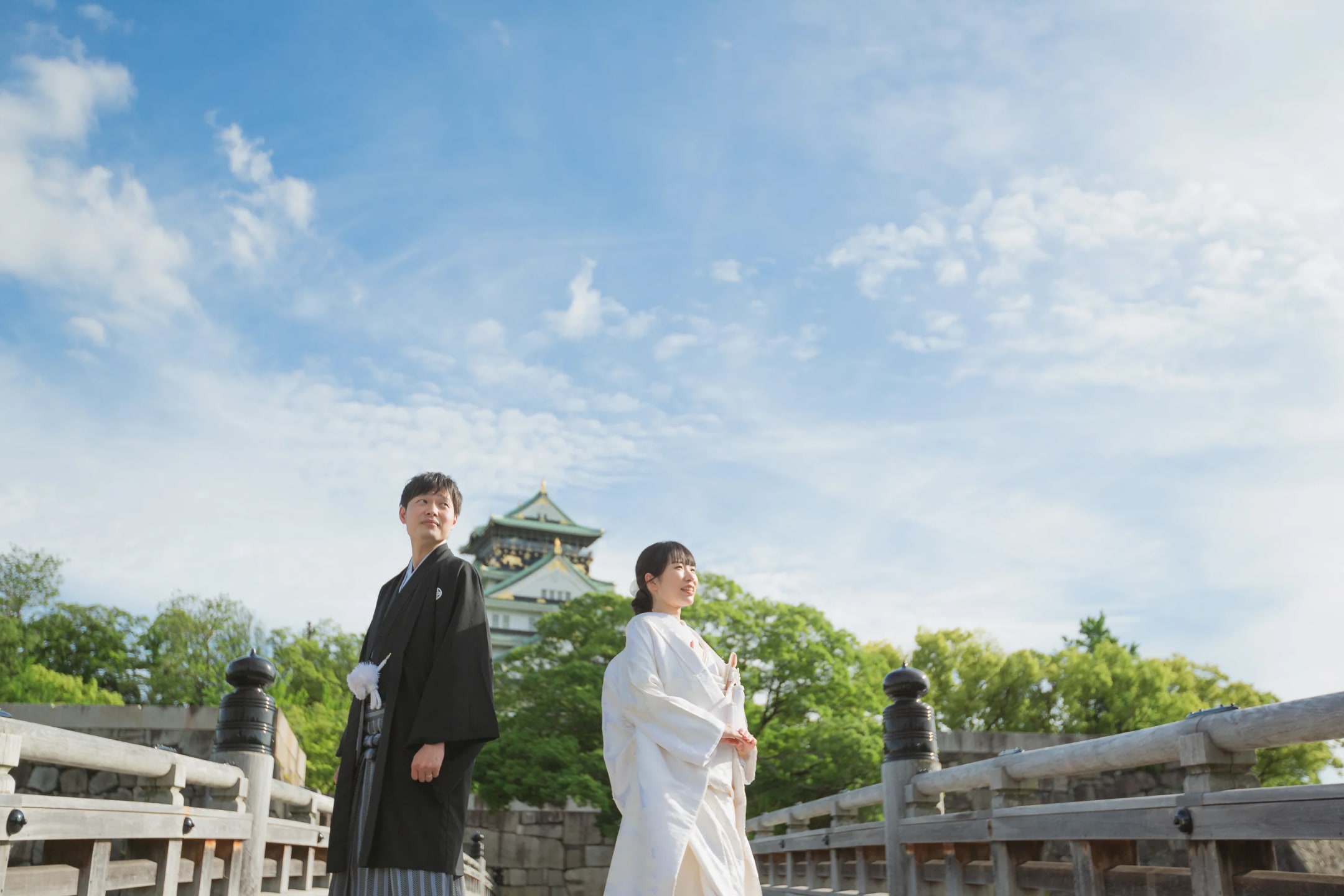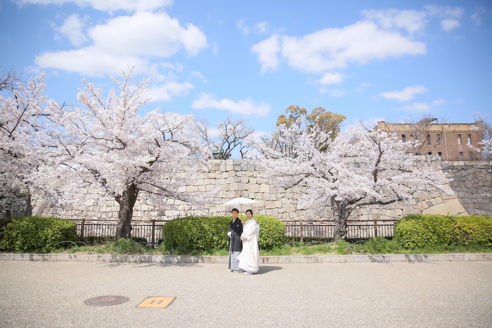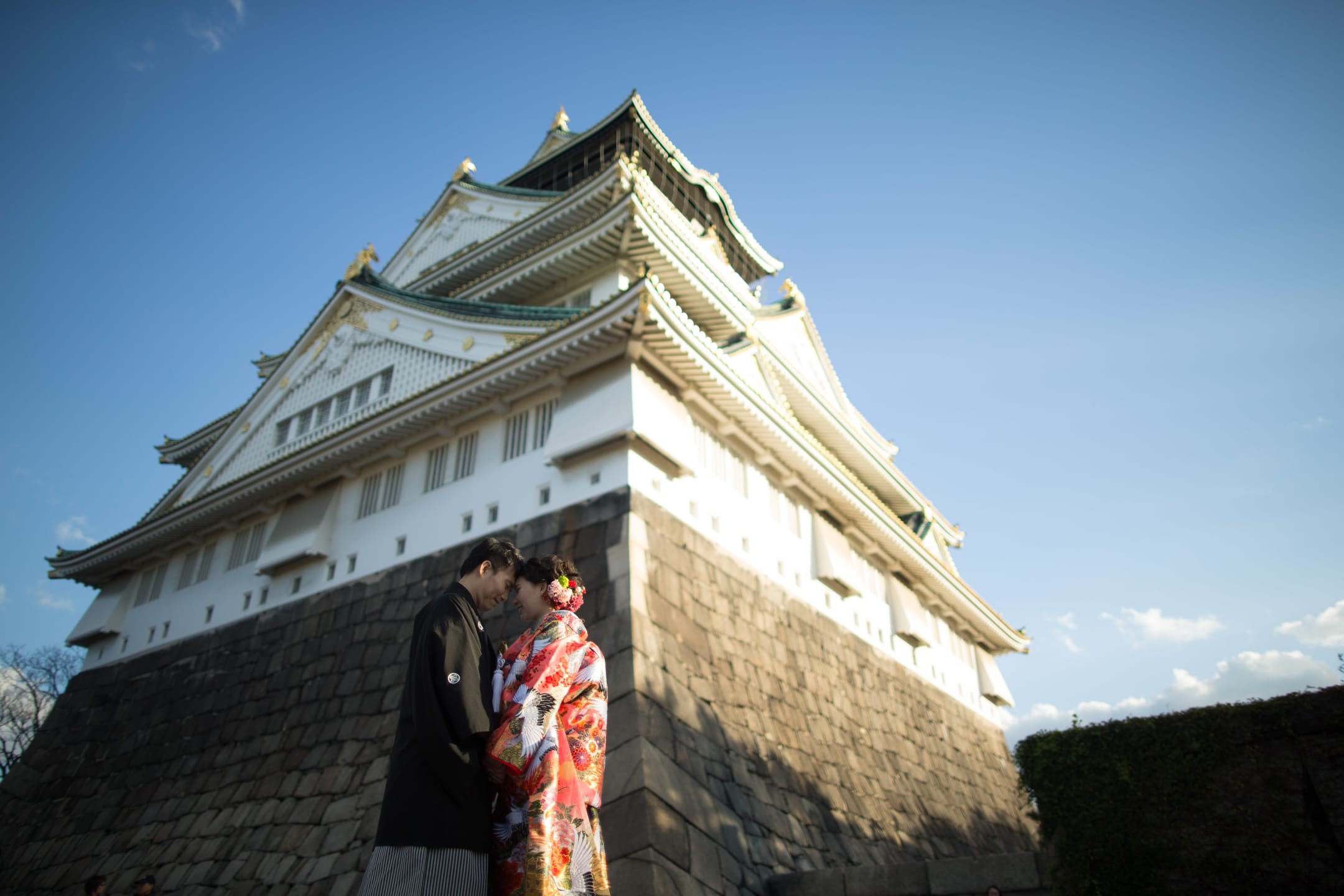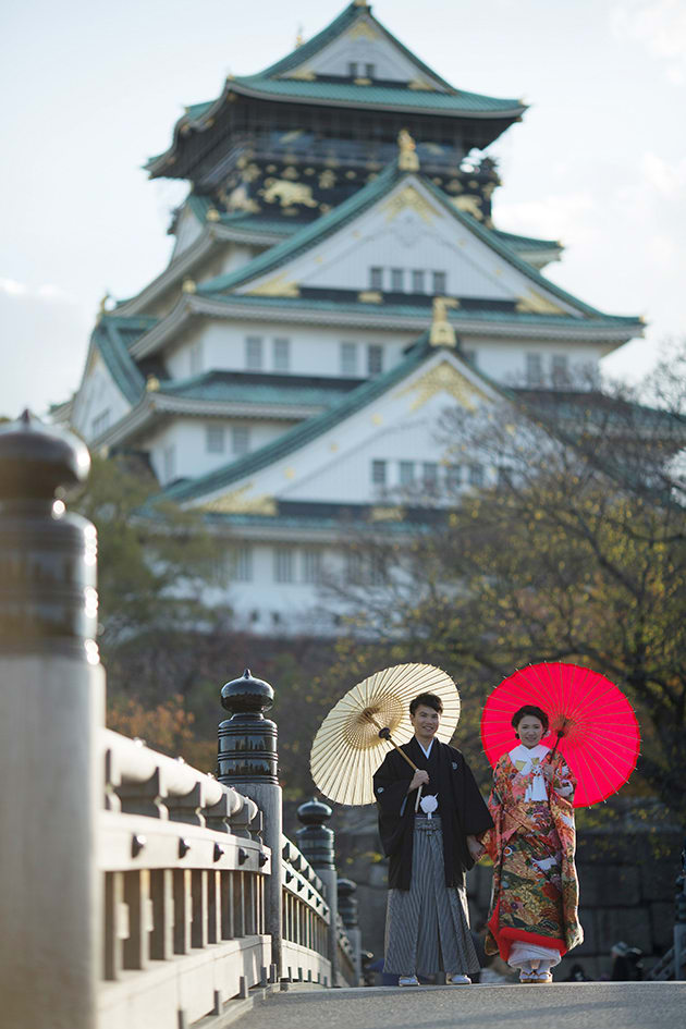 Osaka Castle, an iconic landmark of Osaka, provides a powerful backdrop with its imposing stone walls and majestic main keep. The historic grandeur combined with the expansive greenery of the surrounding park enables dynamic and visually striking pre-wedding photography.