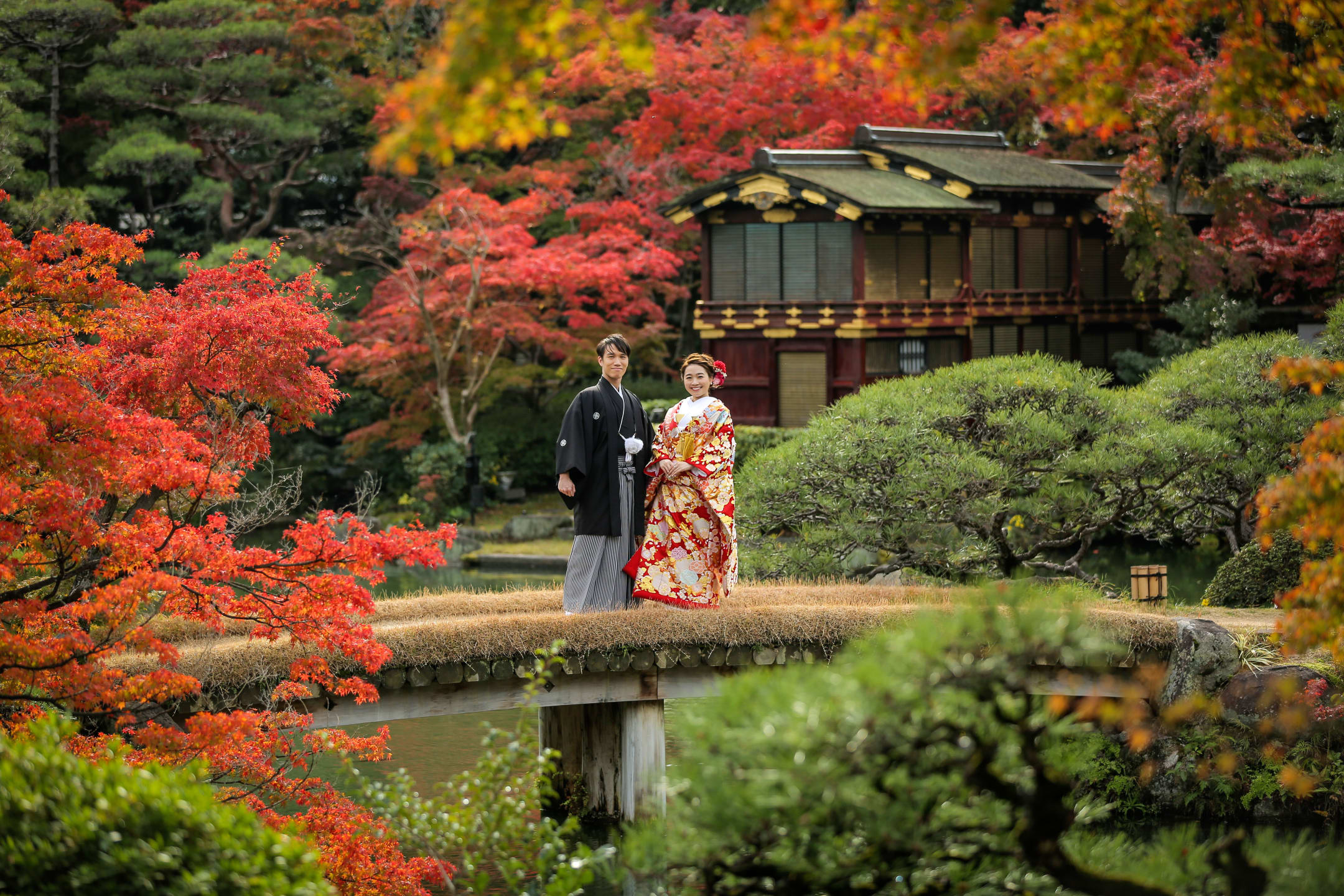 Sorakuen is a traditional Japanese garden with seasonal plantings, ponds, and historic architecture. Ideal for Japanese attire, its calm light and refined atmosphere produce elegant photographs.