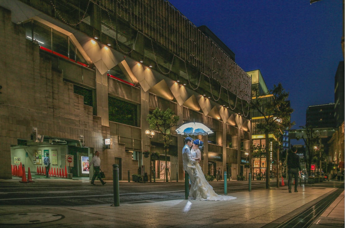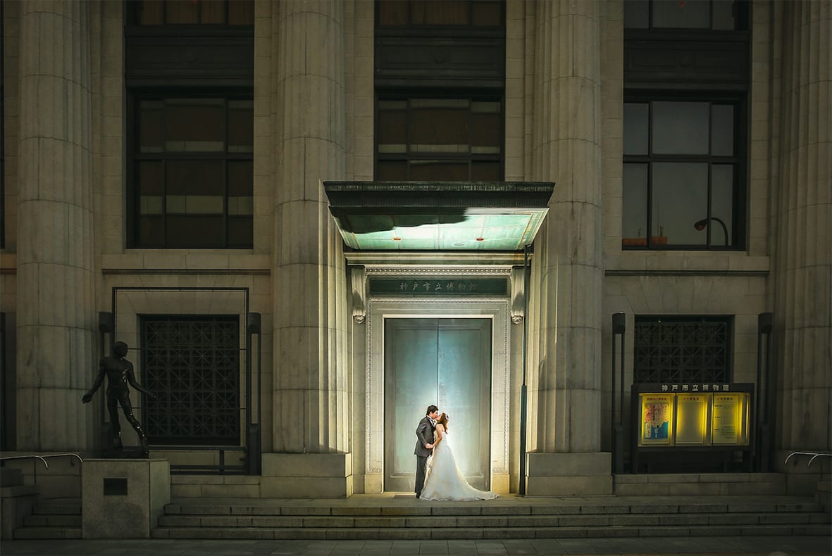 Kobe Harborland blends a seaside setting with a modern cityscape. The interplay of ocean and city lights creates dramatic pre-wedding imagery, particularly at dusk and night.