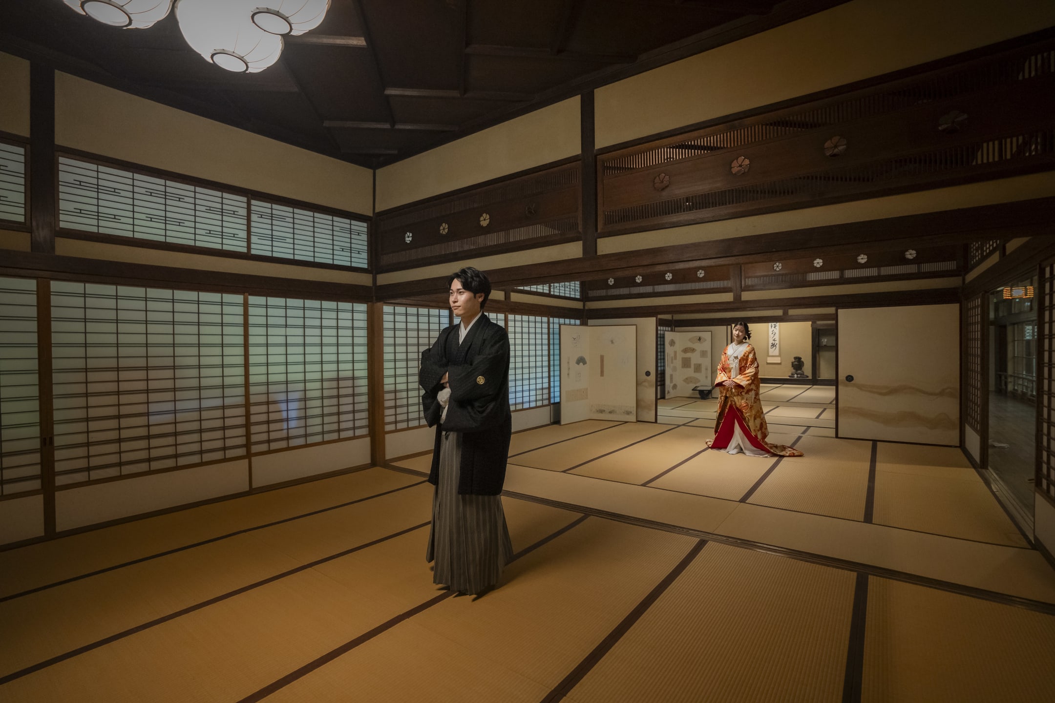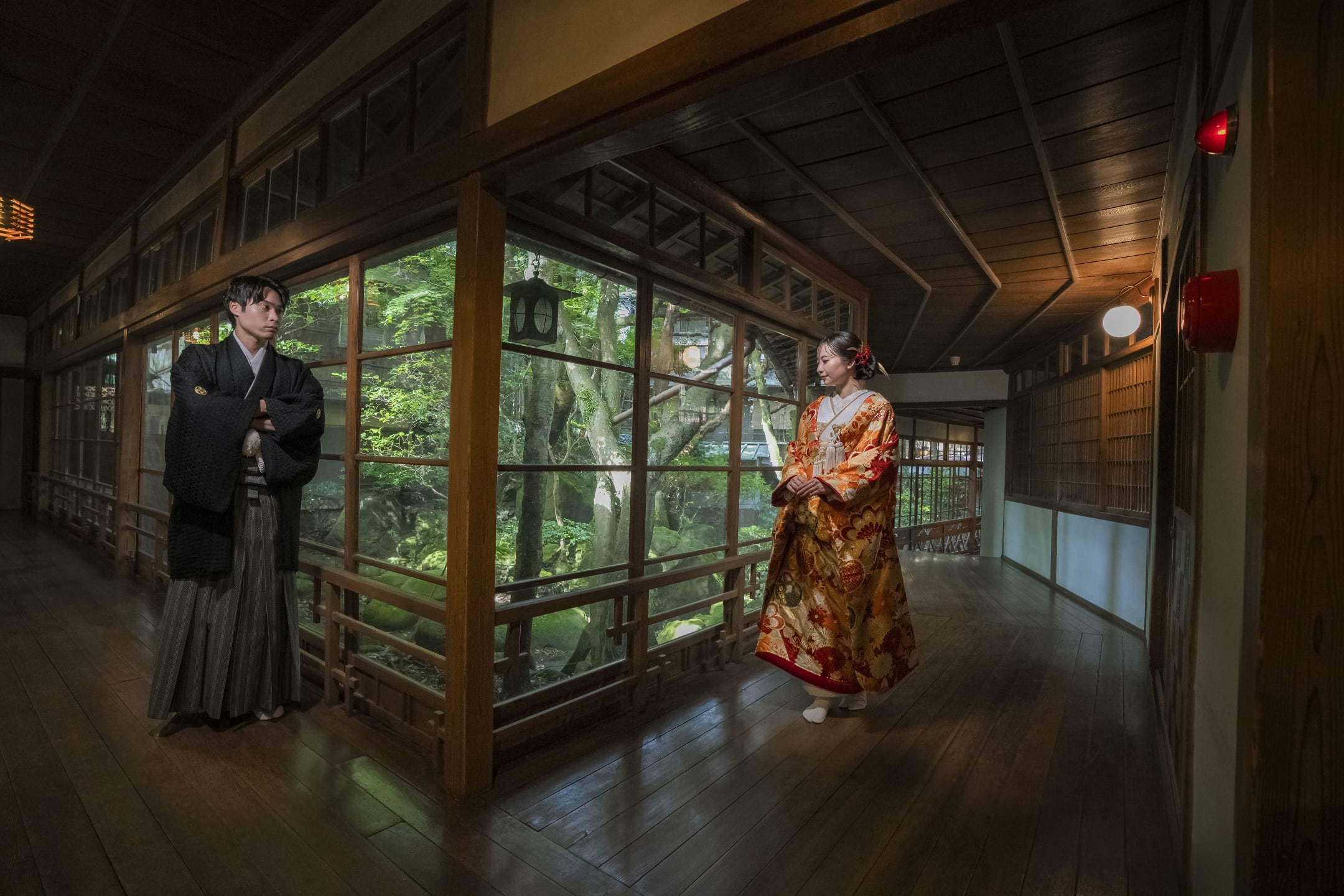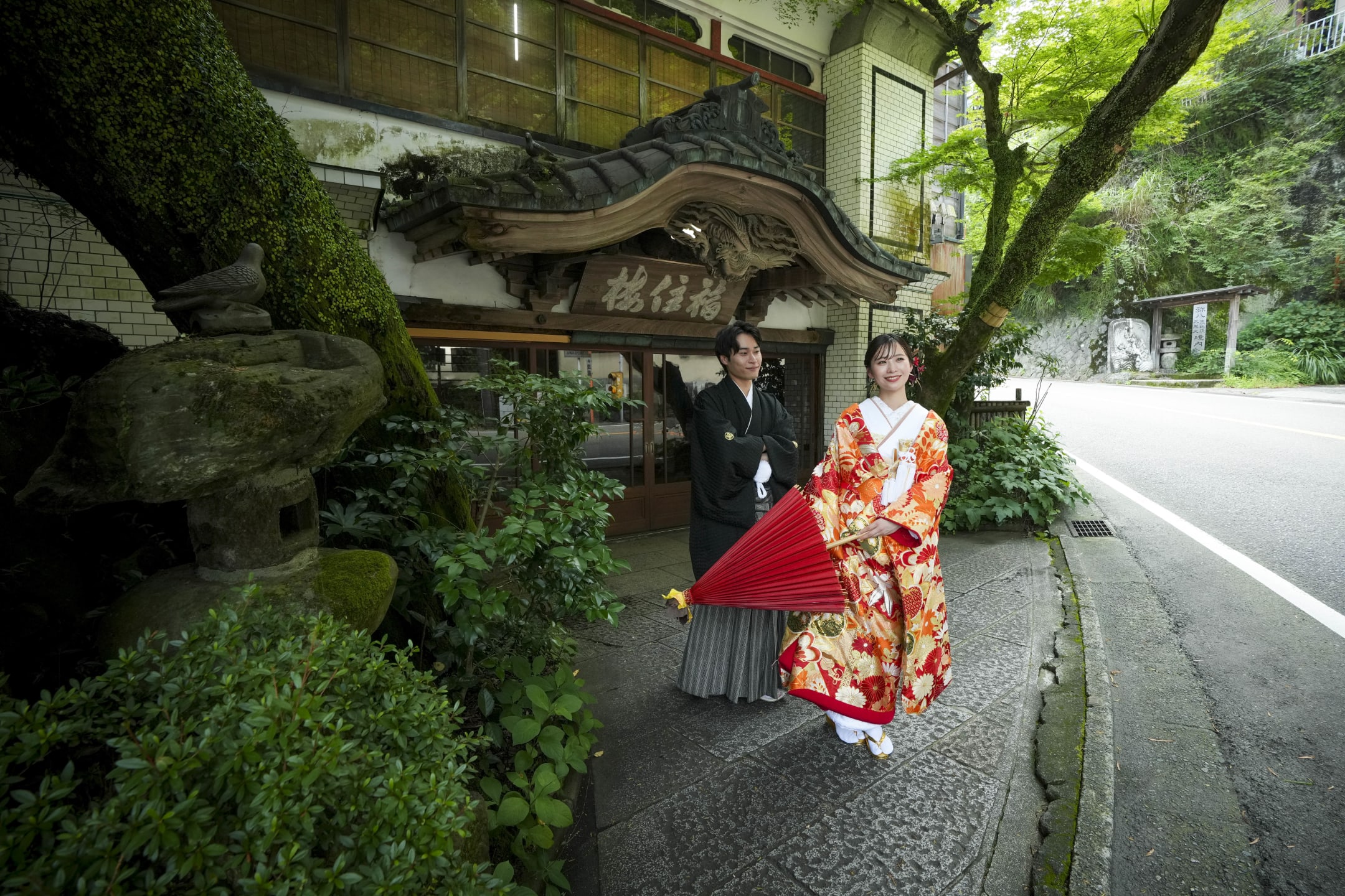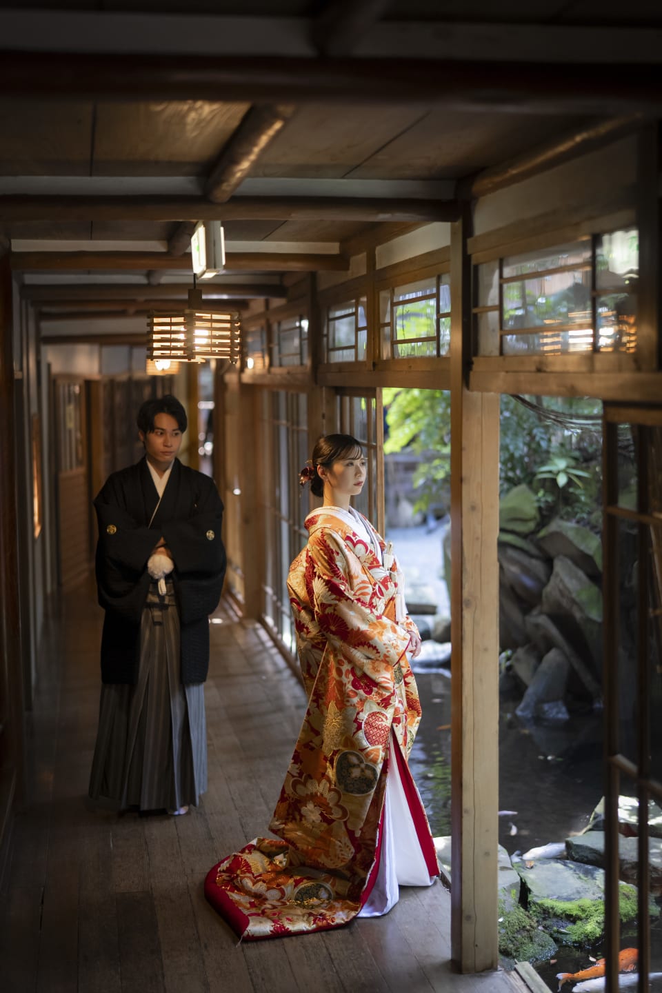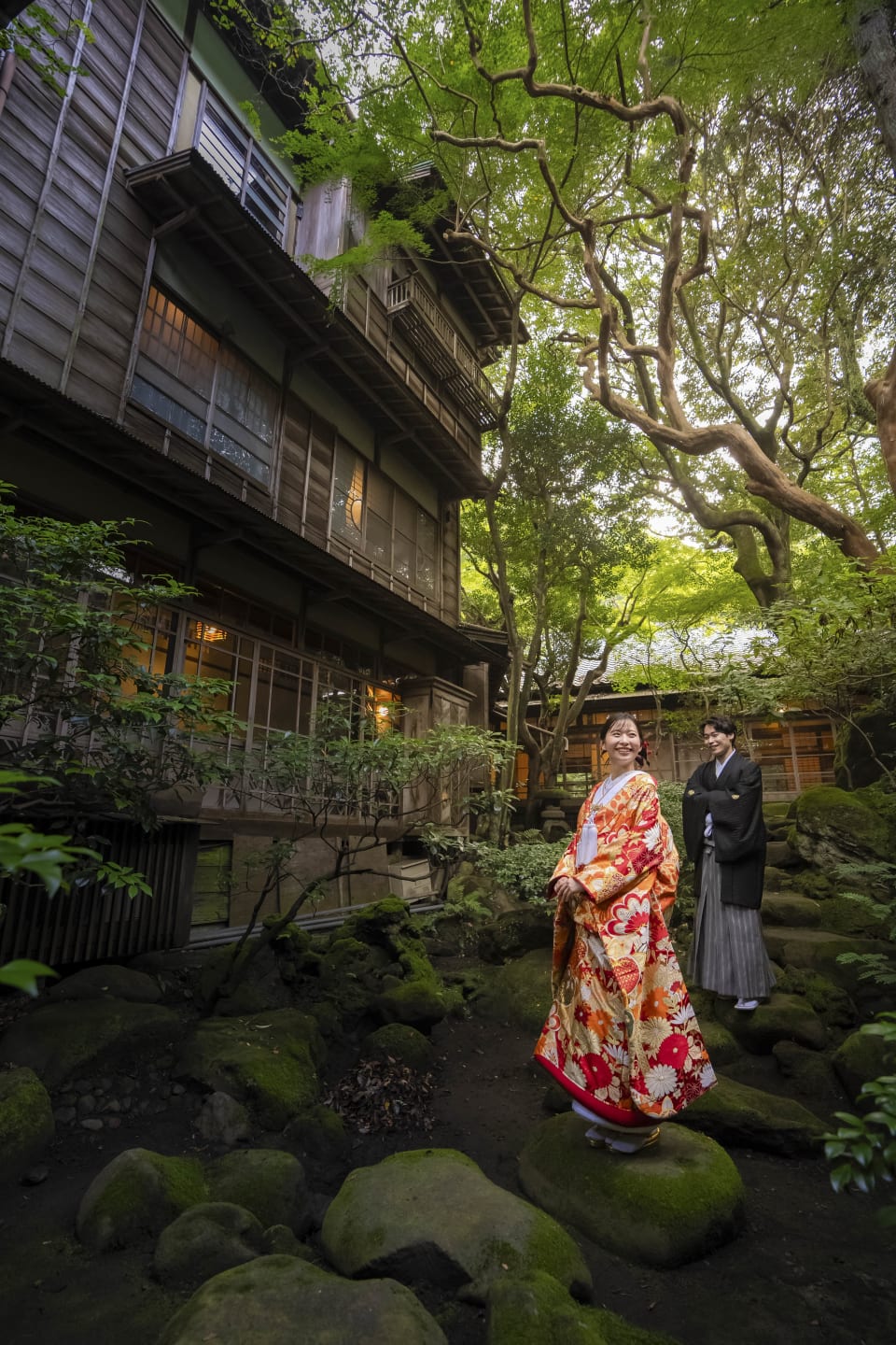 Gora Kadan features refined Japanese aesthetics and a beautifully manicured traditional garden. The luxurious setting creates a stately atmosphere that shines in formal pre-wedding photography, allowing for dramatic and sophisticated imagery.