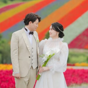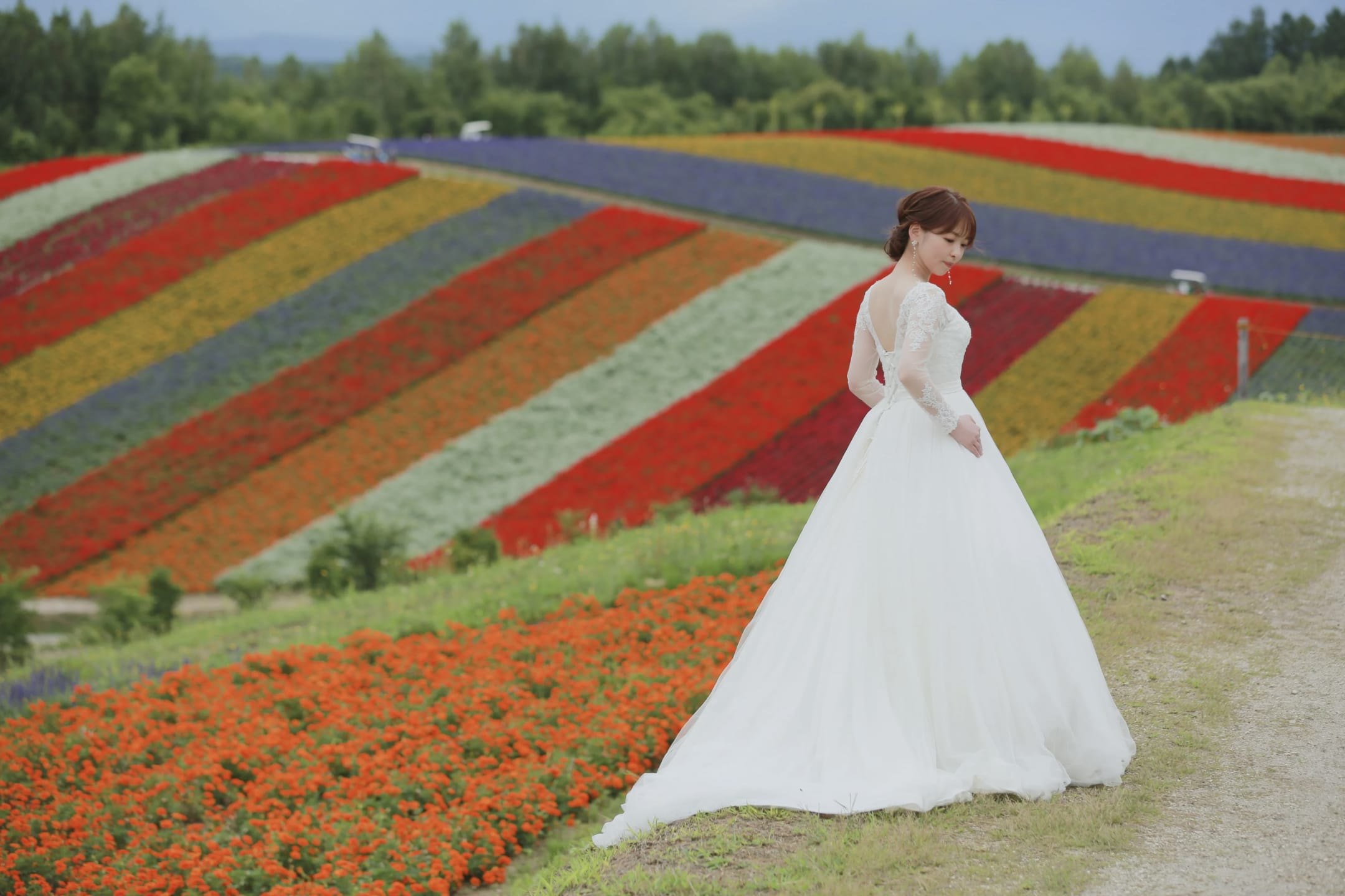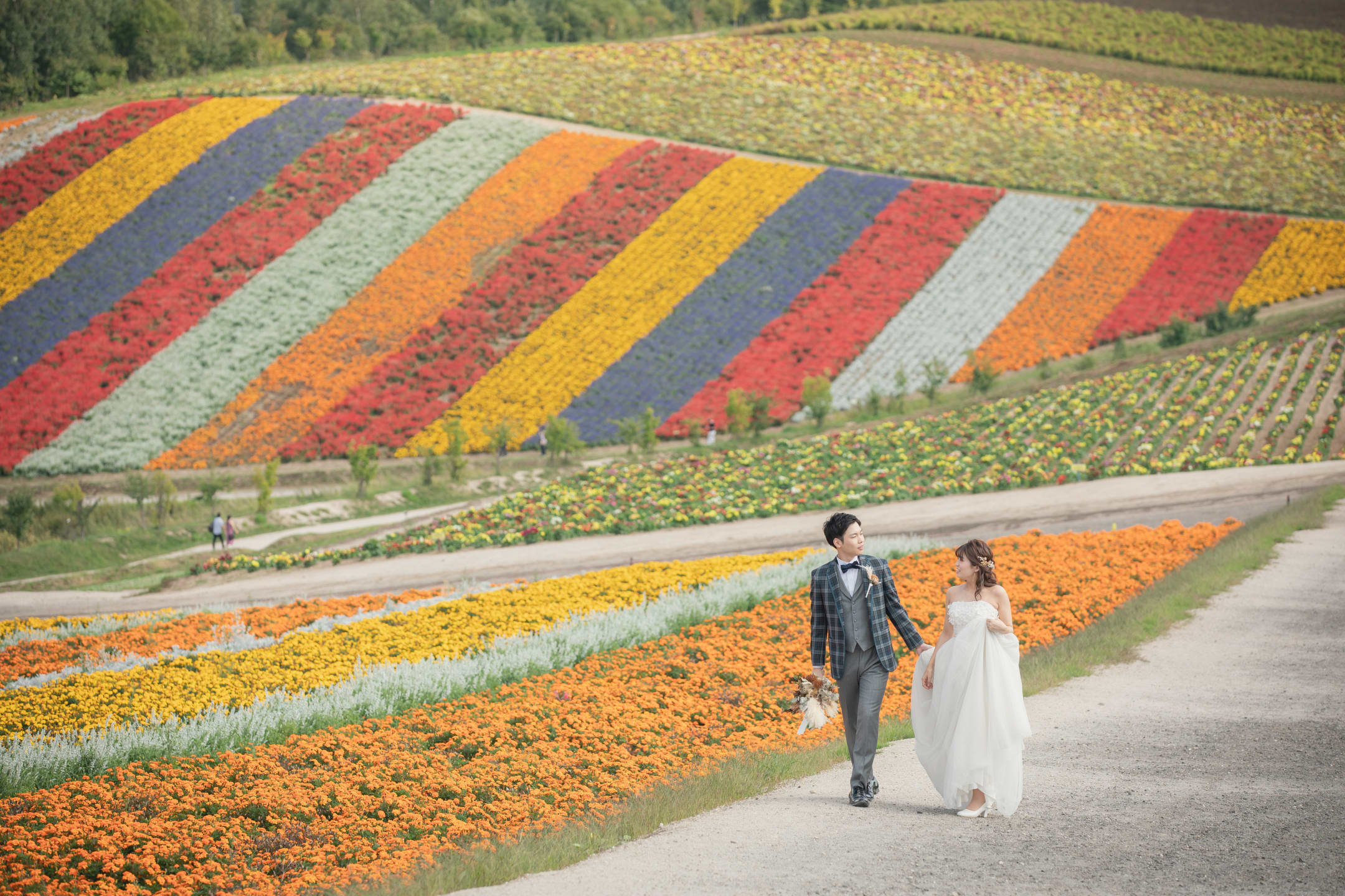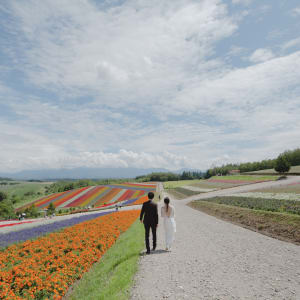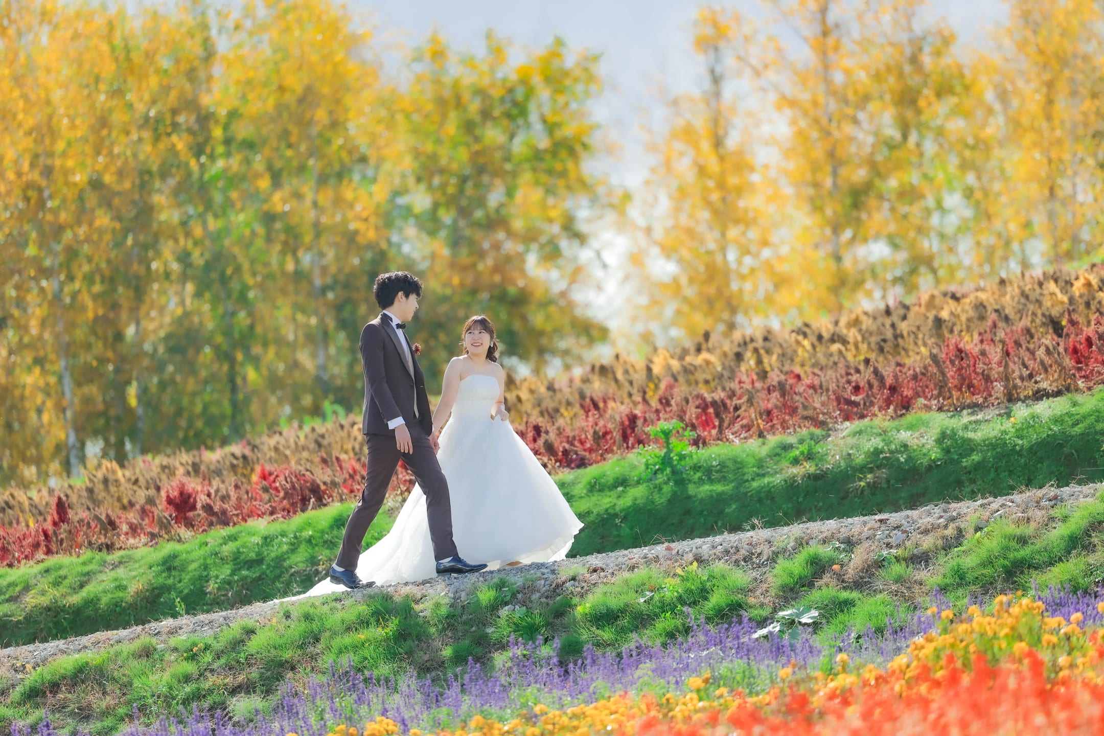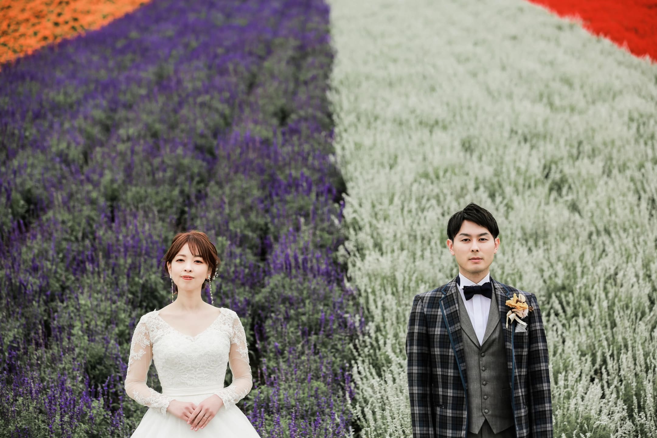 Fields of lavender, the iconic symbol of Hokkaido in summer, create a romantic setting with vibrant purple tones stretching across the landscape. Surrounded by floral fragrance and soft natural light, couples can capture refreshing, seasonally rich pre-wedding portraits.