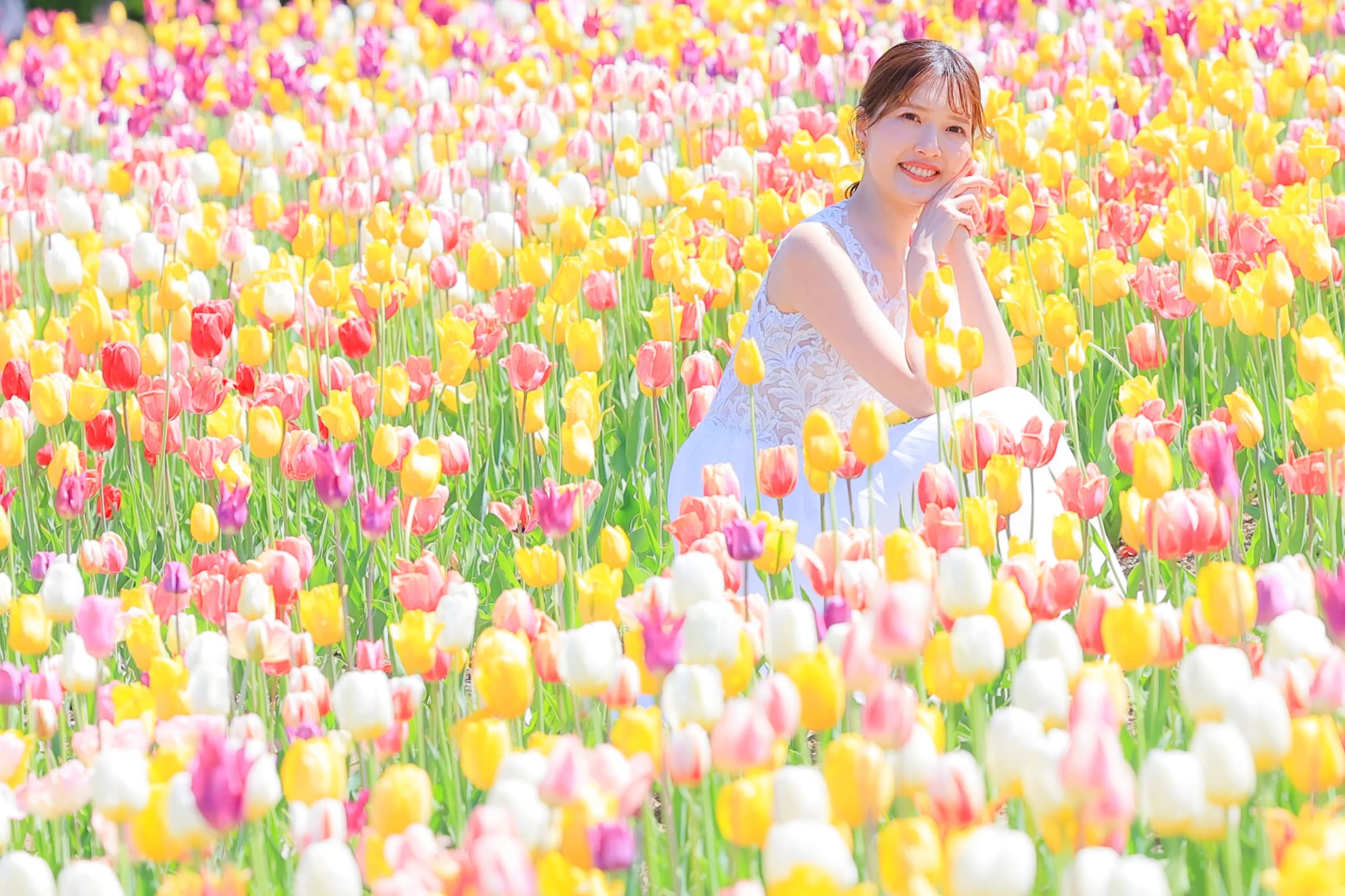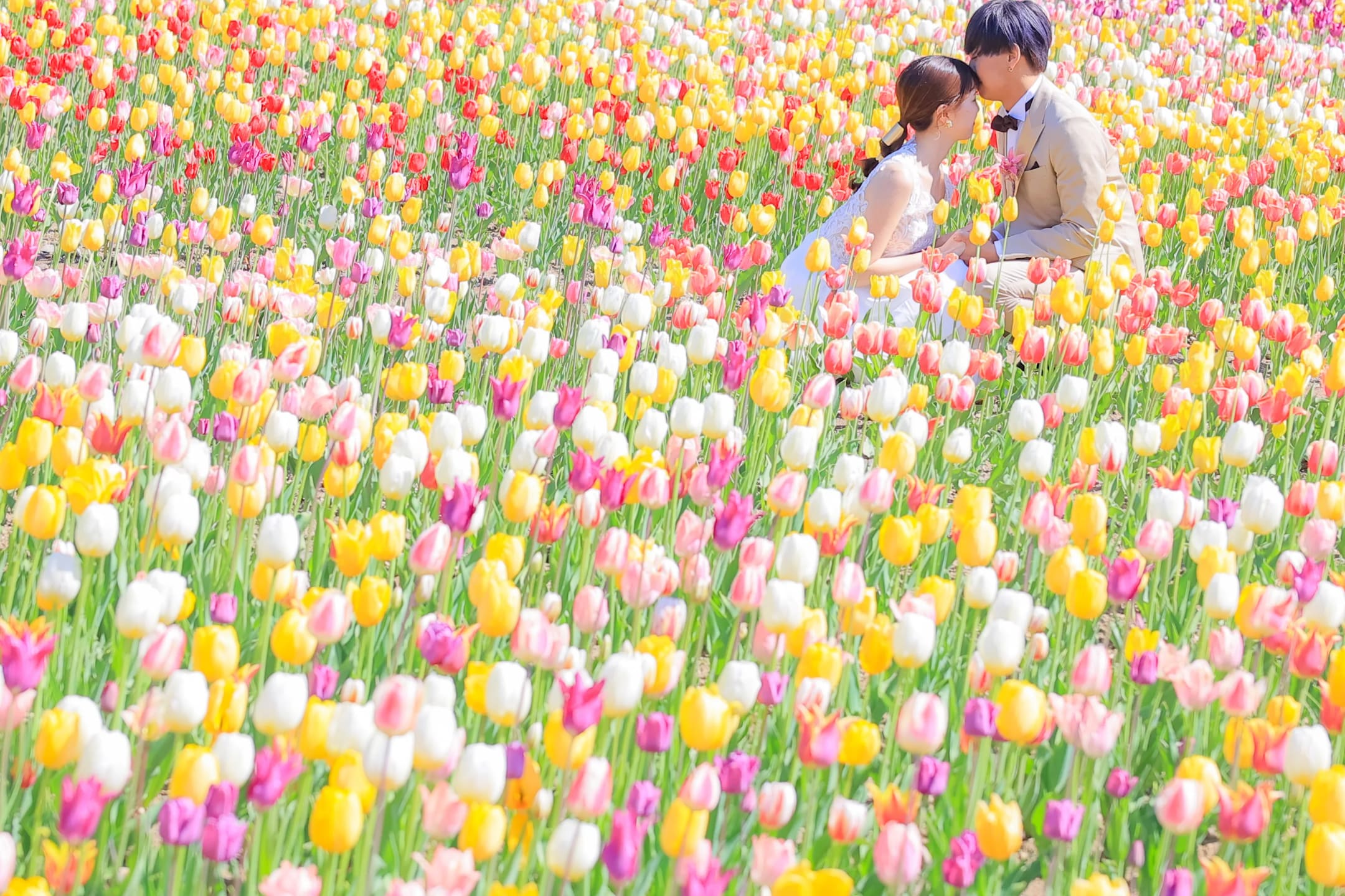This hillside flower field spreads like a colorful palette, creating a vivid and popular scenic location. The expansive hills and multicolored blossoms harmonize to produce dramatic and glamorous wedding photography.