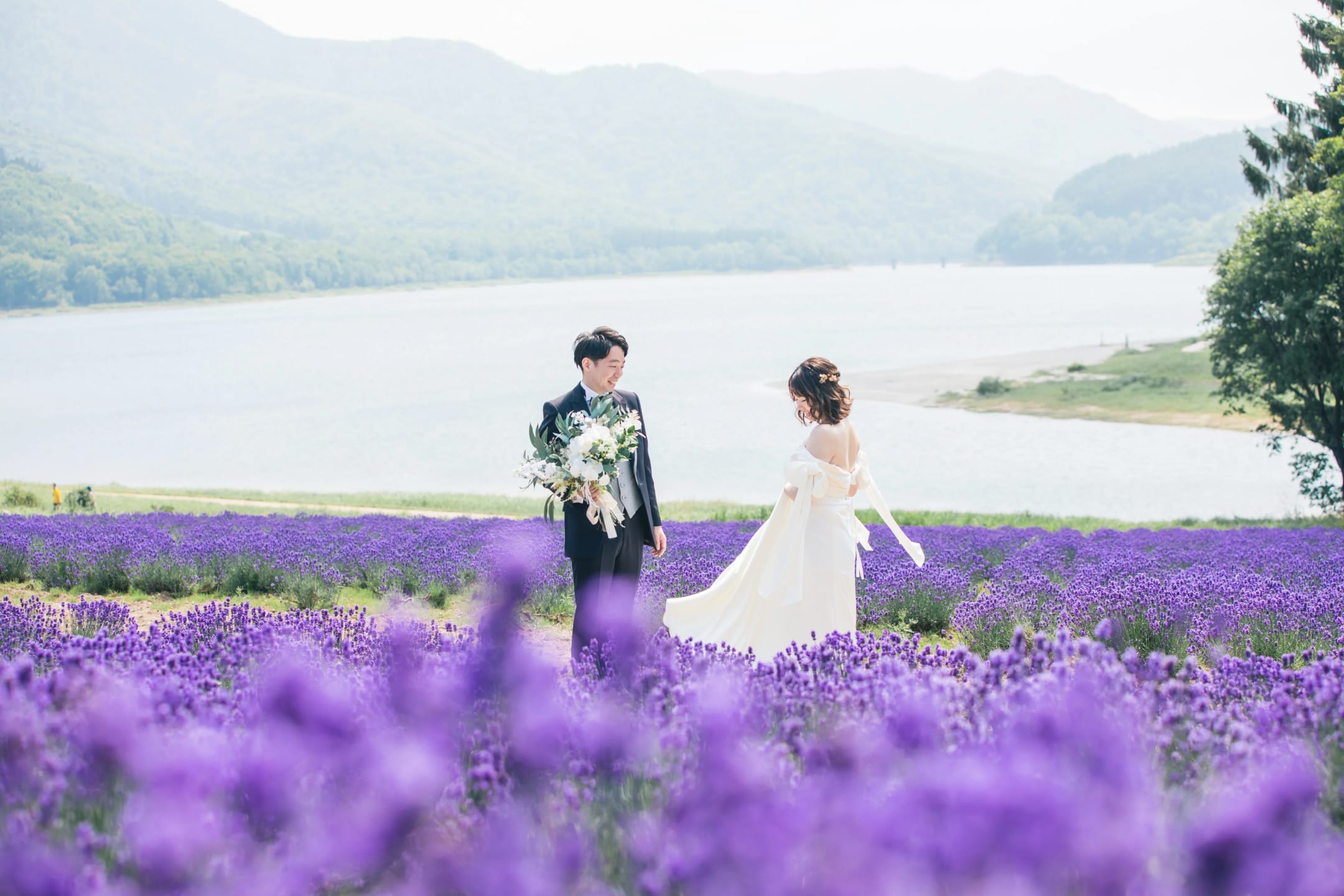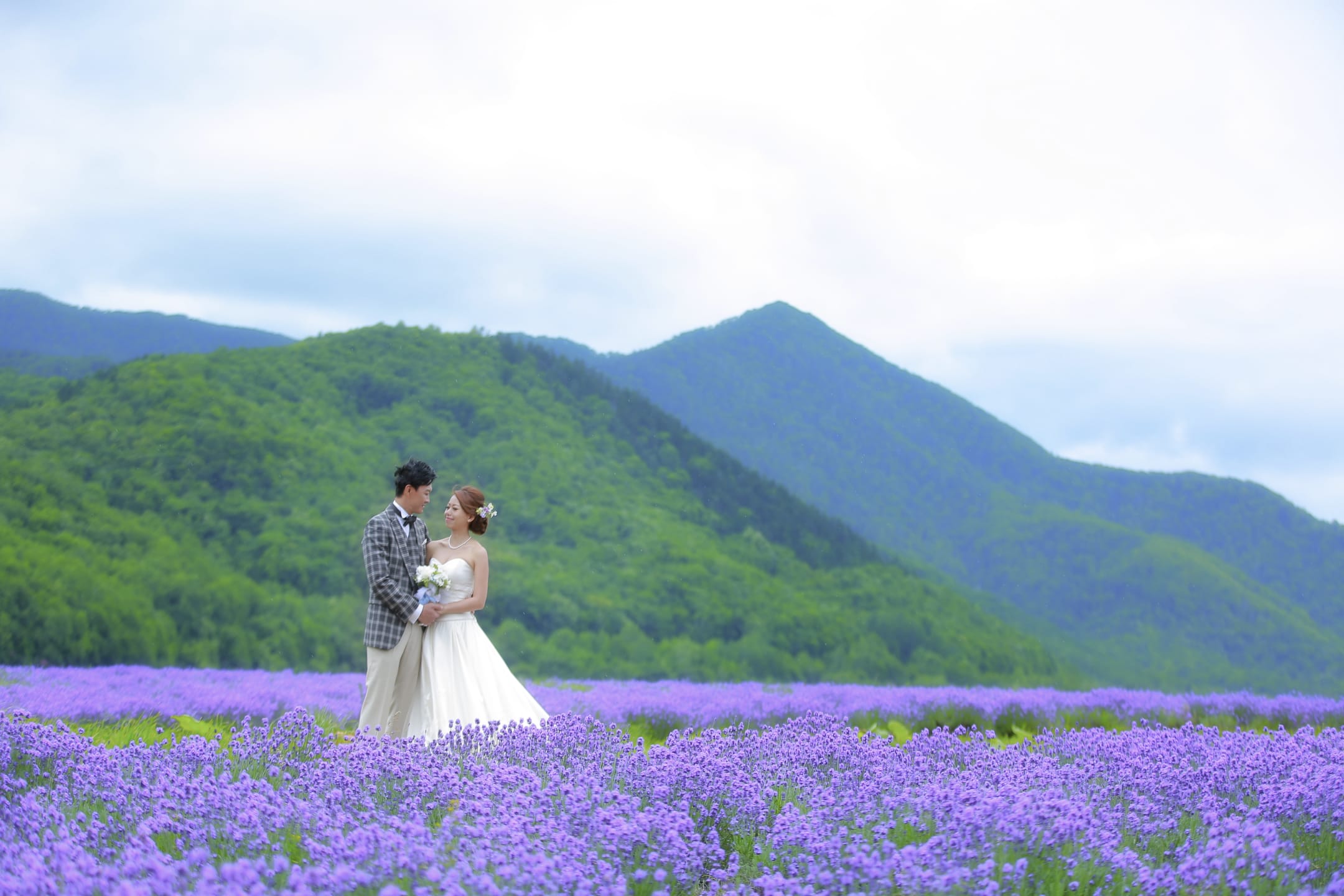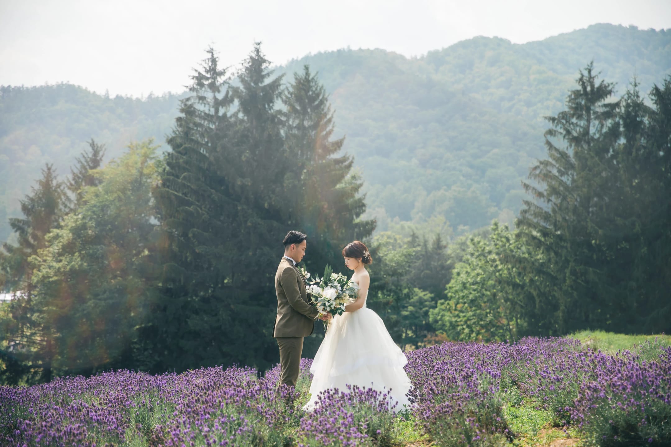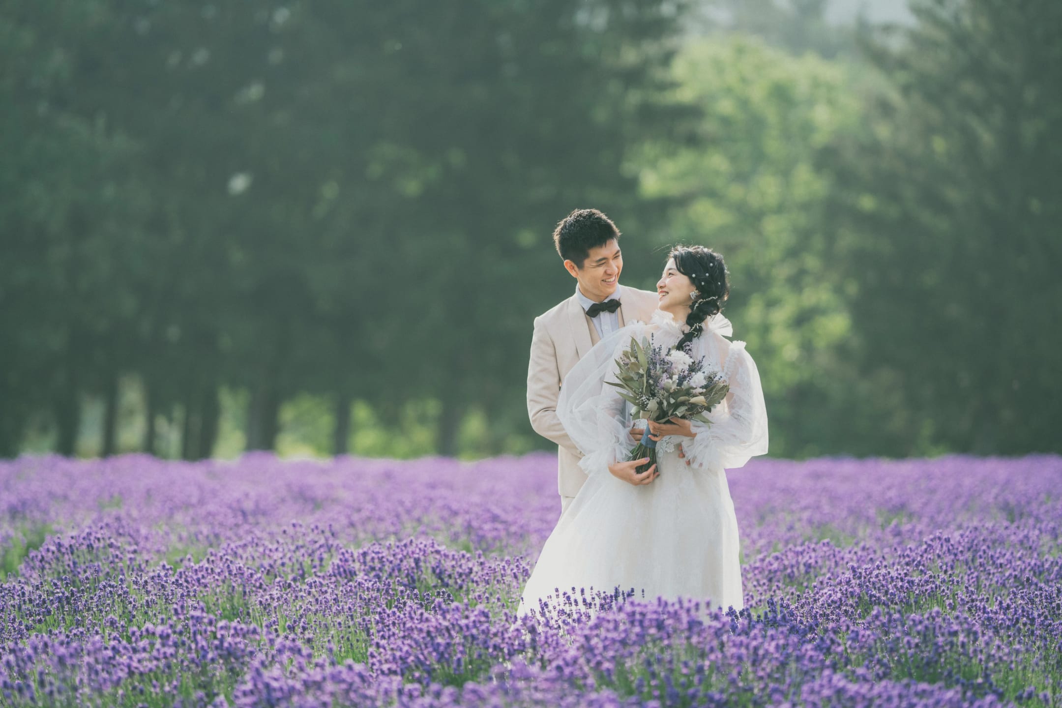 Fields of lavender, the iconic symbol of Hokkaido in summer, create a romantic setting with vibrant purple tones stretching across the landscape. Surrounded by floral fragrance and soft natural light, couples can capture refreshing, seasonally rich pre-wedding portraits.