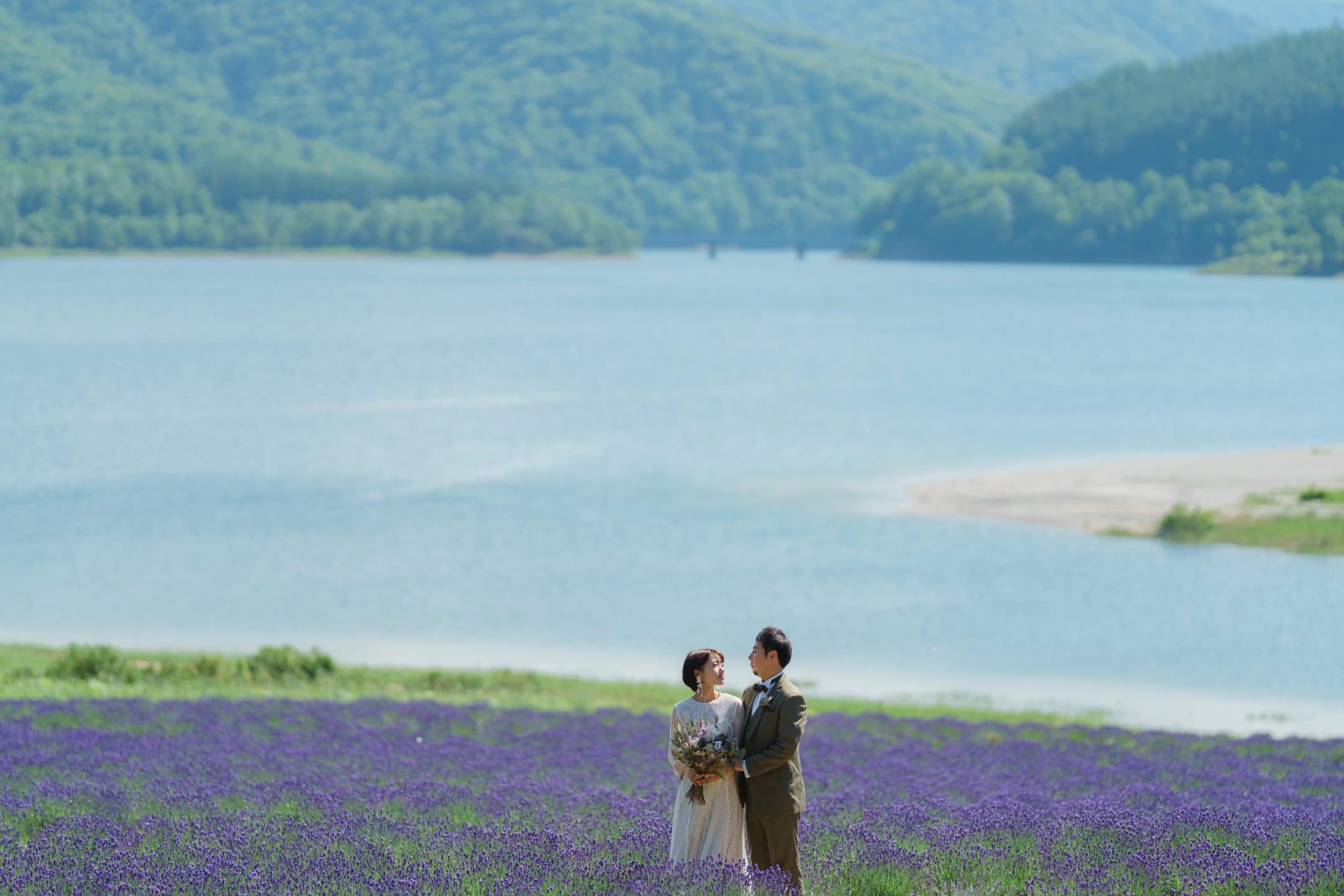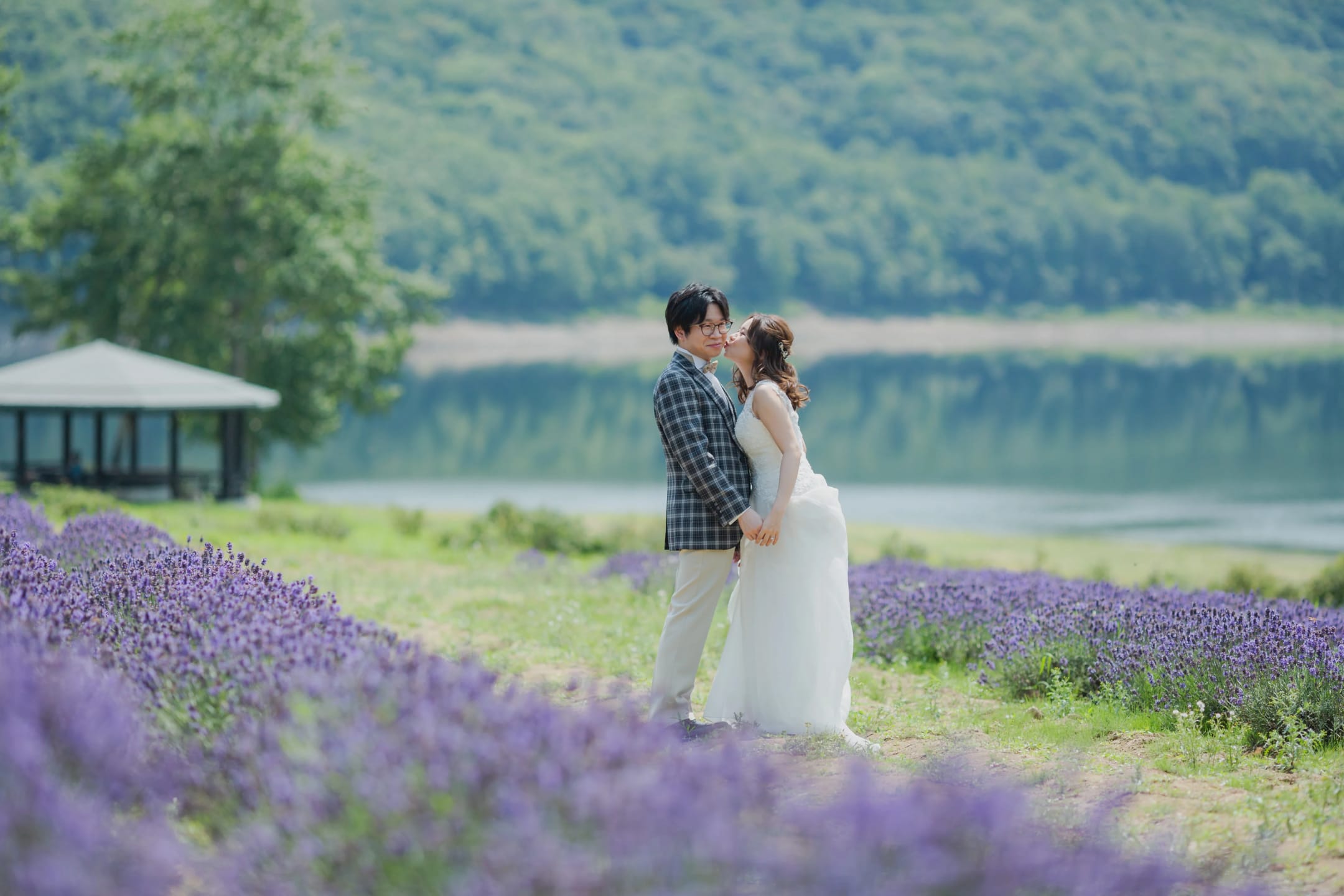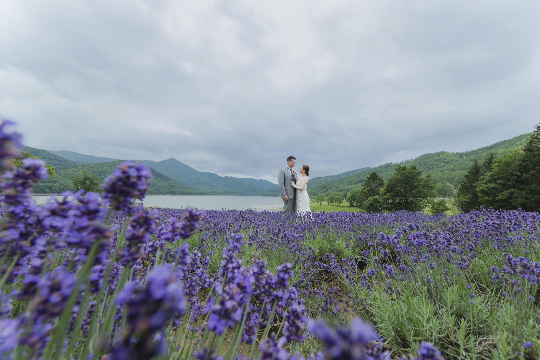 Fields of lavender, the iconic symbol of Hokkaido in summer, create a romantic setting with vibrant purple tones stretching across the landscape. Surrounded by floral fragrance and soft natural light, couples can capture refreshing, seasonally rich pre-wedding portraits.
