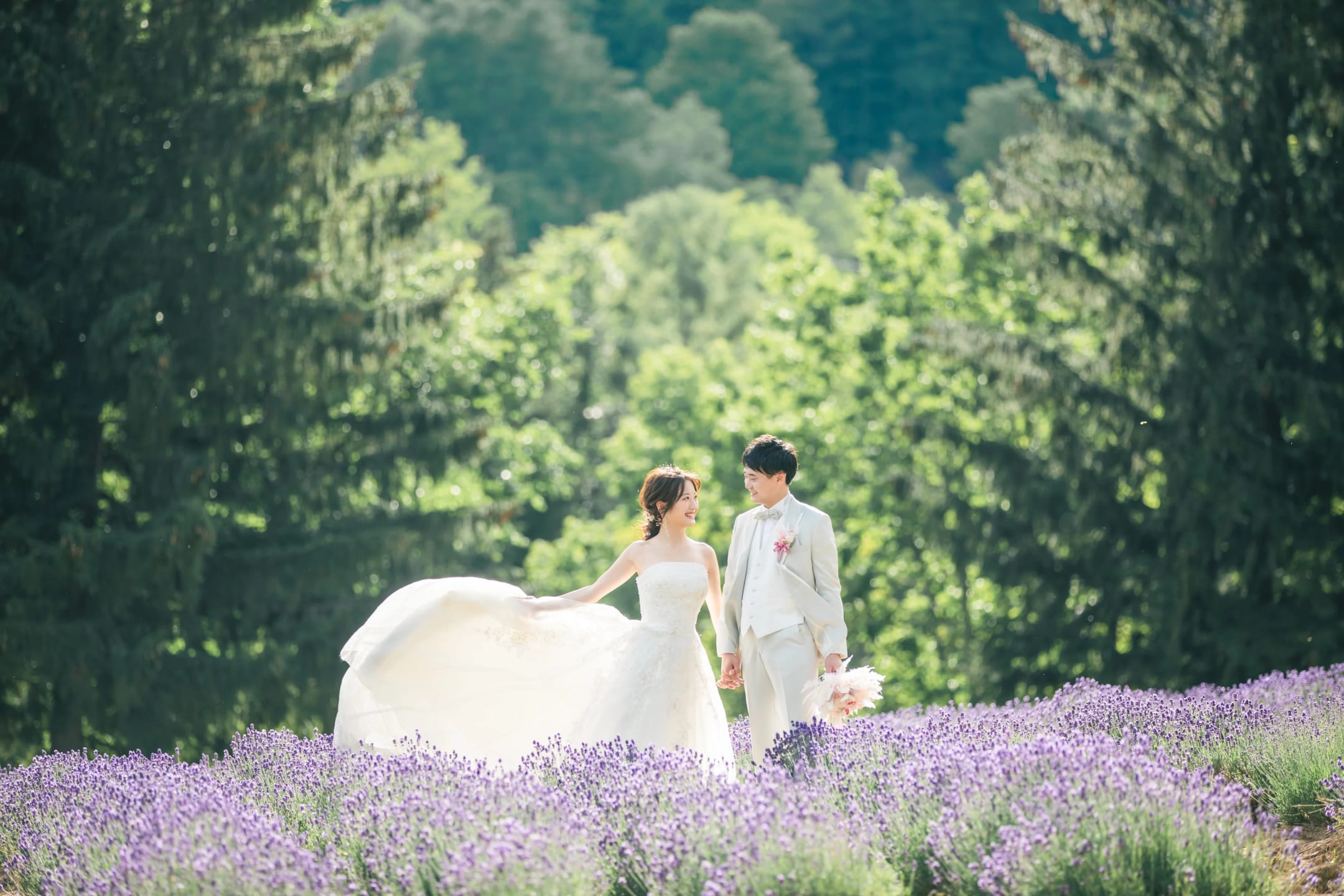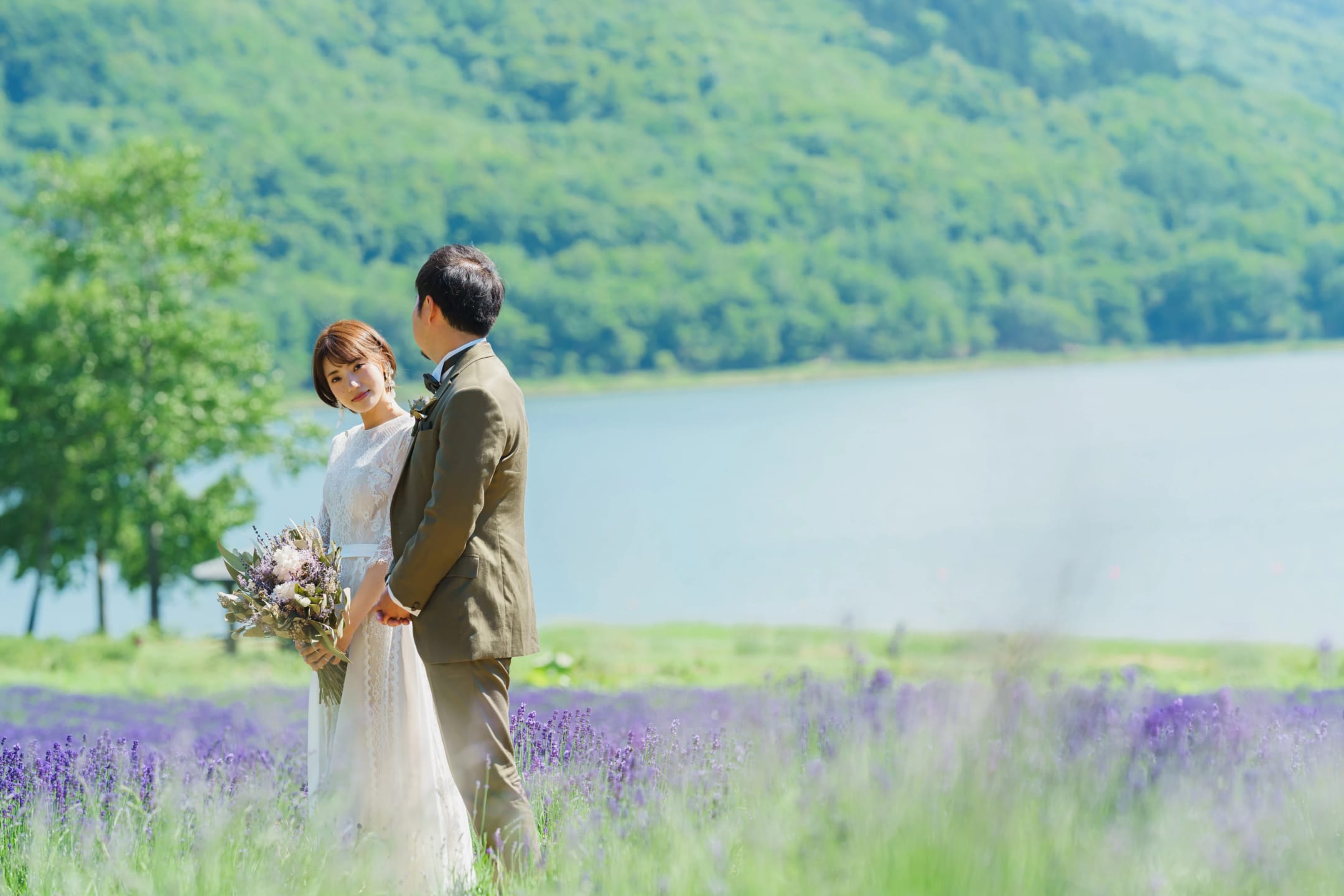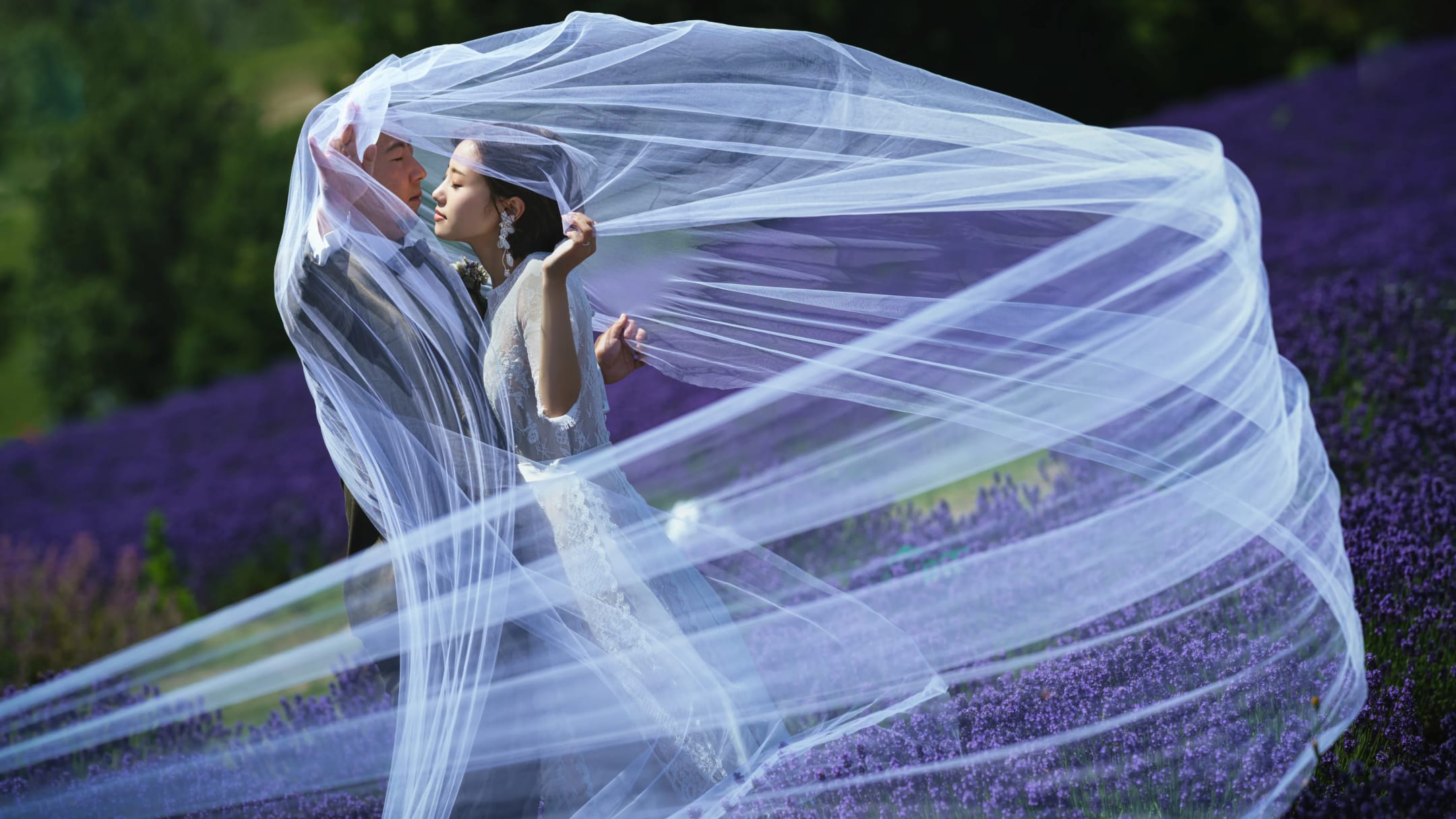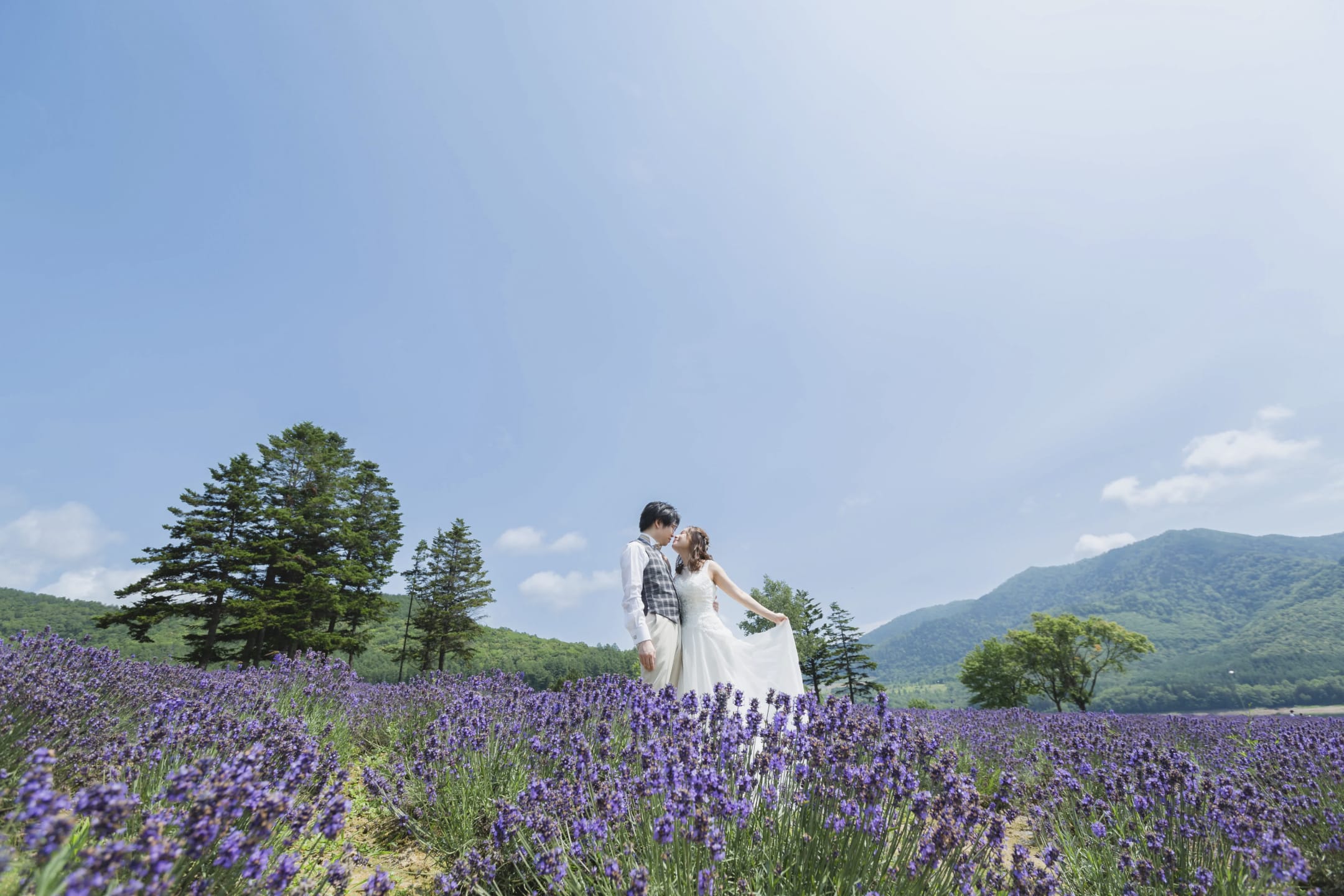 Fields of lavender, the iconic symbol of Hokkaido in summer, create a romantic setting with vibrant purple tones stretching across the landscape. Surrounded by floral fragrance and soft natural light, couples can capture refreshing, seasonally rich pre-wedding portraits.