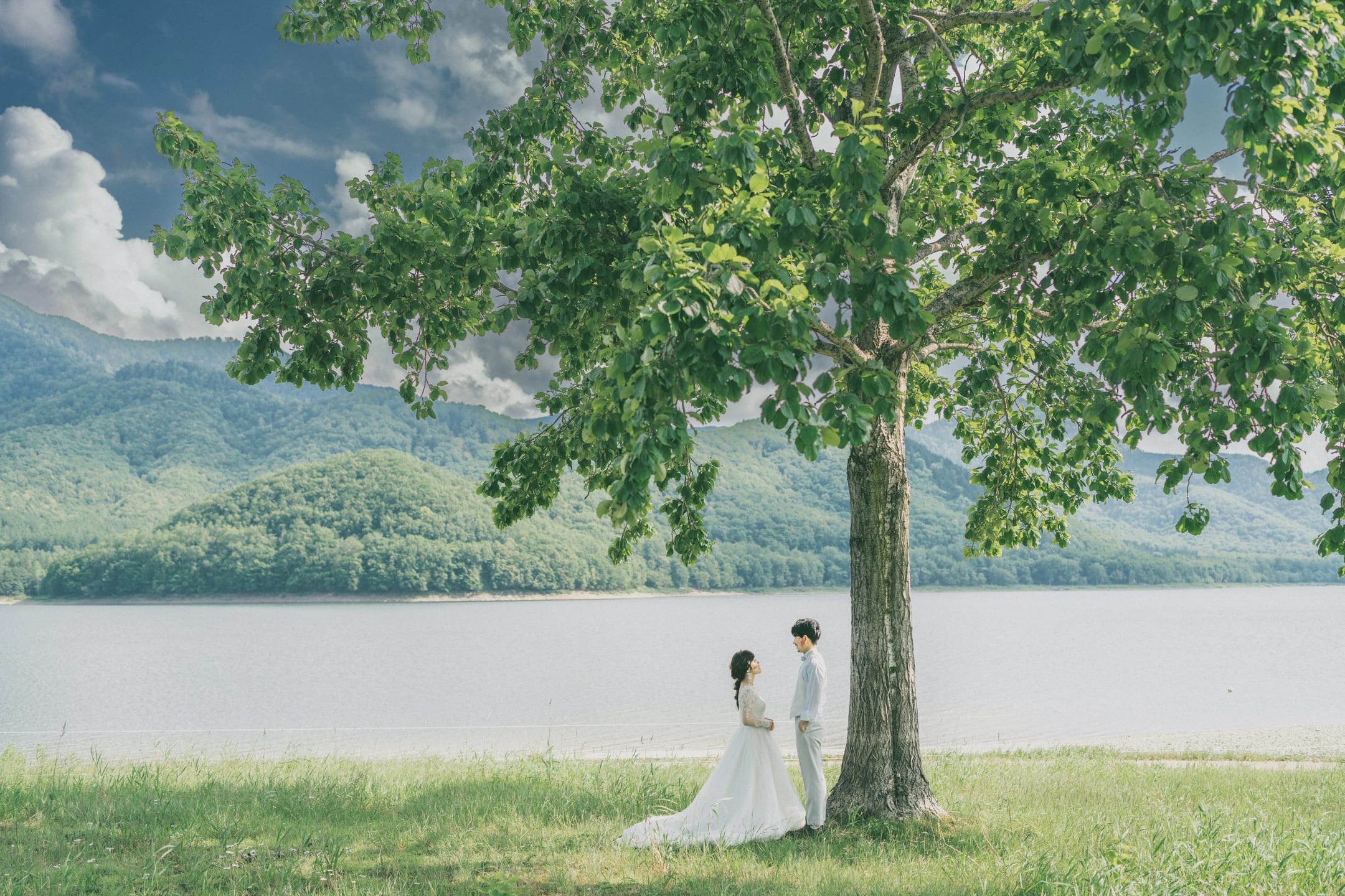 The calm water surface of the lake and the surrounding forest produce a beautiful contrast. In this peaceful environment, couples can capture poetic, elegant reflection photography.