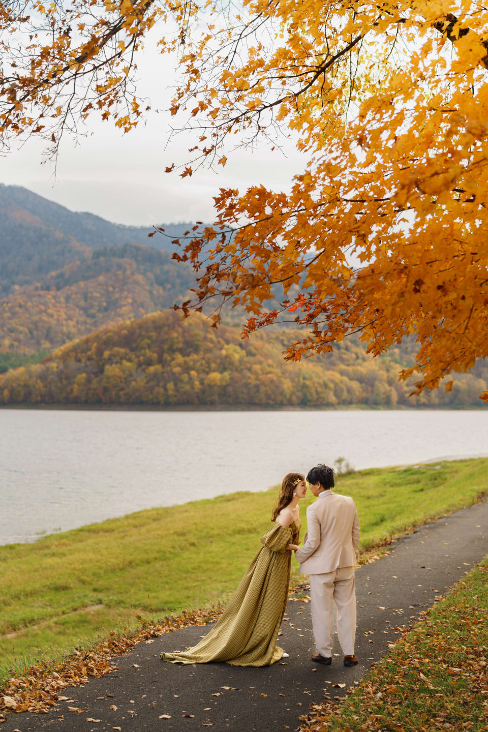 The calm water surface of the lake and the surrounding forest produce a beautiful contrast. In this peaceful environment, couples can capture poetic, elegant reflection photography.