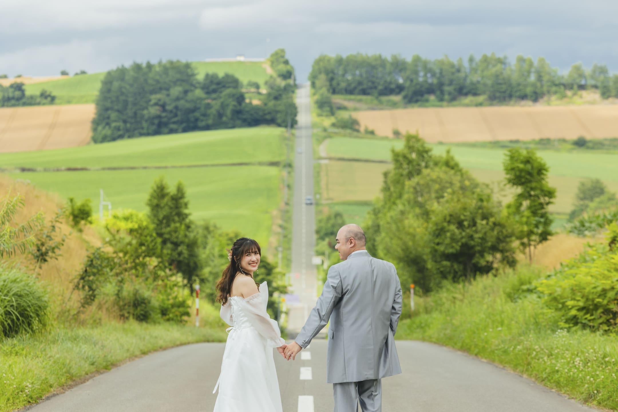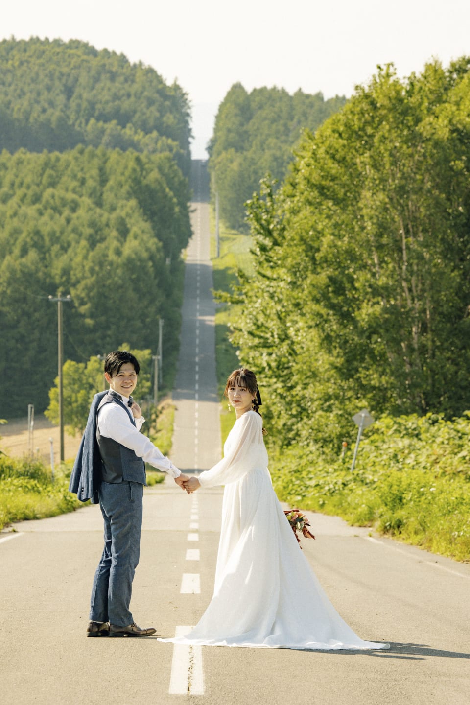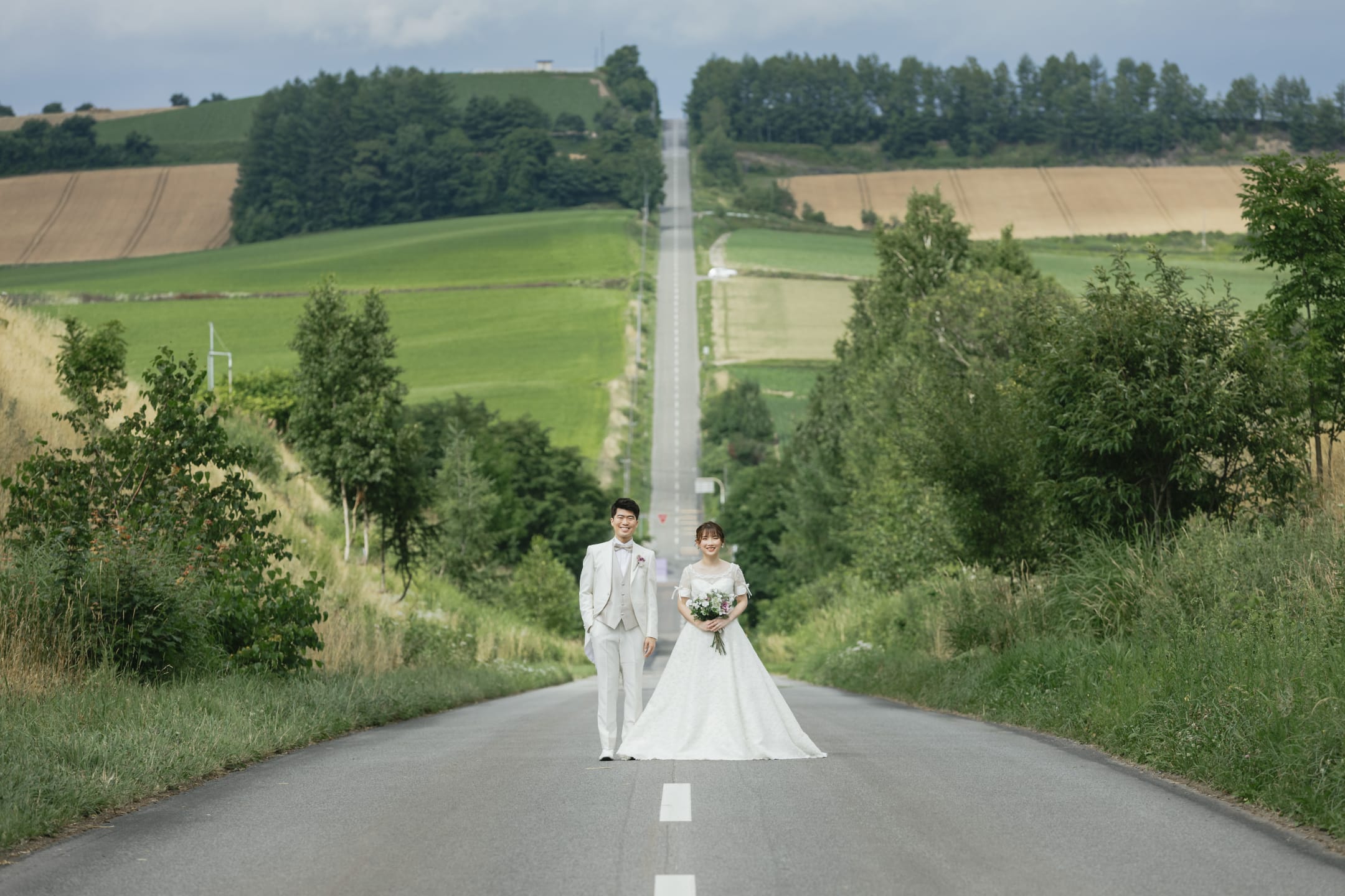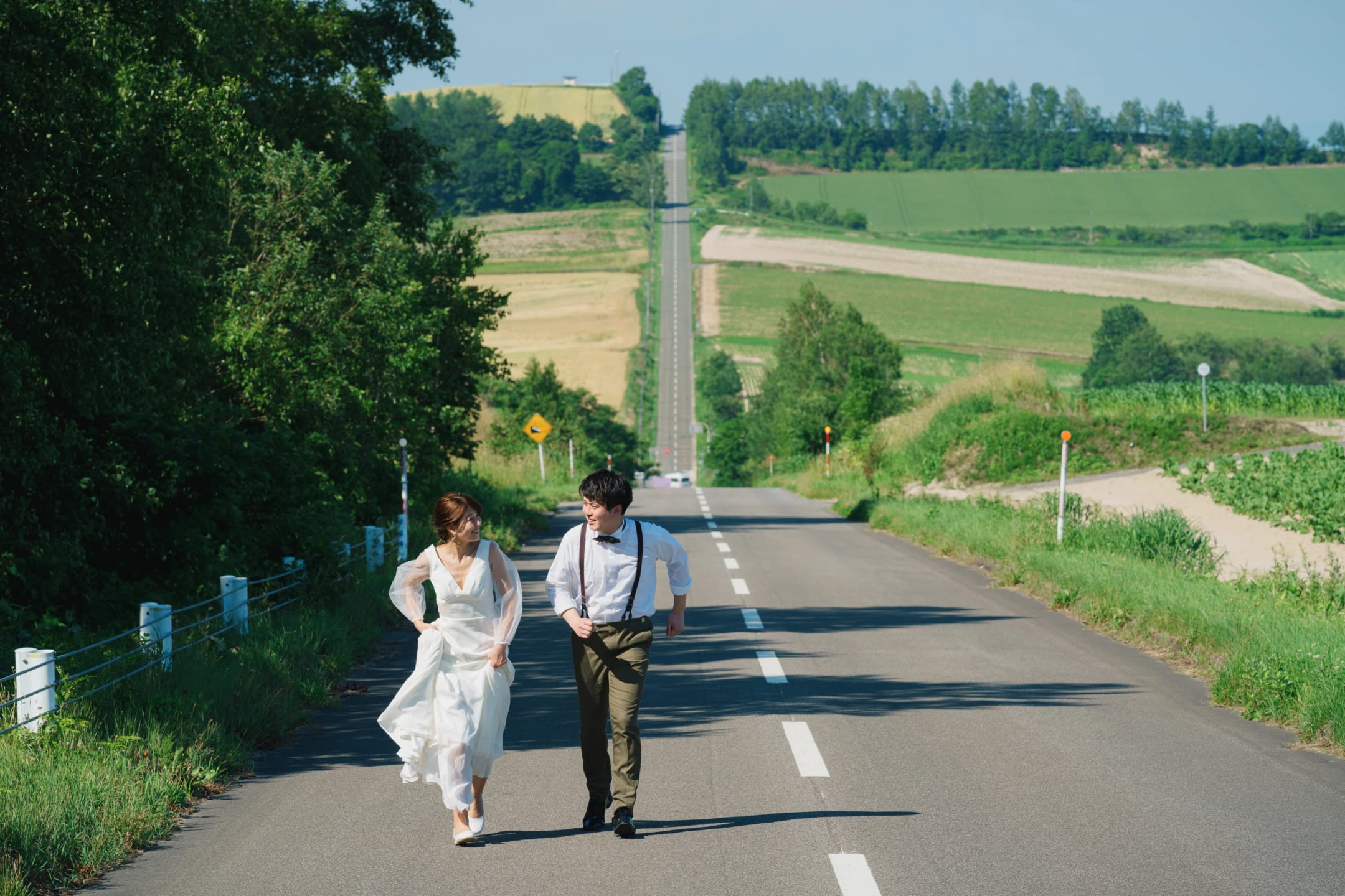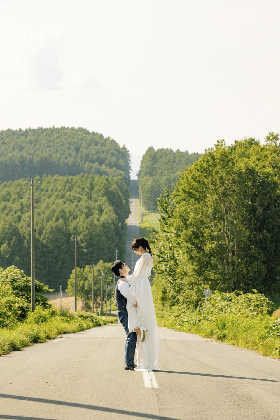 A straight, undulating road creates a grand, cinematic perspective typical of Hokkaido. This dynamic setting enables powerful pre-wedding photography reminiscent of a movie scene.