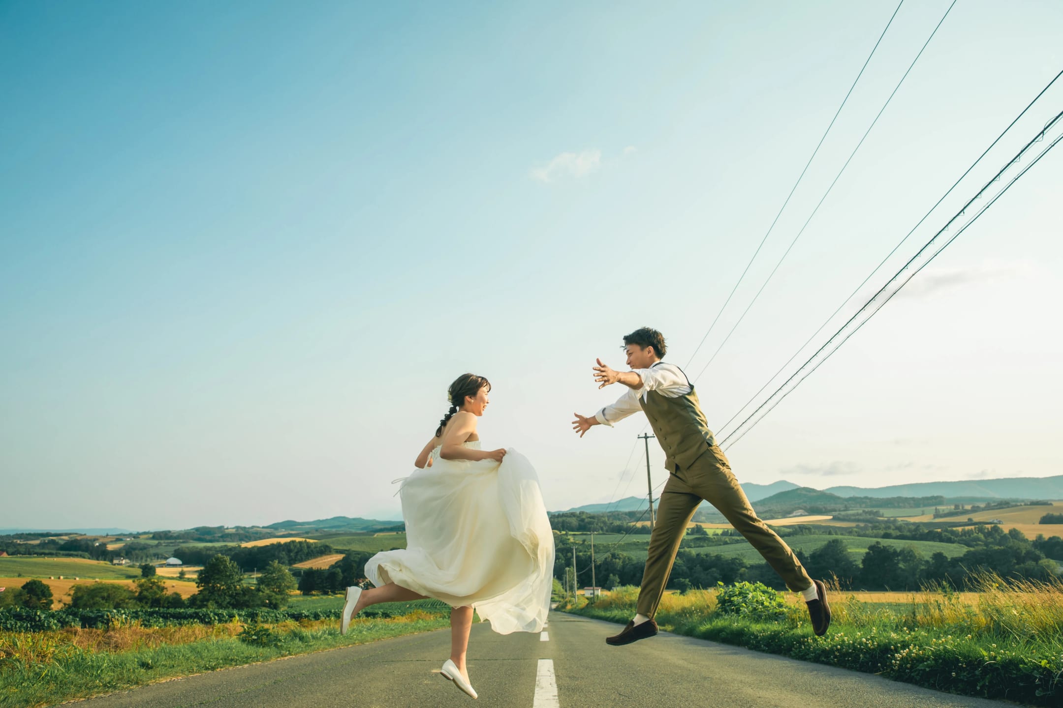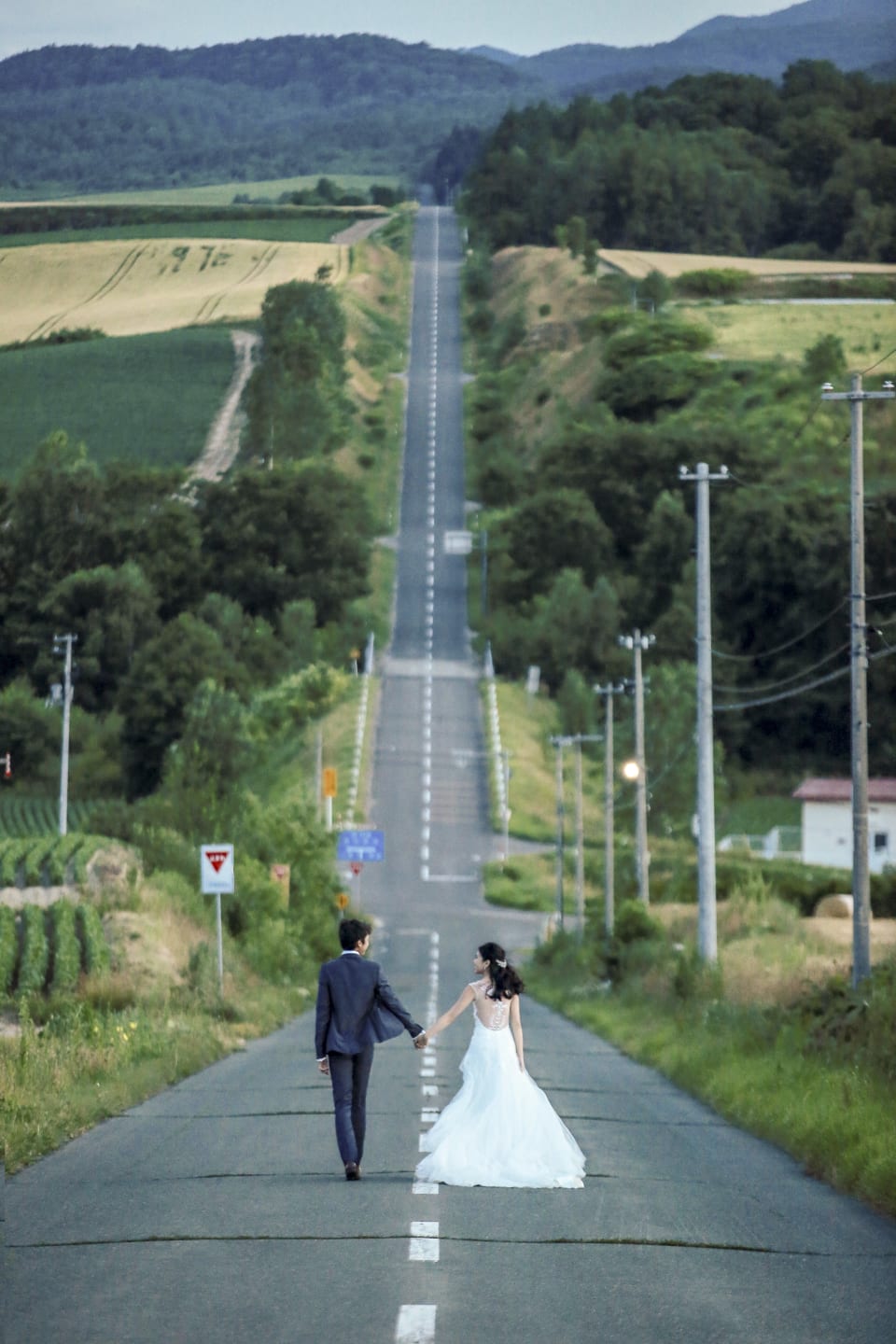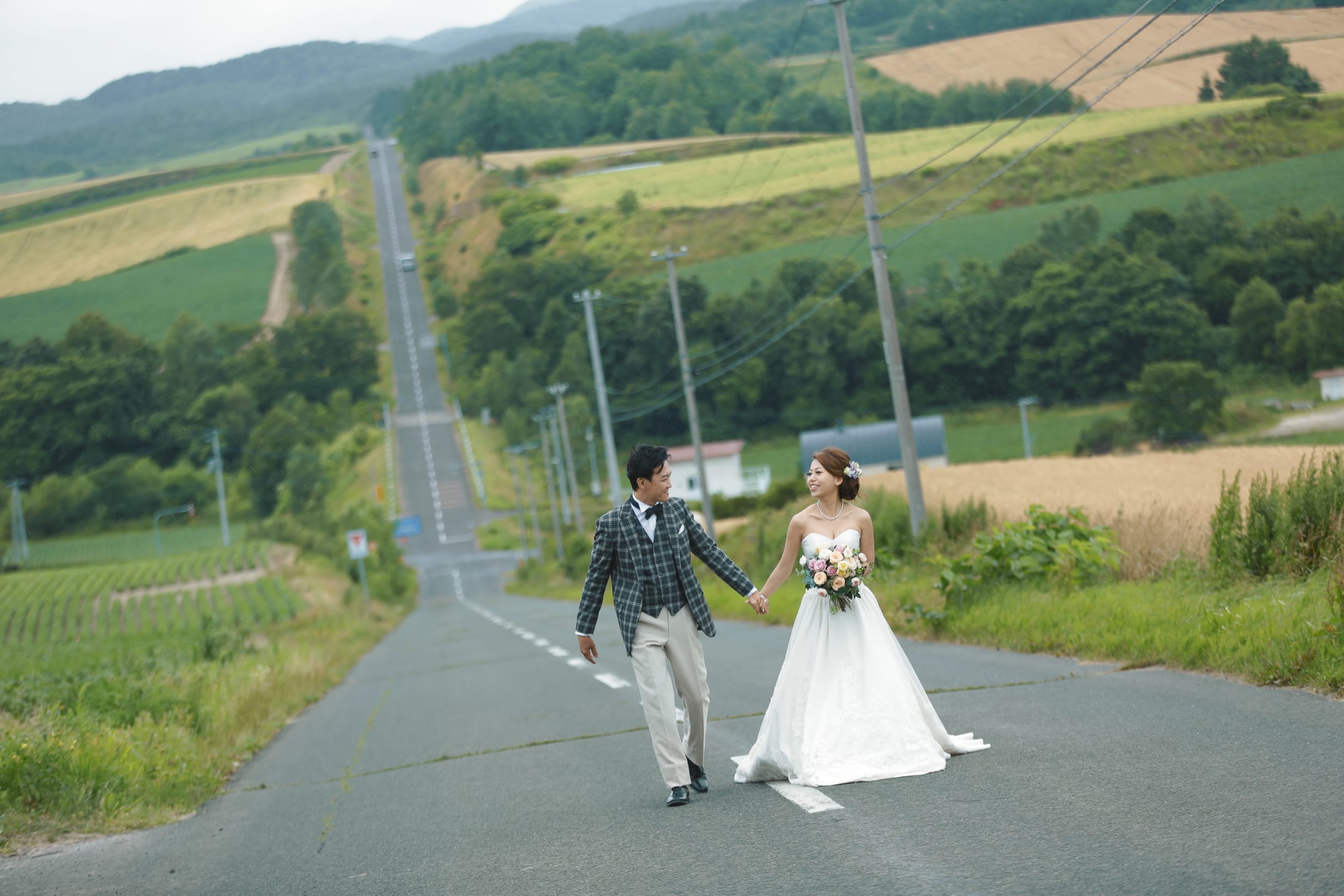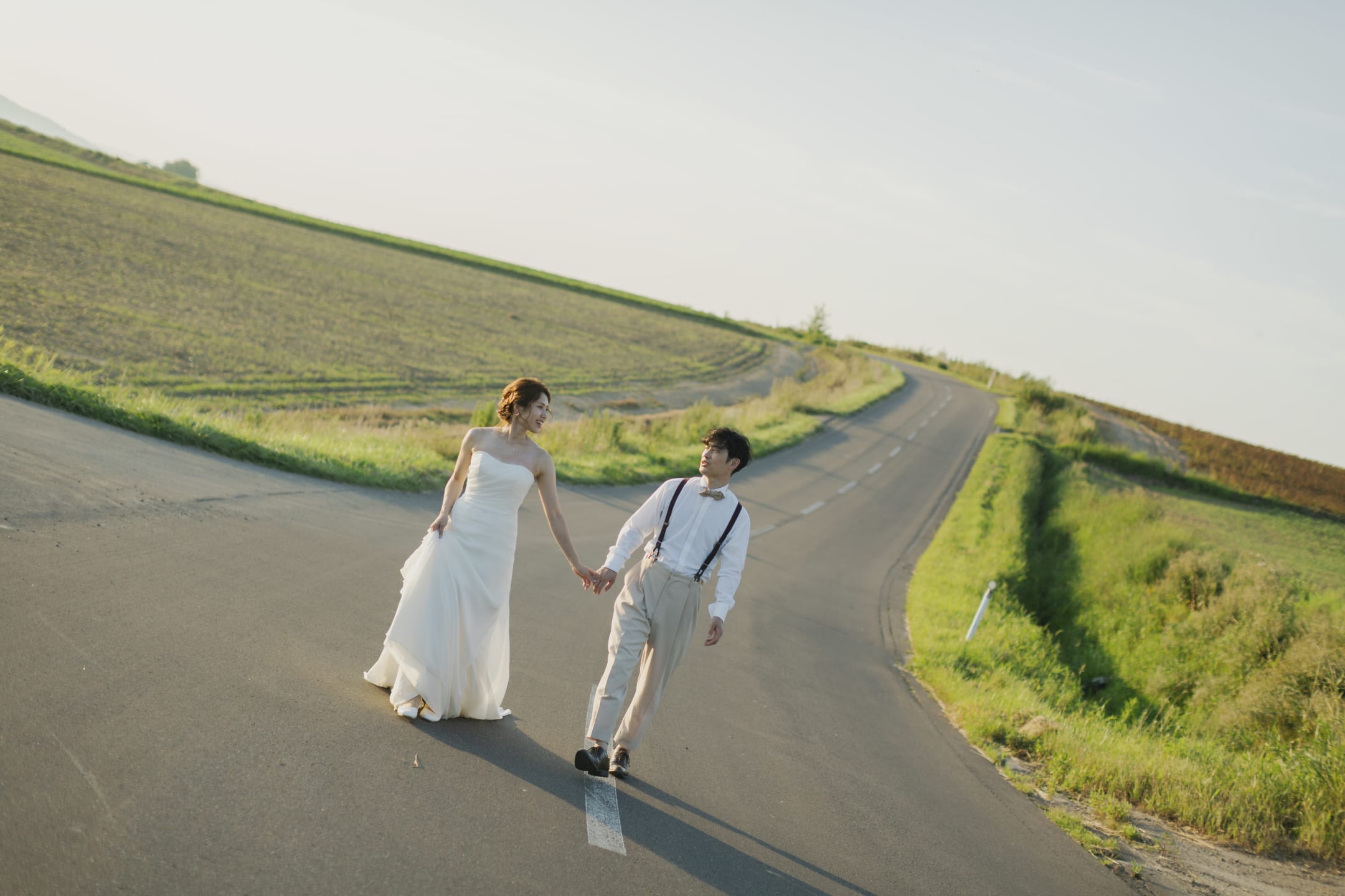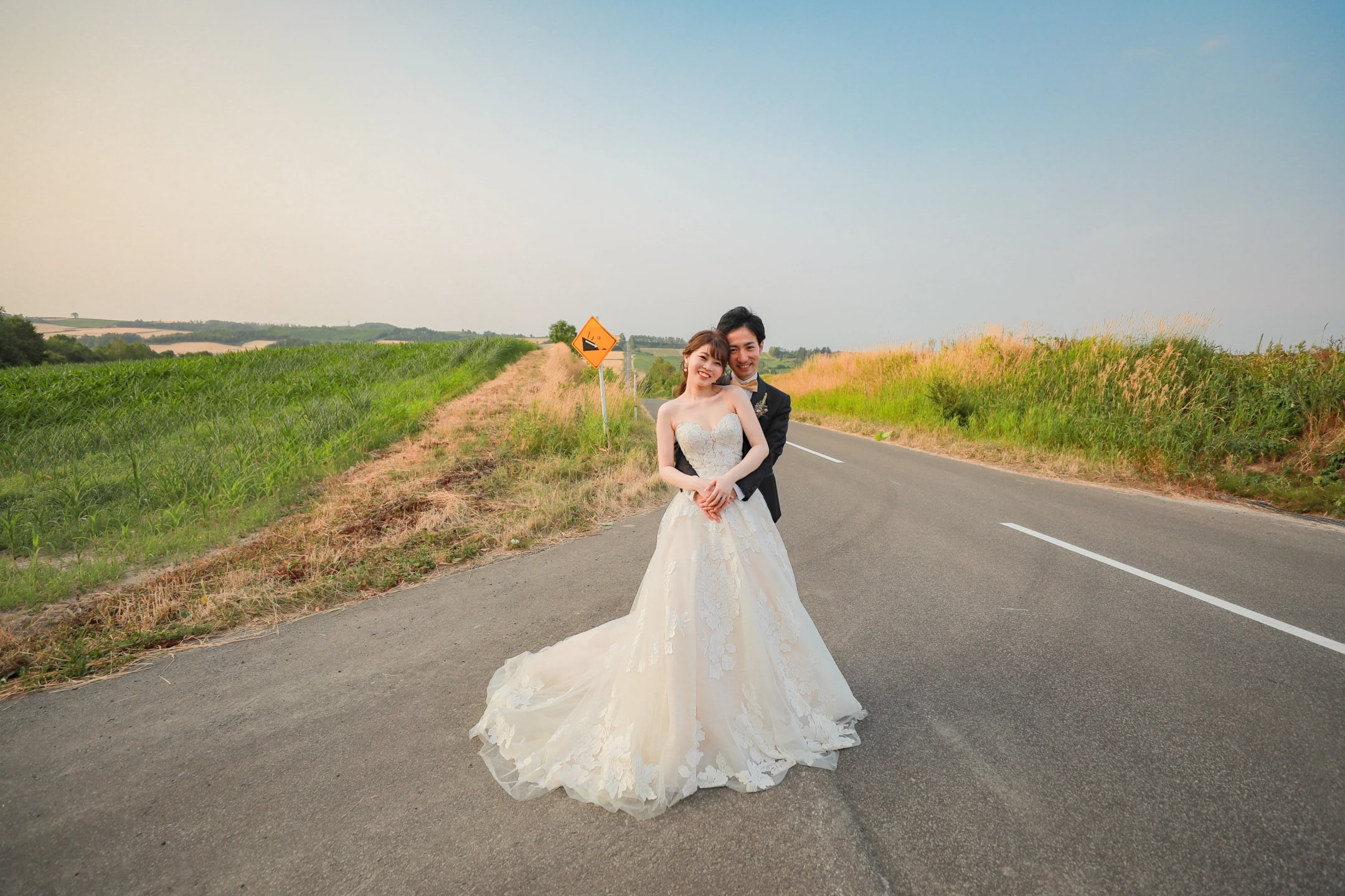 A straight, undulating road creates a grand, cinematic perspective typical of Hokkaido. This dynamic setting enables powerful pre-wedding photography reminiscent of a movie scene.