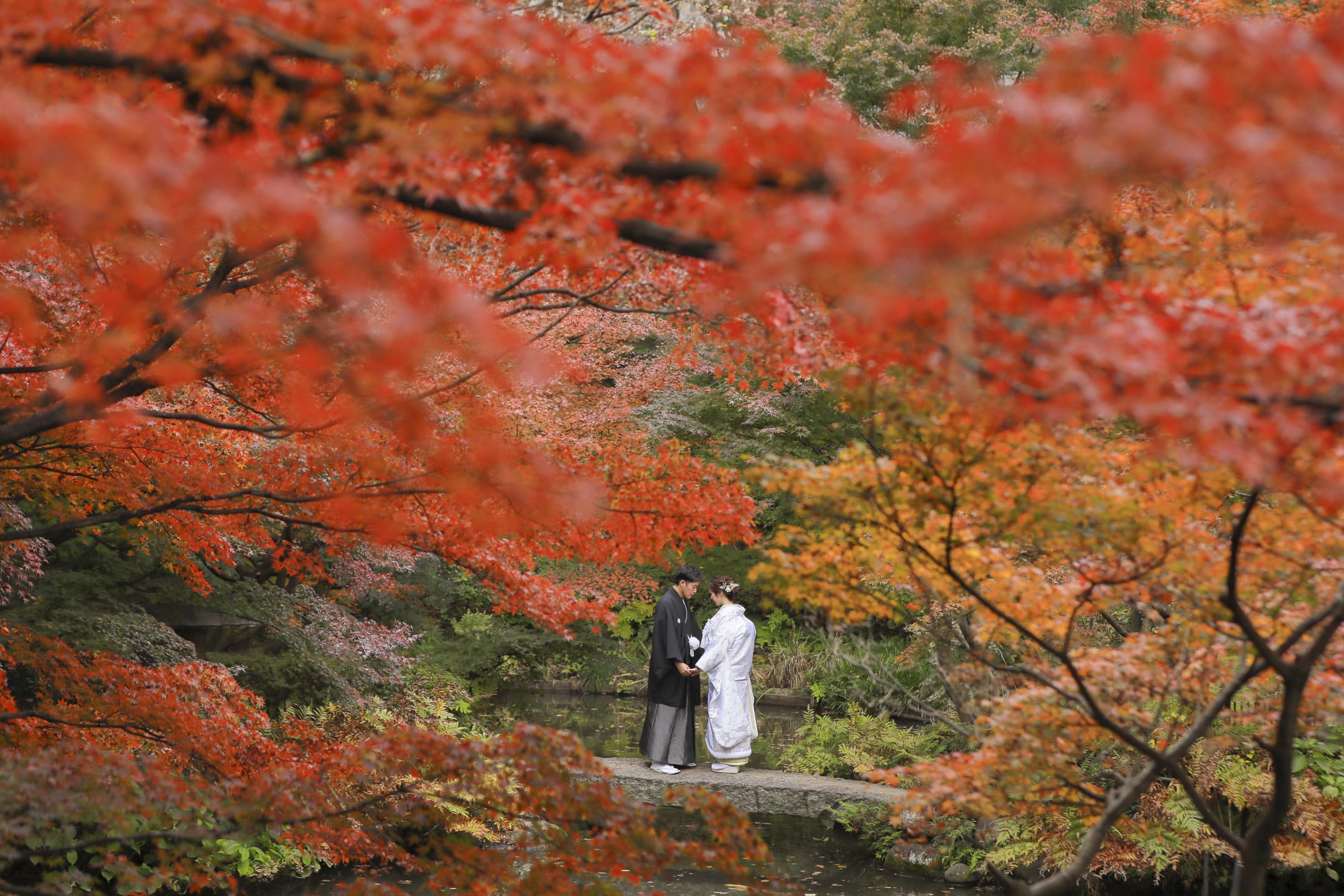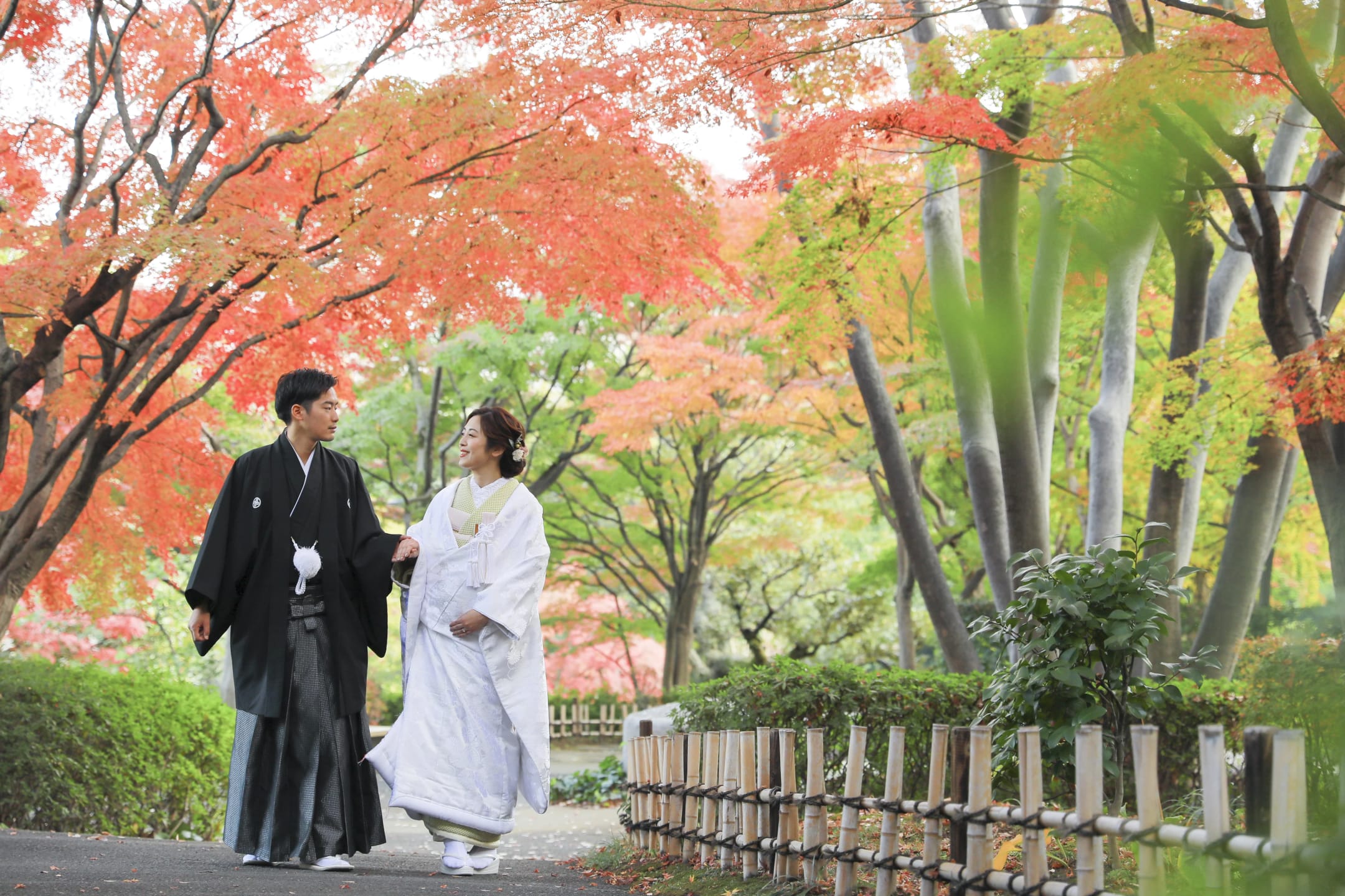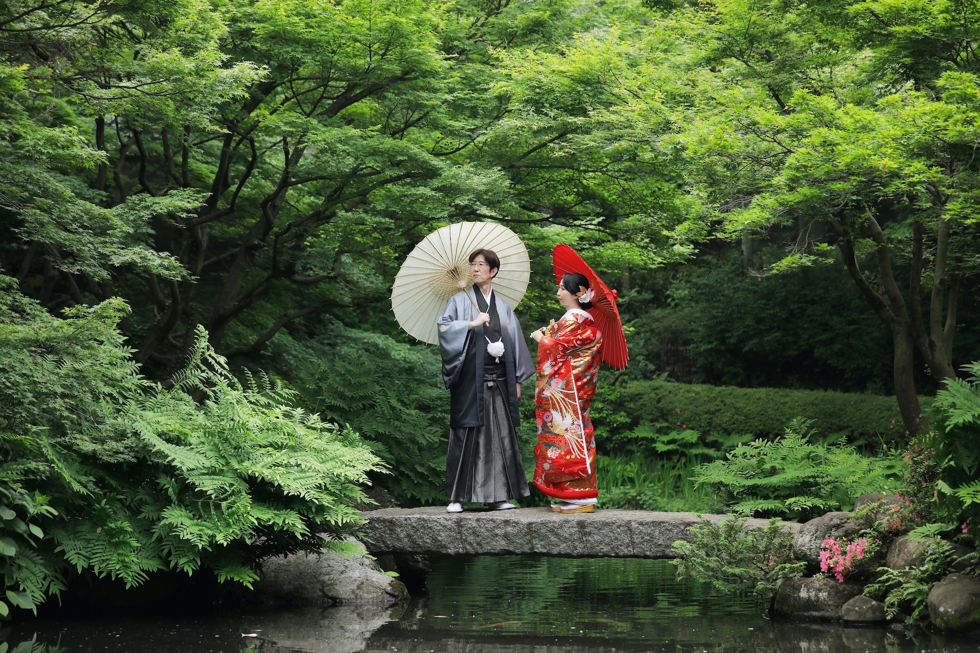 Ikedayama Park features lush greenery, tree tunnels, and a serene Japanese garden. The seasonal transitions create calm, softly lit photo settings suitable for both traditional and Western attire.