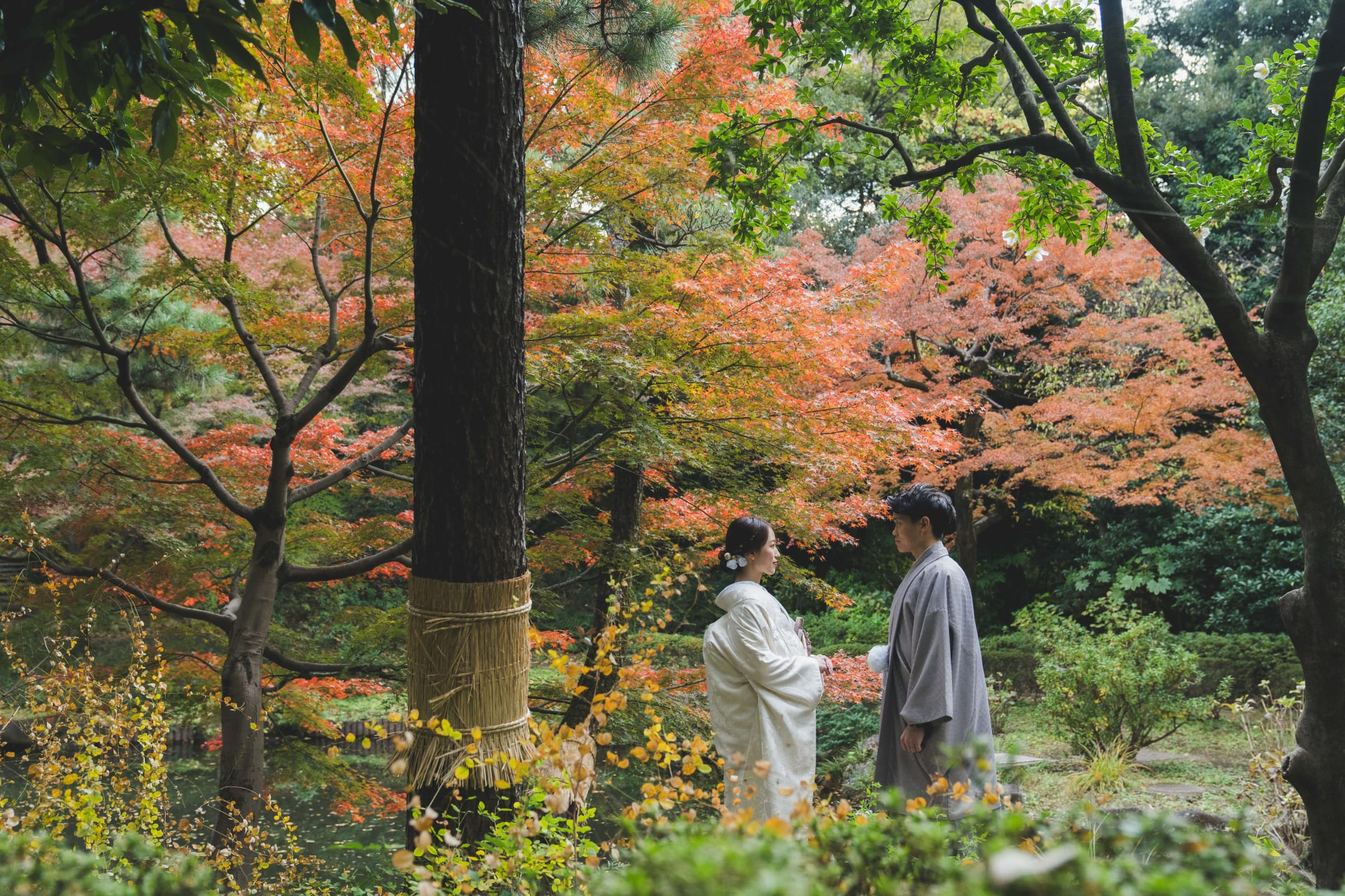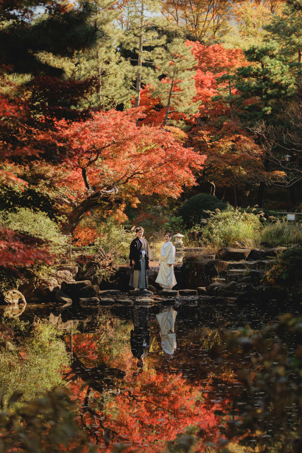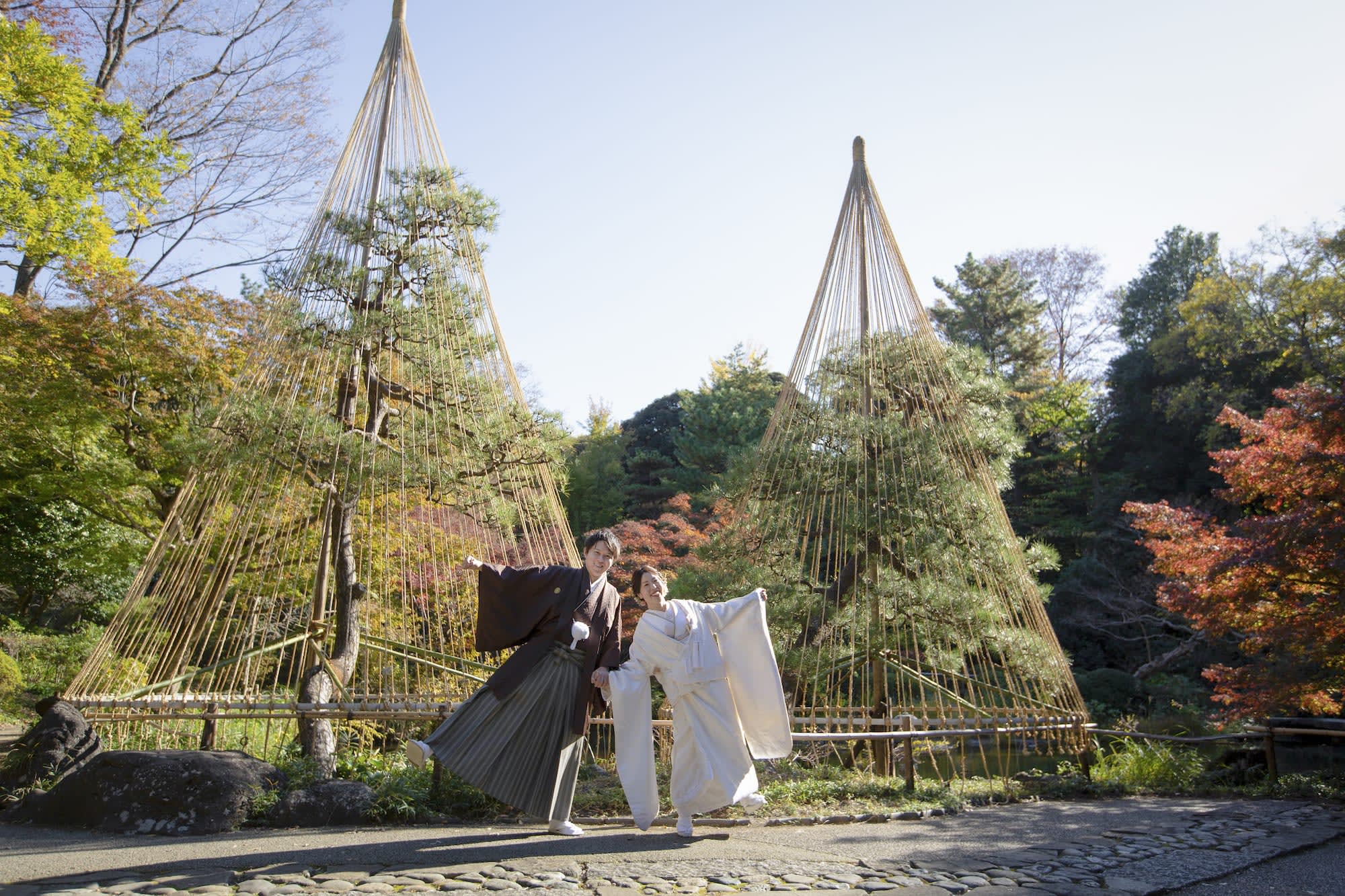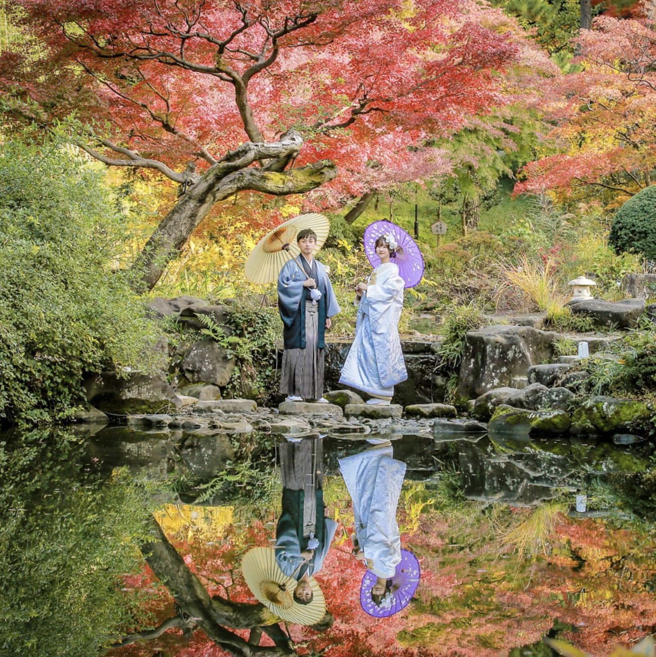 Kansen-en Garden is a Japanese garden with a pond, bridge, and seasonal plantings. Its tranquil waters and traditional scenery create dignified pre-wedding photos, especially suited for formal expressions and traditional attire.