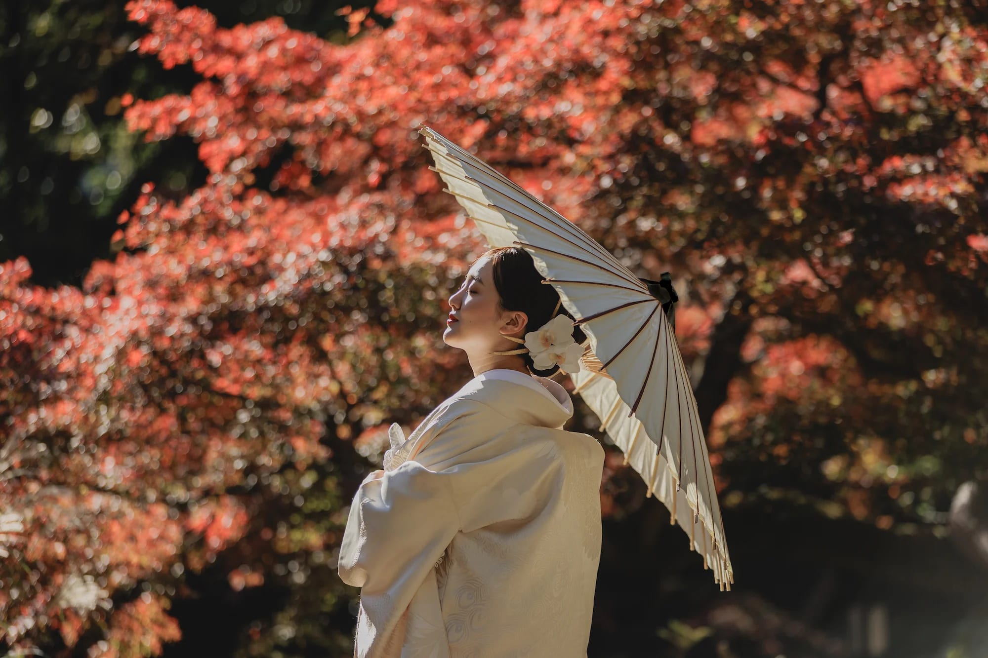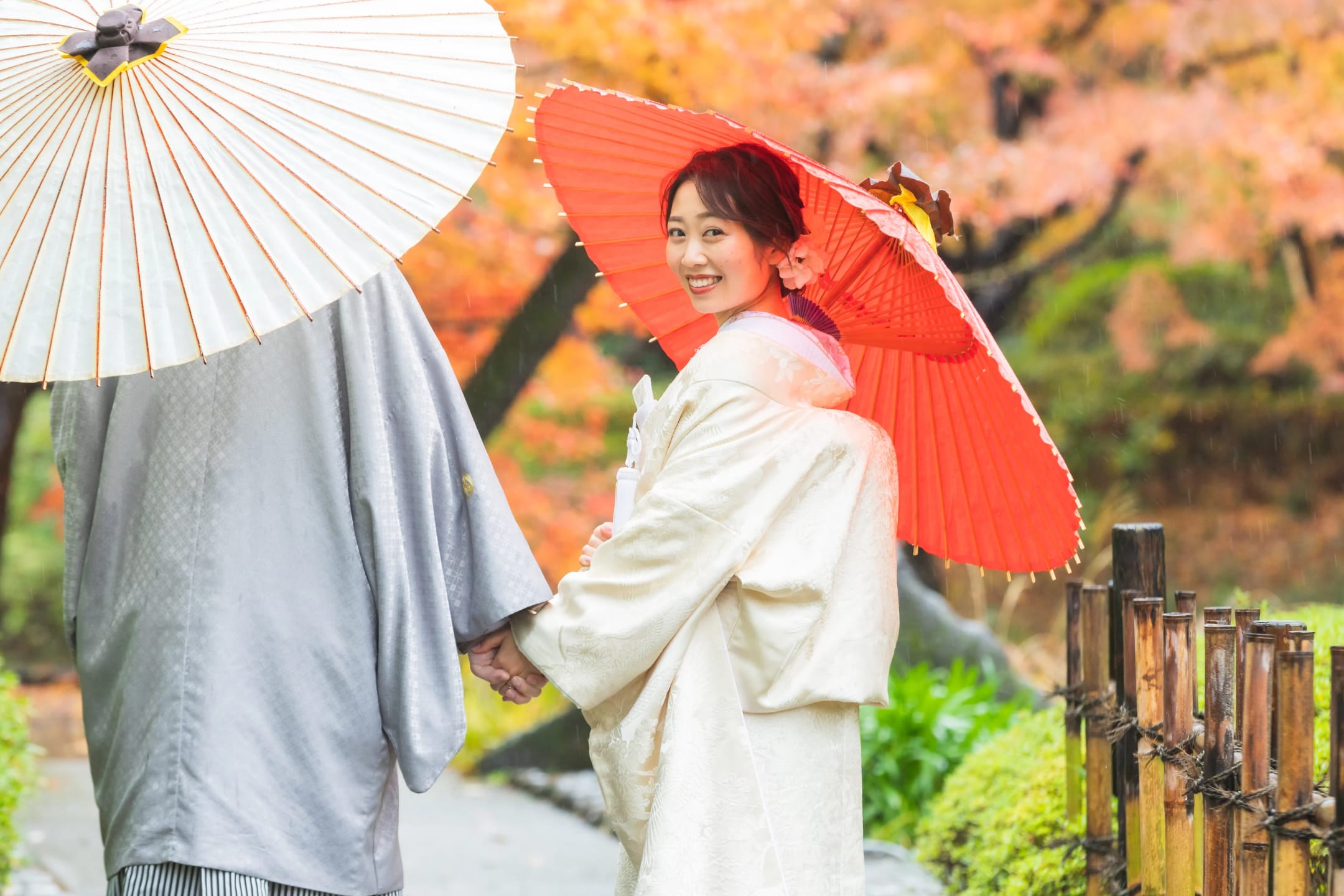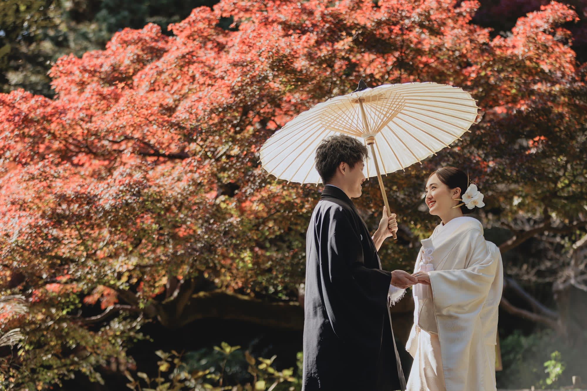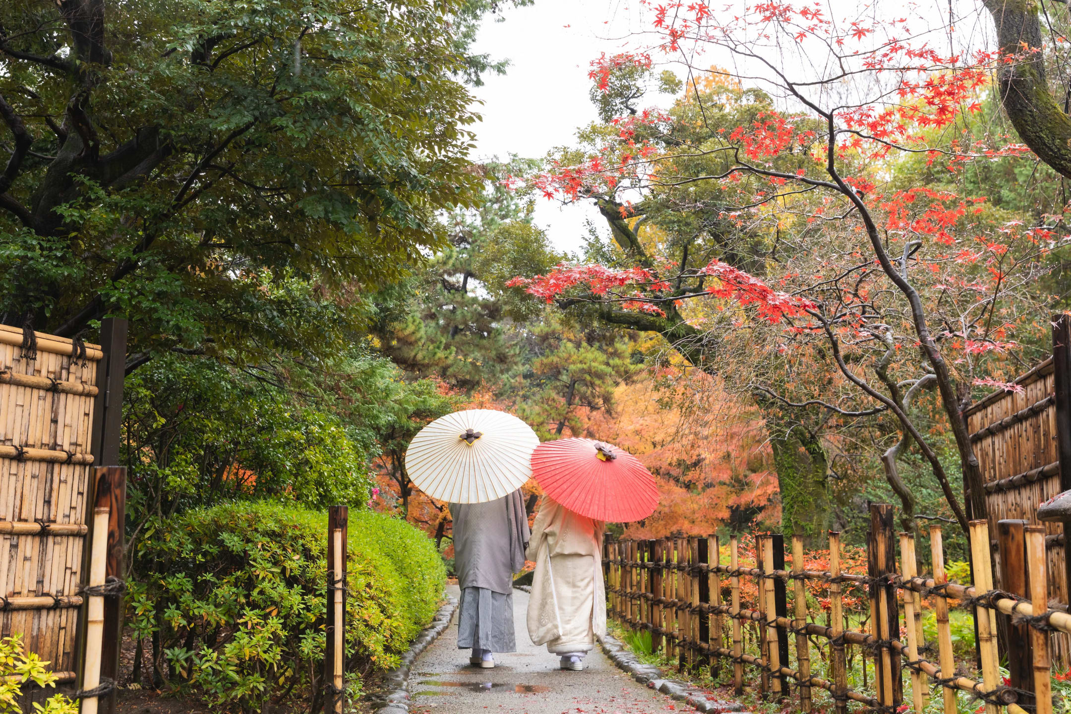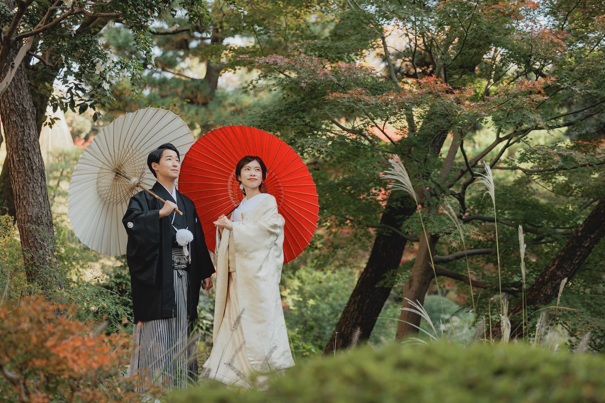 Kansen-en Garden is a Japanese garden with a pond, bridge, and seasonal plantings. Its tranquil waters and traditional scenery create dignified pre-wedding photos, especially suited for formal expressions and traditional attire.