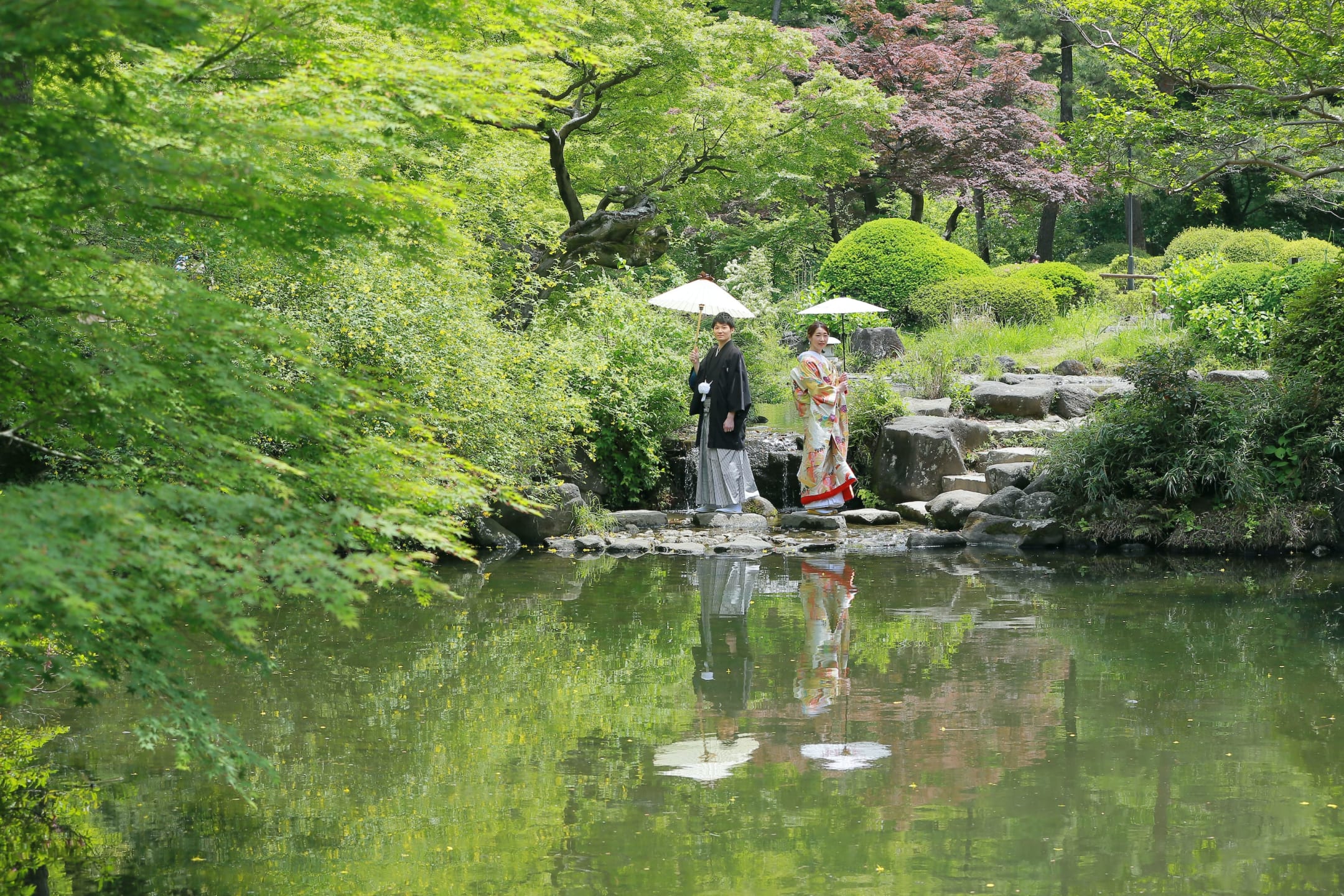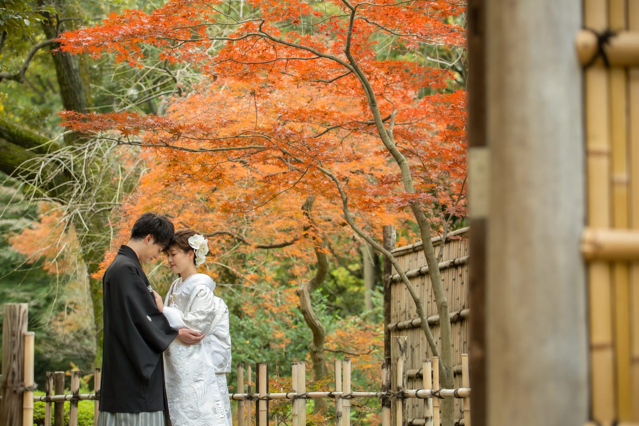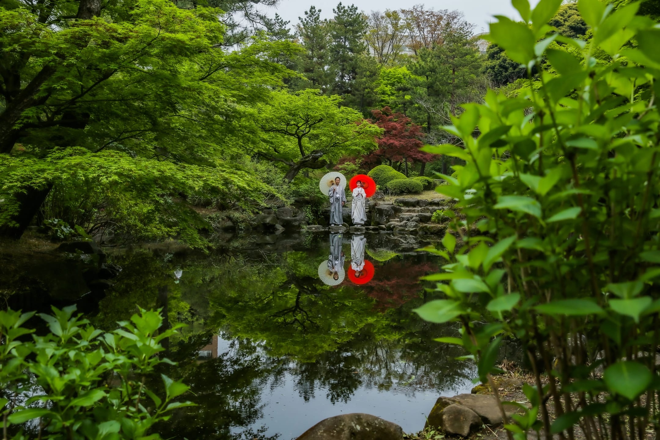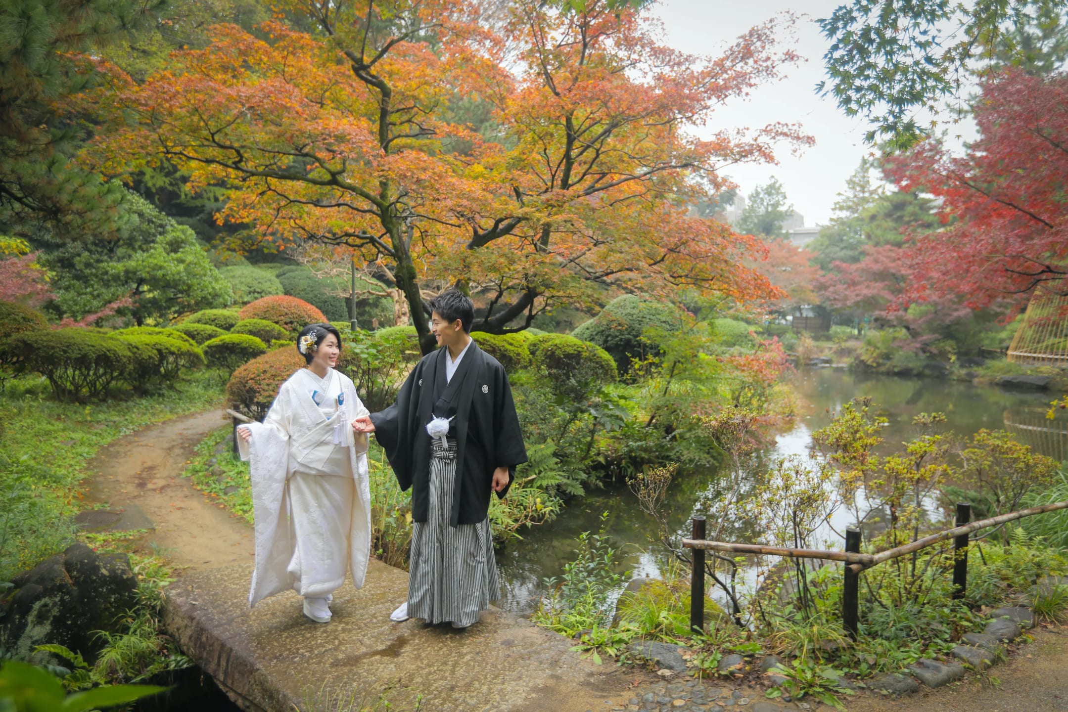 Kansen-en Garden is a Japanese garden with a pond, bridge, and seasonal plantings. Its tranquil waters and traditional scenery create dignified pre-wedding photos, especially suited for formal expressions and traditional attire.