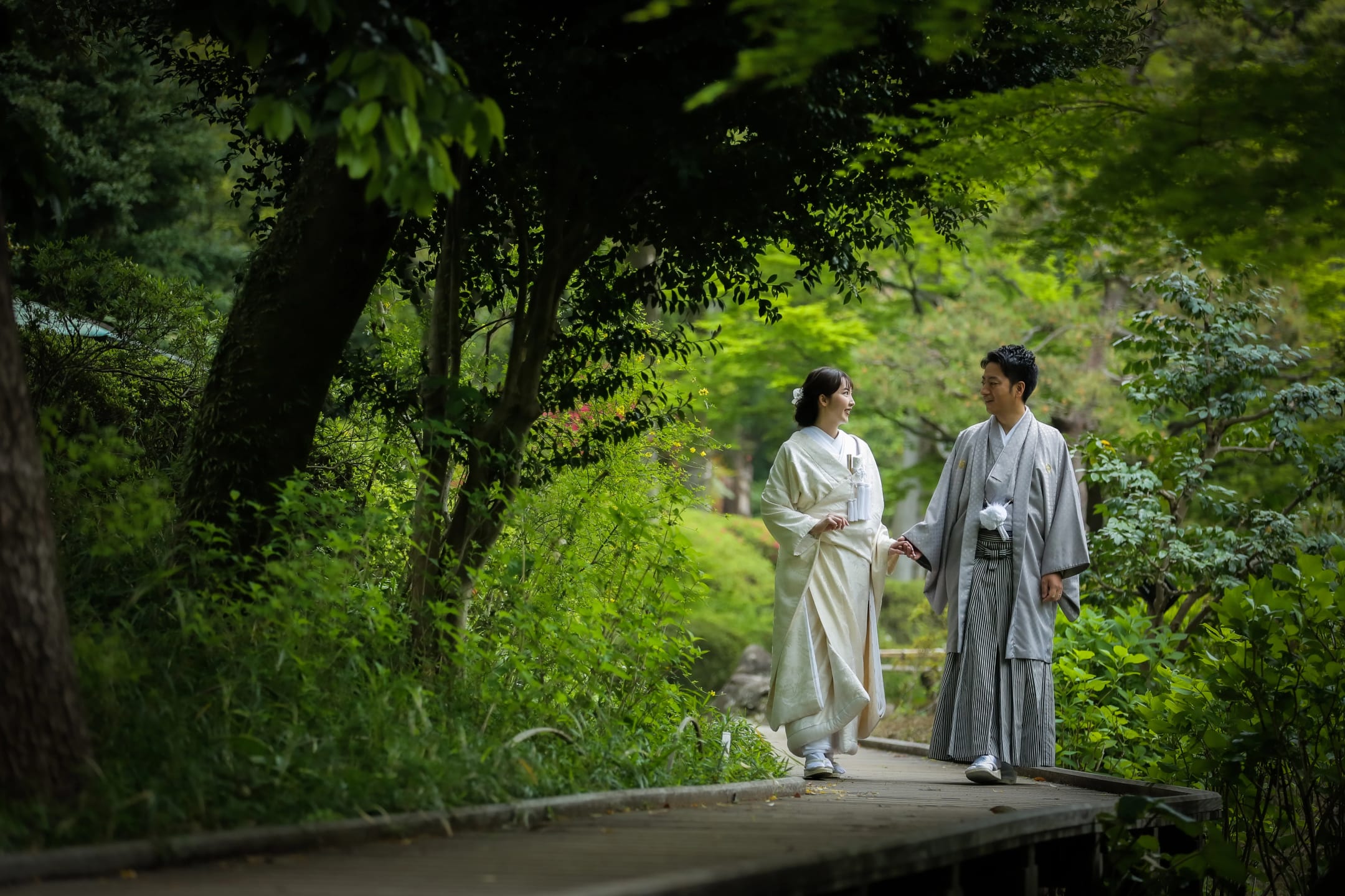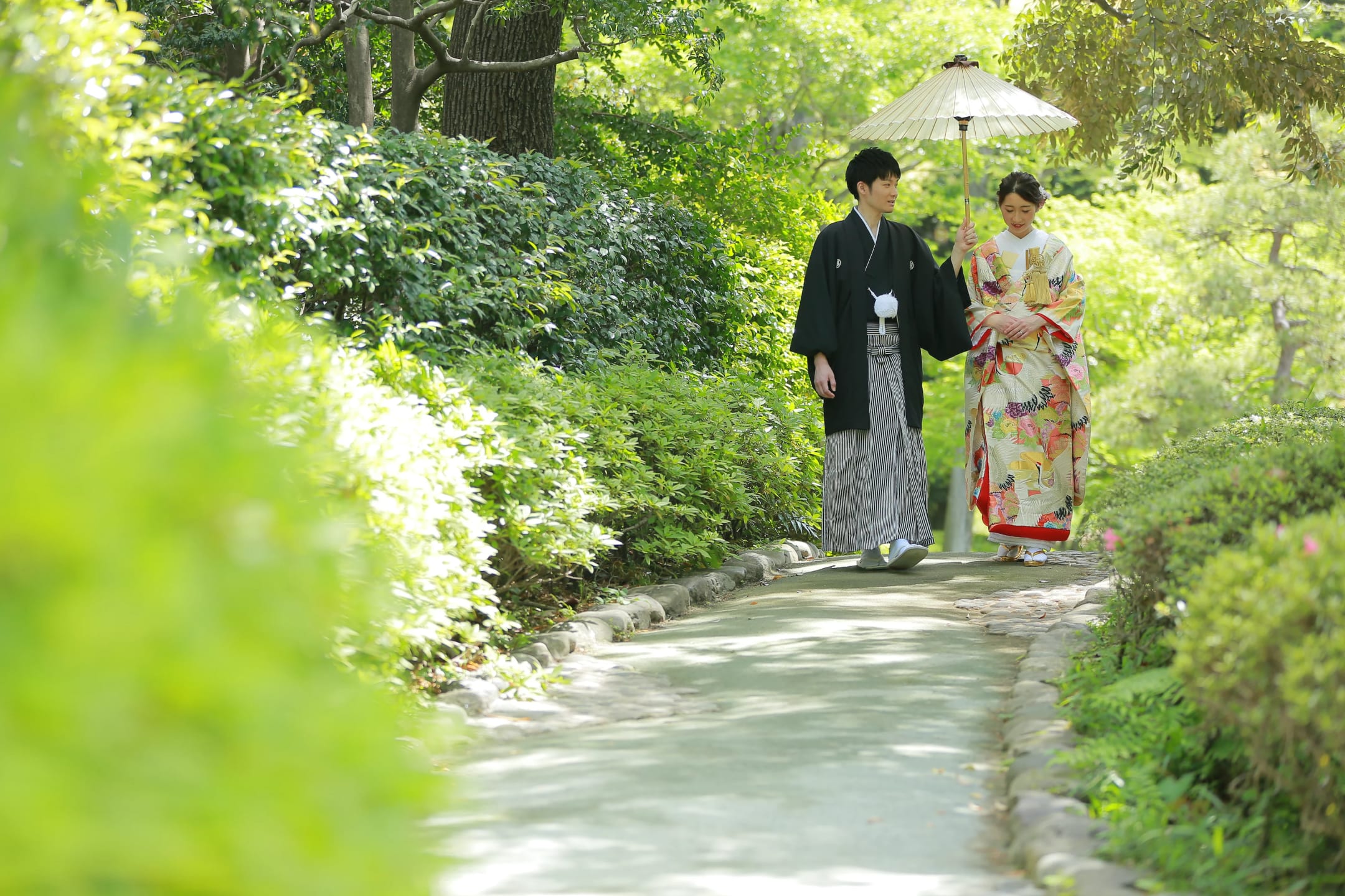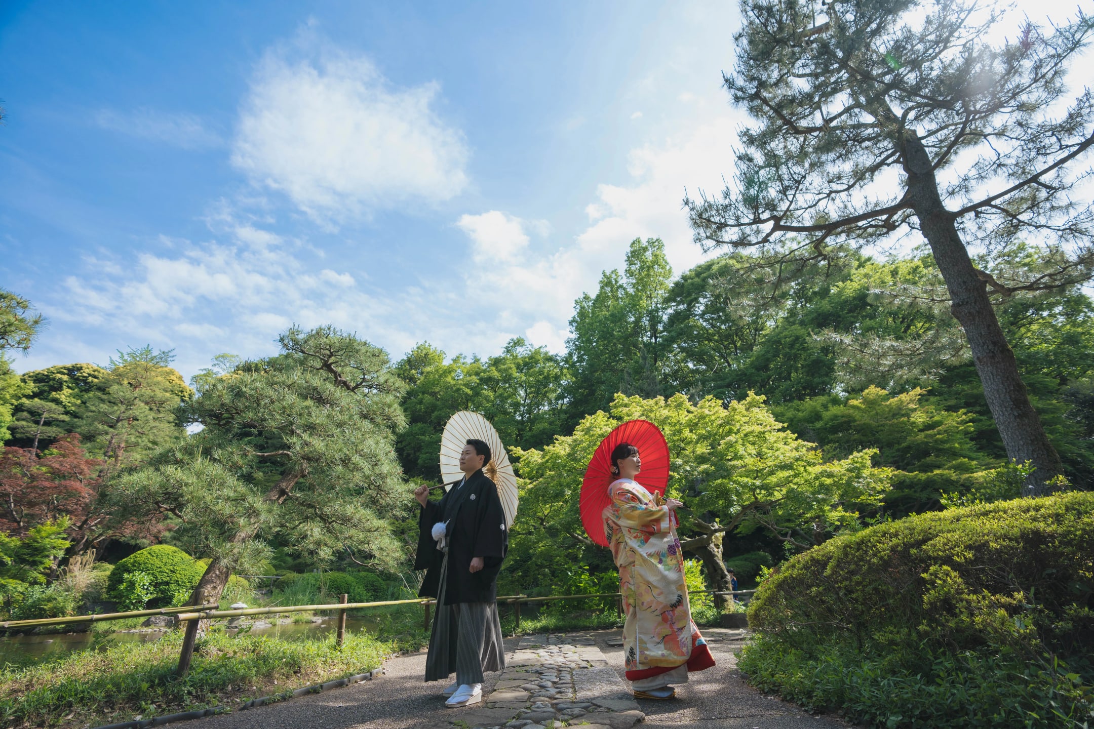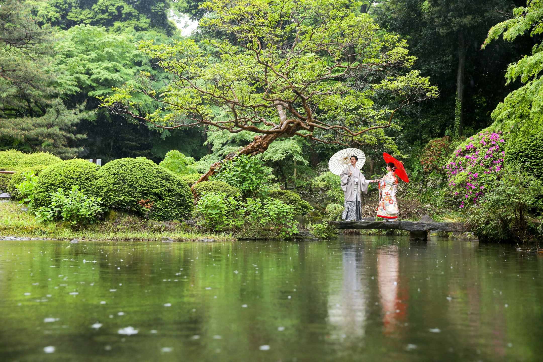 Kansen-en Garden is a Japanese garden with a pond, bridge, and seasonal plantings. Its tranquil waters and traditional scenery create dignified pre-wedding photos, especially suited for formal expressions and traditional attire.