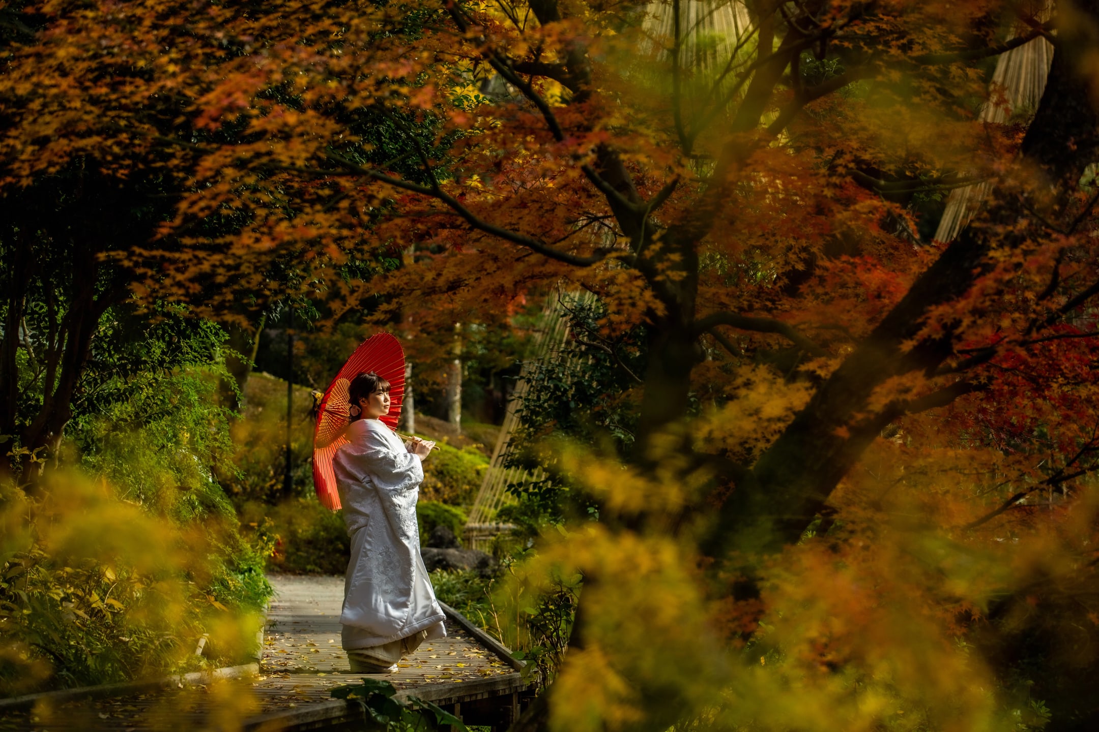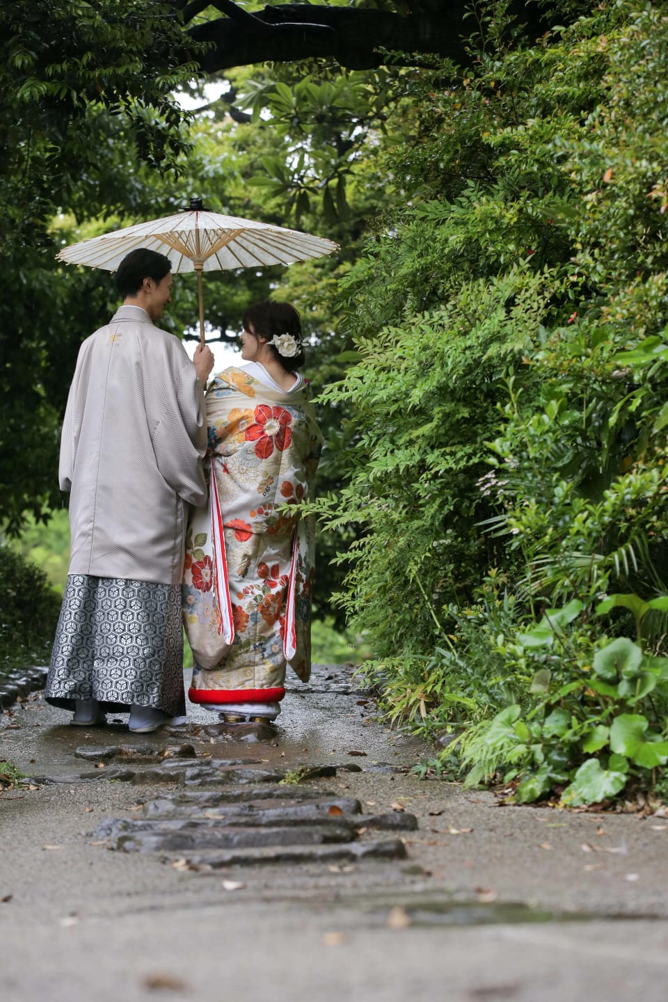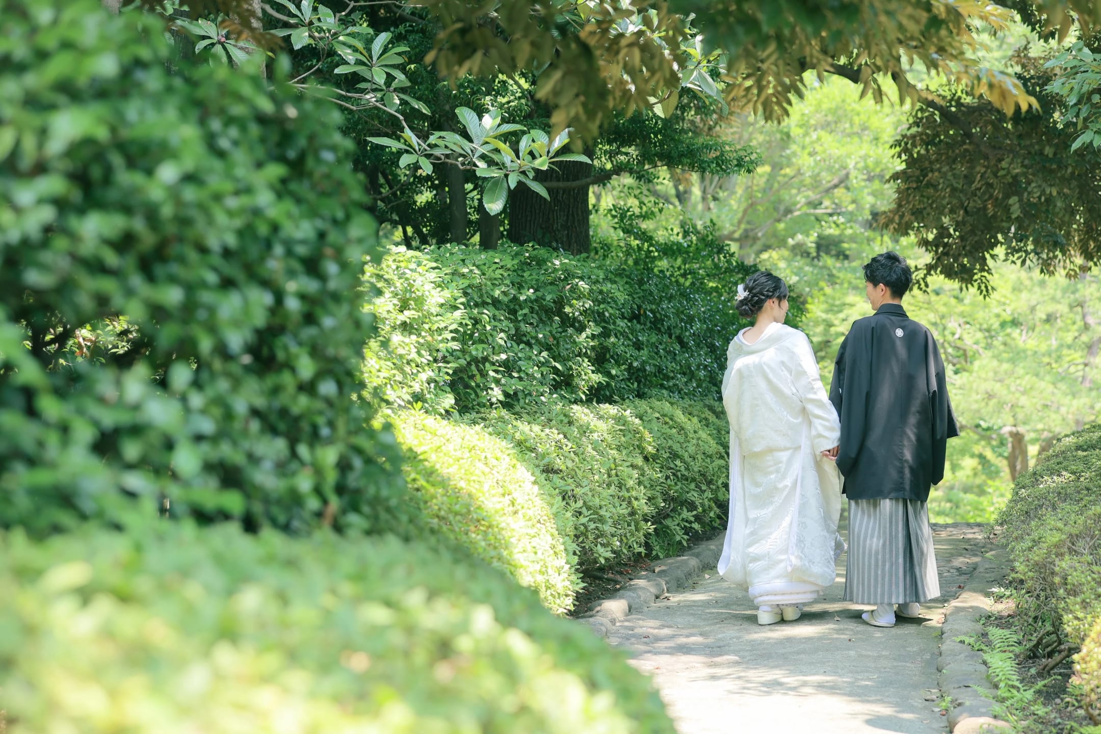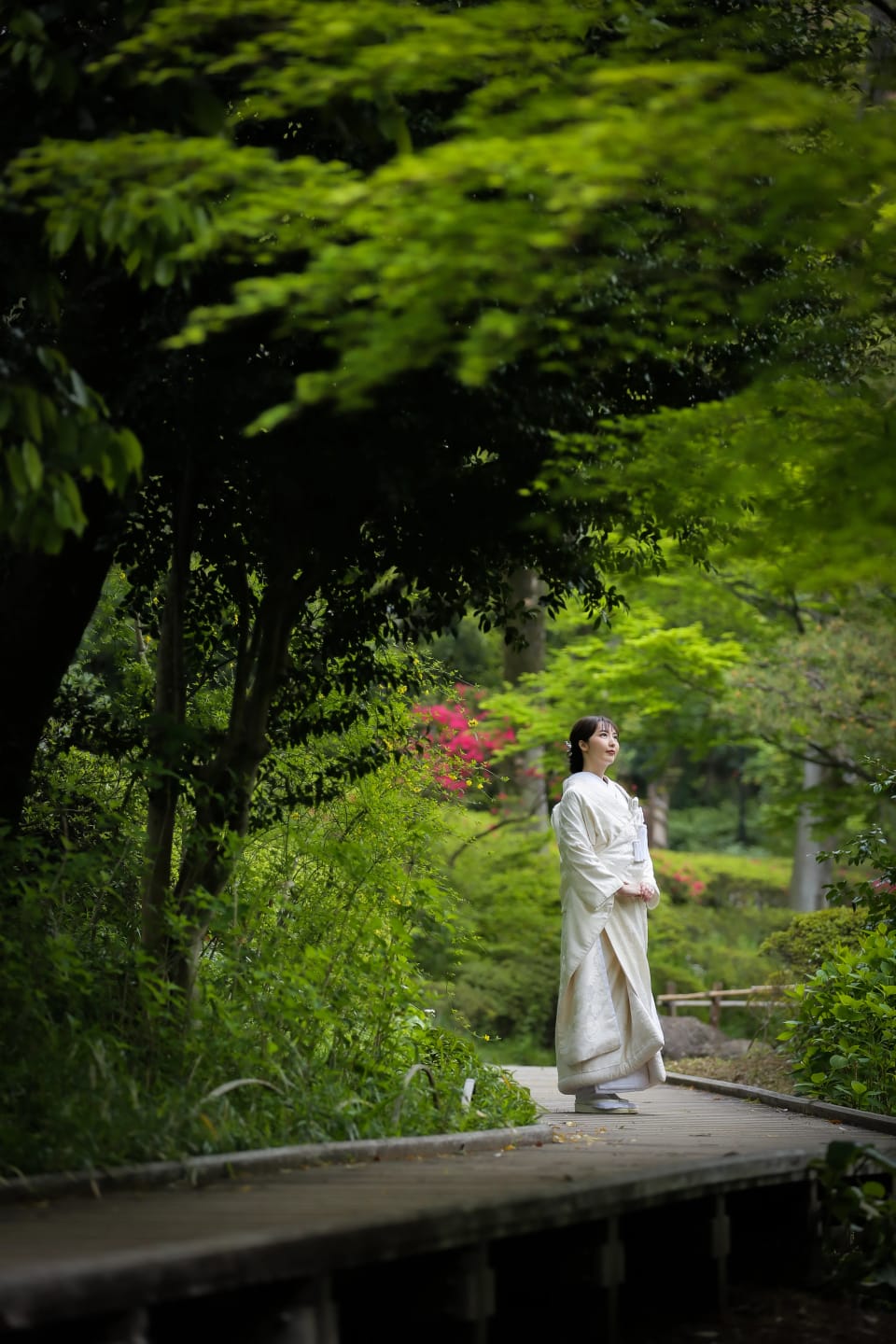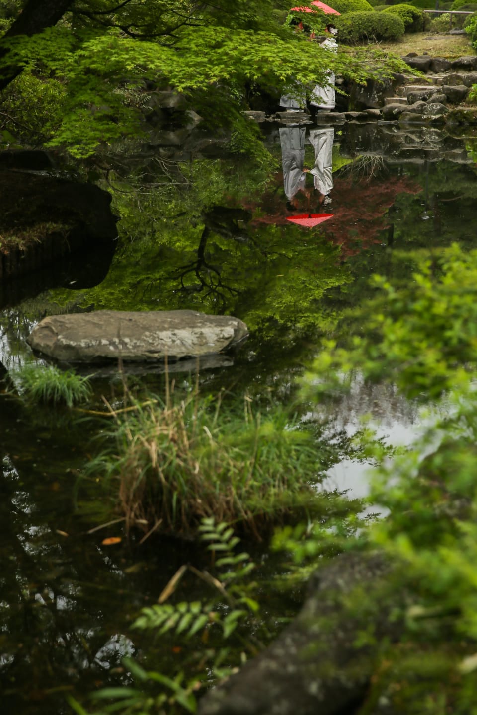 Kansen-en Garden is a Japanese garden with a pond, bridge, and seasonal plantings. Its tranquil waters and traditional scenery create dignified pre-wedding photos, especially suited for formal expressions and traditional attire.