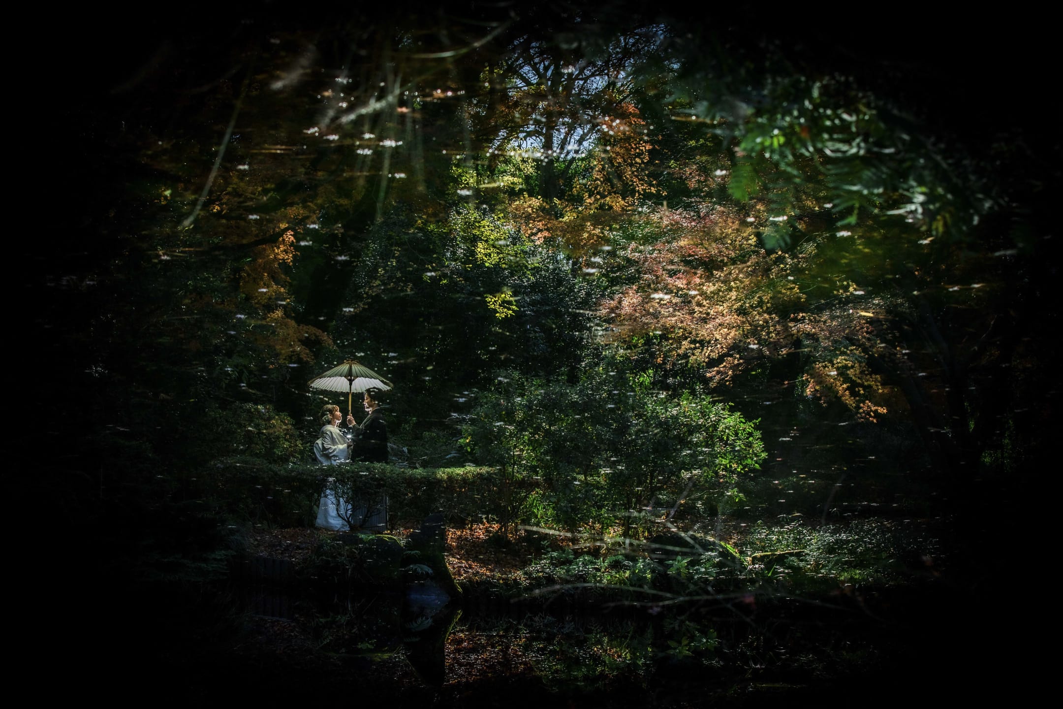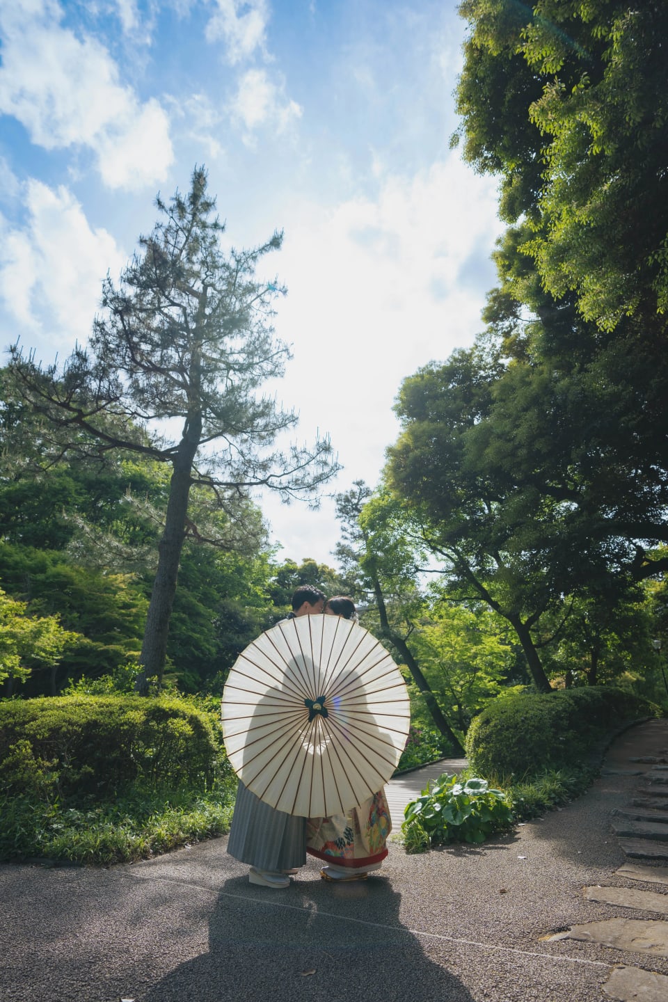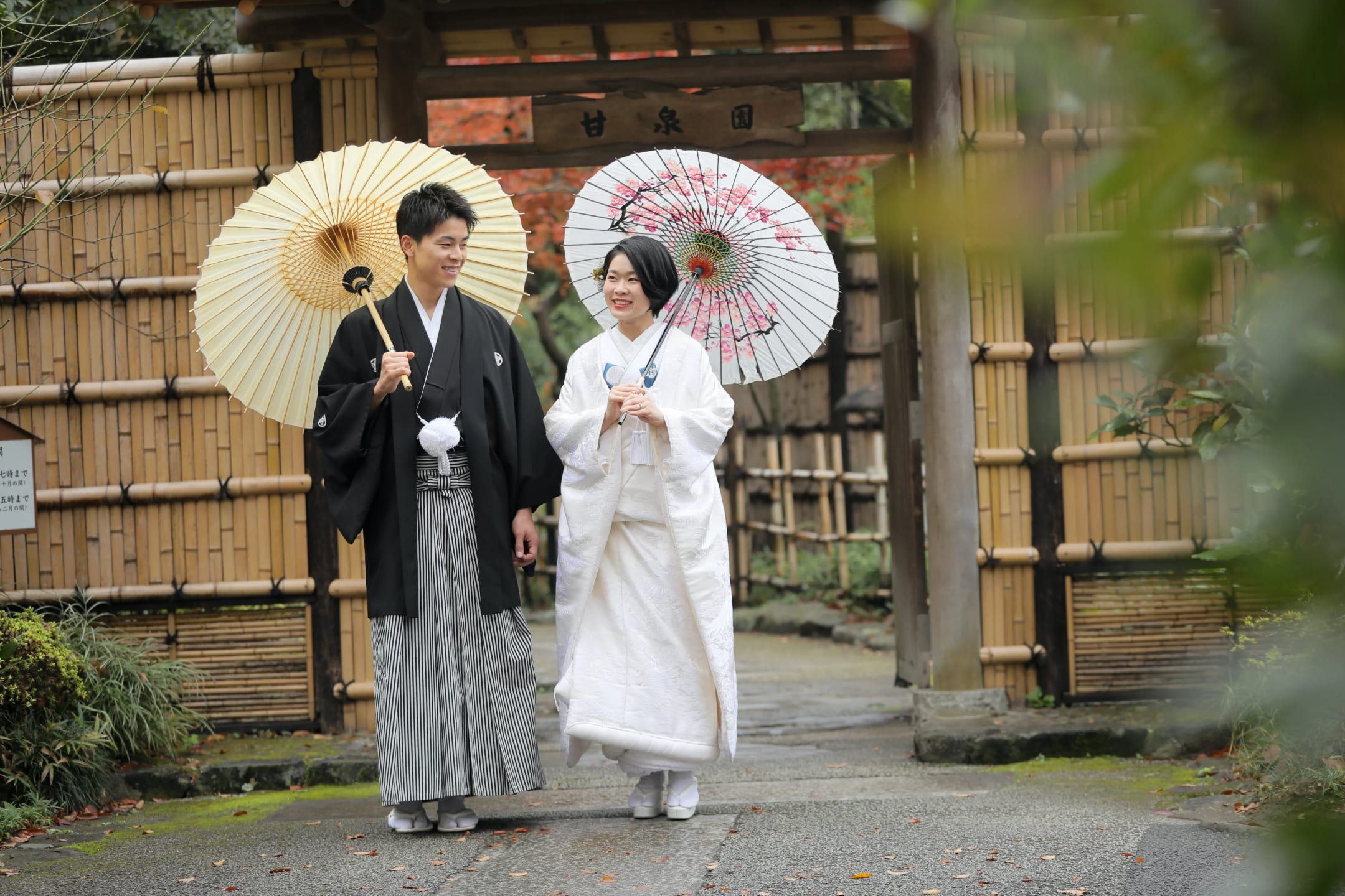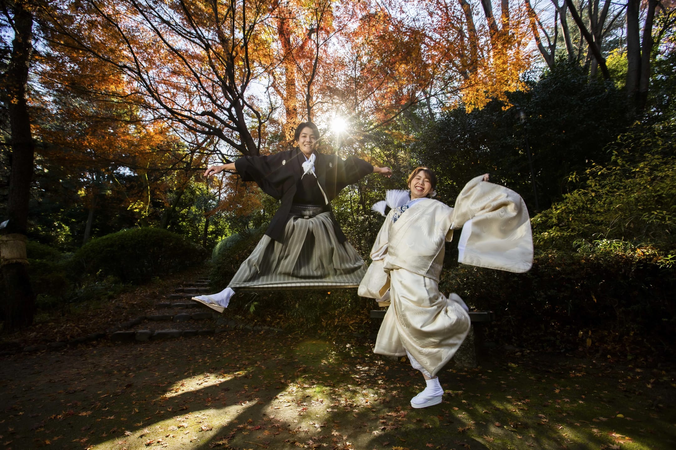Kansen-en Garden is a Japanese garden with a pond, bridge, and seasonal plantings. Its tranquil waters and traditional scenery create dignified pre-wedding photos, especially suited for formal expressions and traditional attire.
