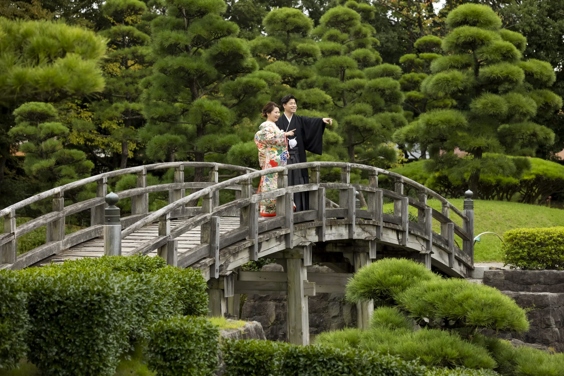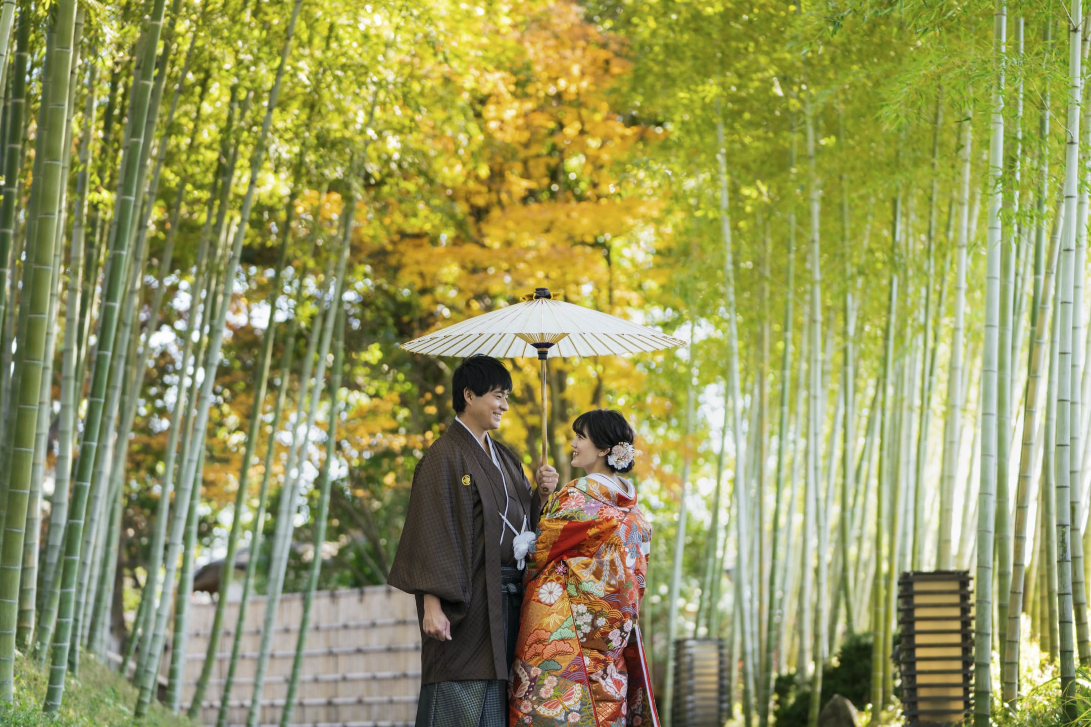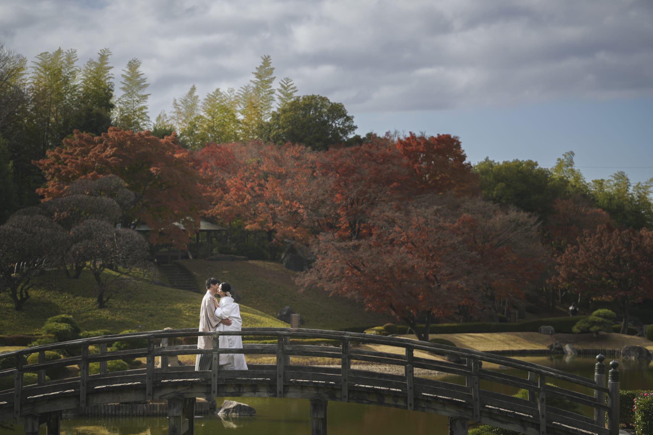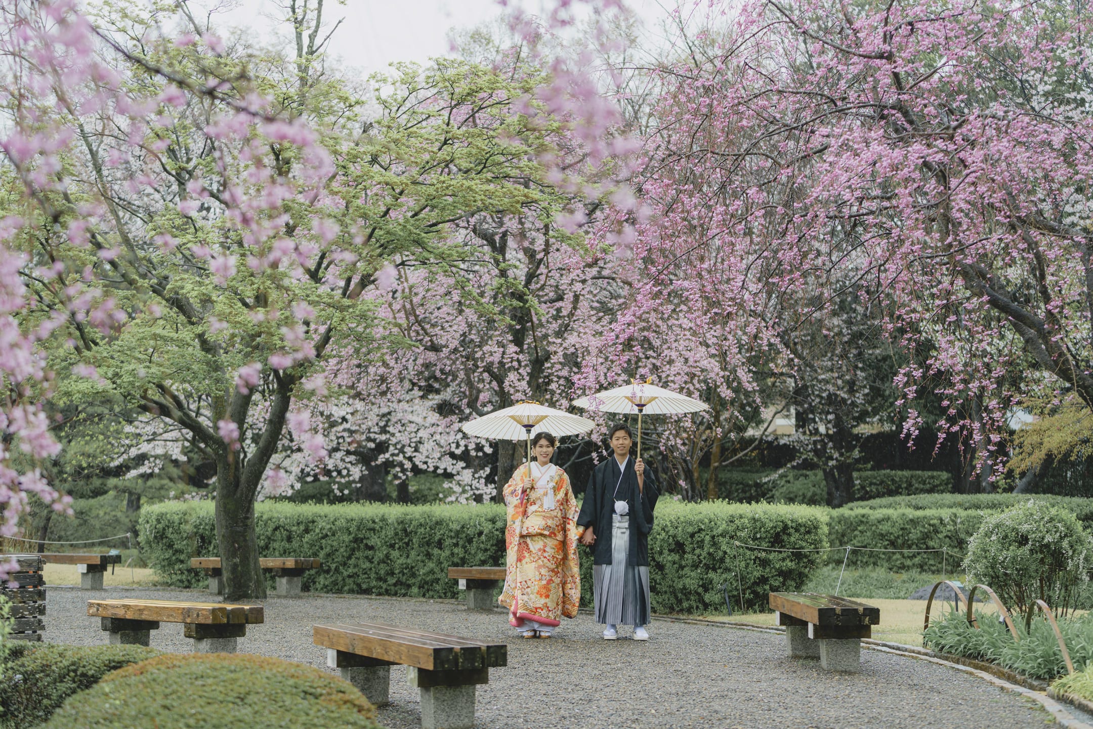 Hanataen is a garden filled with flowers and trees, offering richly colored landscapes. Seasonal blossoms create vibrant and elegant wedding photos, beautifully contrasted by natural light.