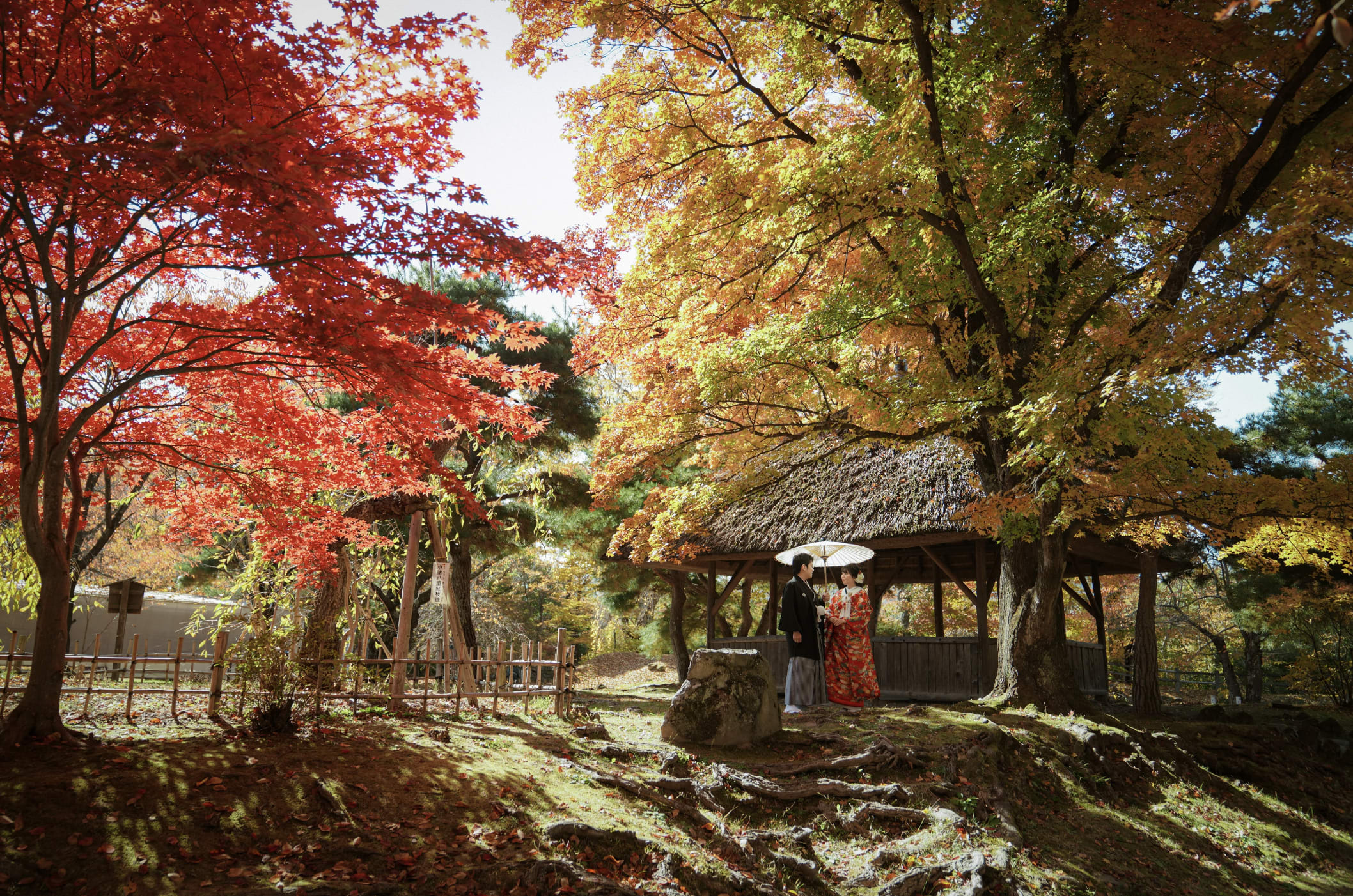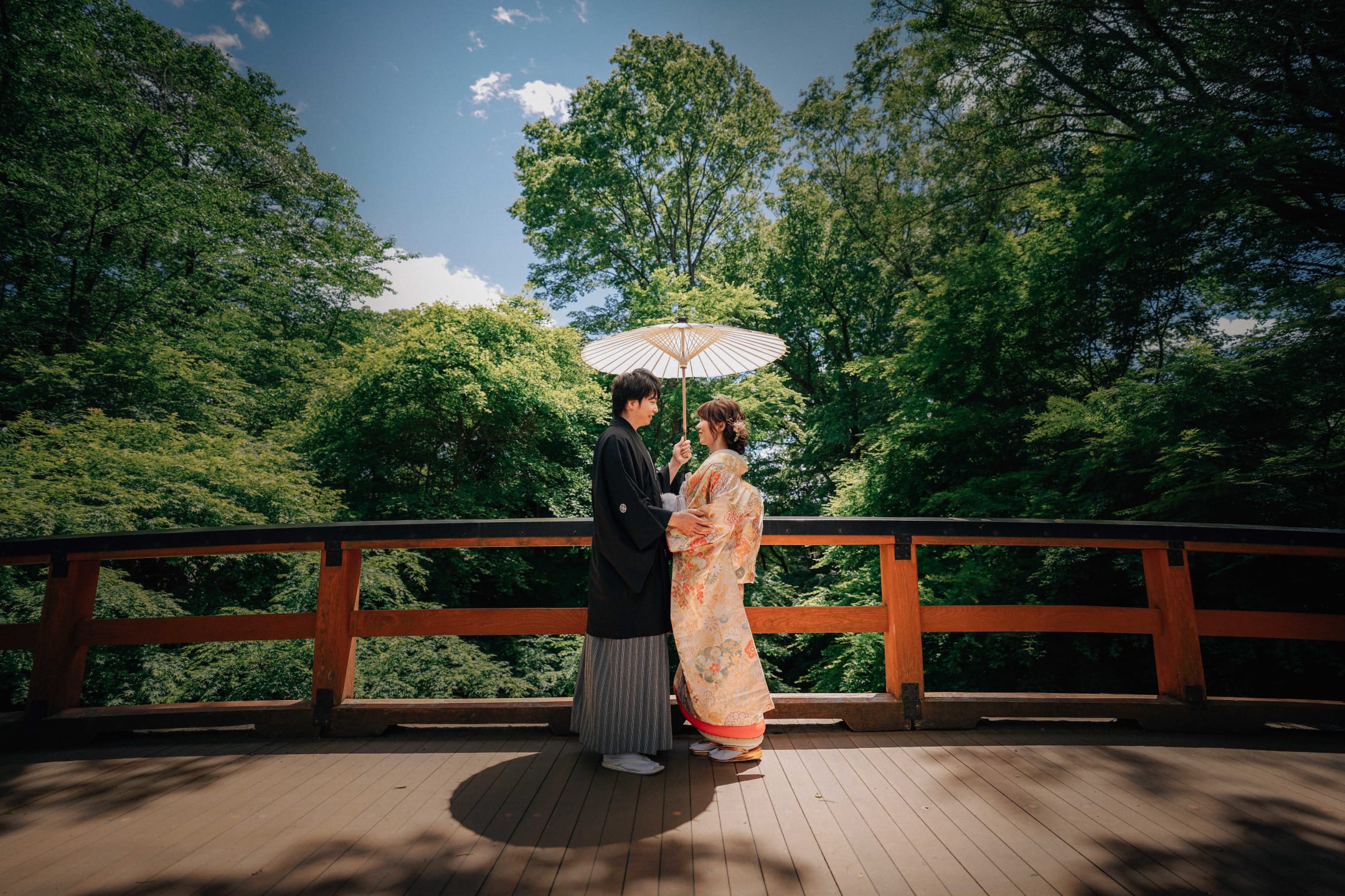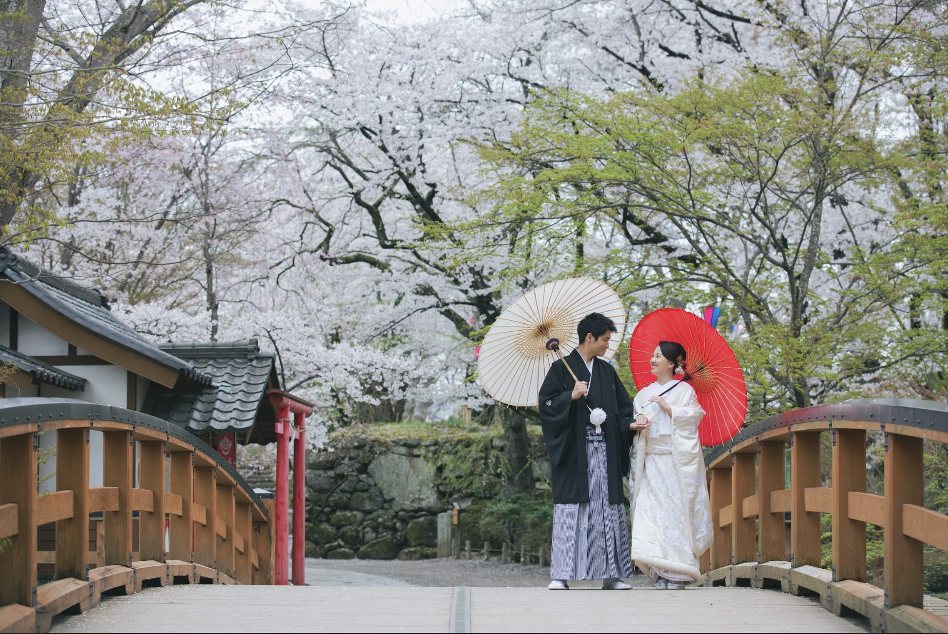 The Iizuna Mountain area offers panoramic views from elevated terrain. With mountain ranges and expansive skies in the background, it enables dynamic shots filled with grandeur—perfect for couples seeking impressive and dramatic imagery.