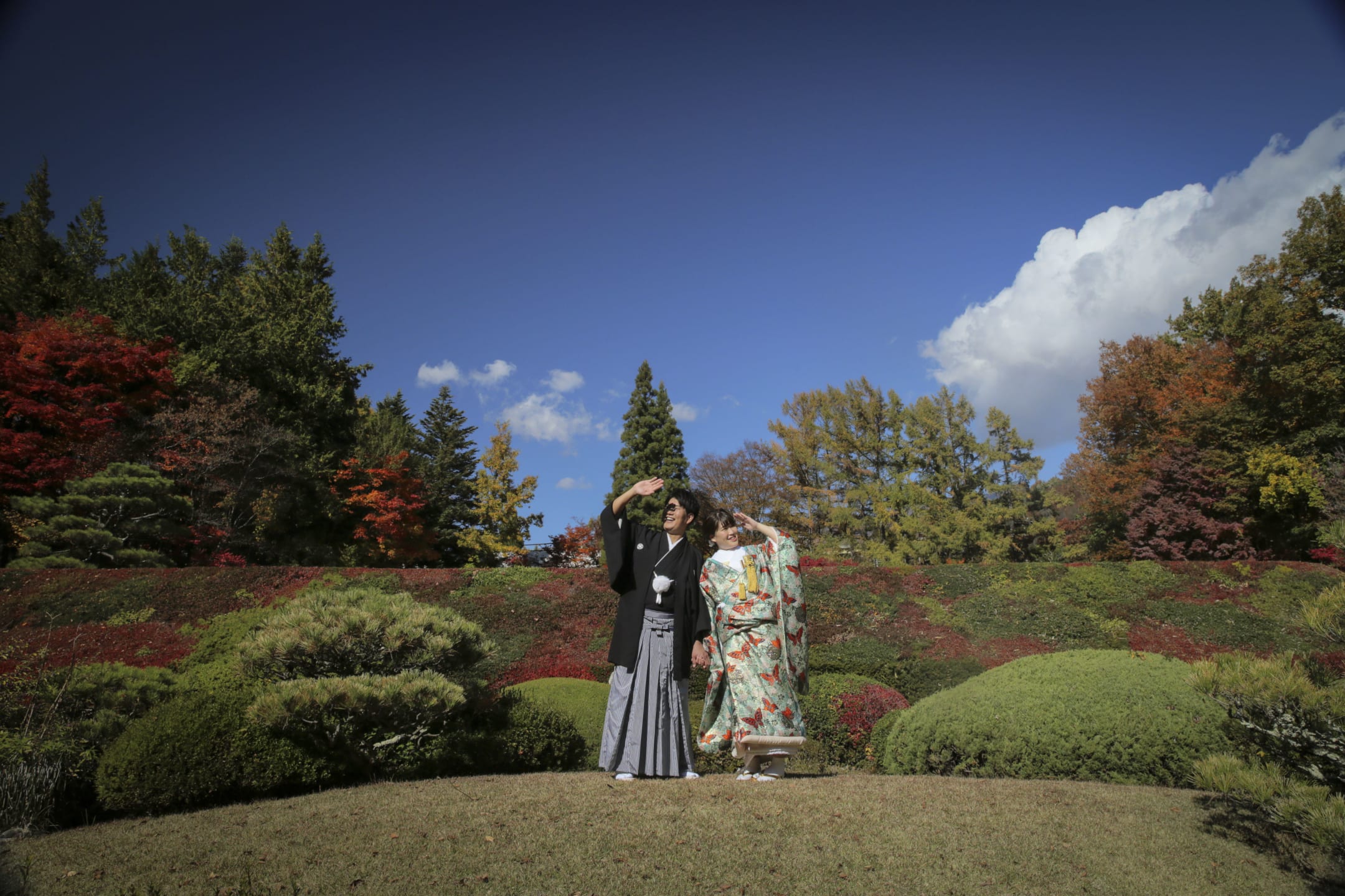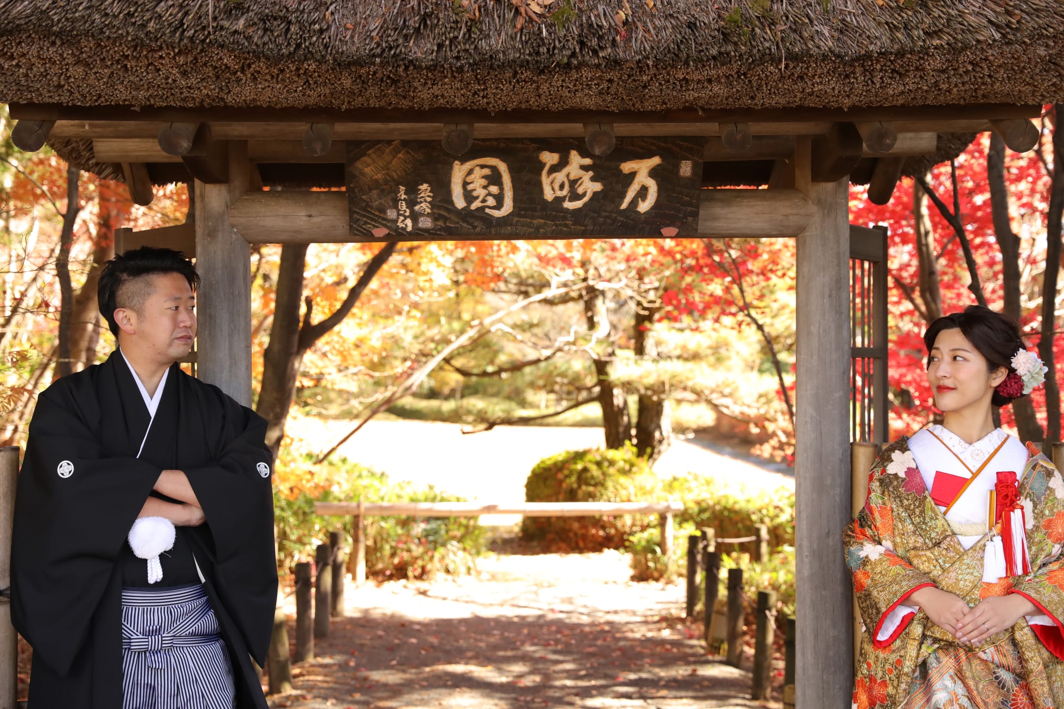 Bansui-en, a classical Japanese garden, harmonizes beautiful greenery with stone bridges. The serene composition pairs exceptionally well with traditional Japanese clothing, allowing for dignified and elegant pre-wedding photographs featuring greenery, moss, and calm water elements.