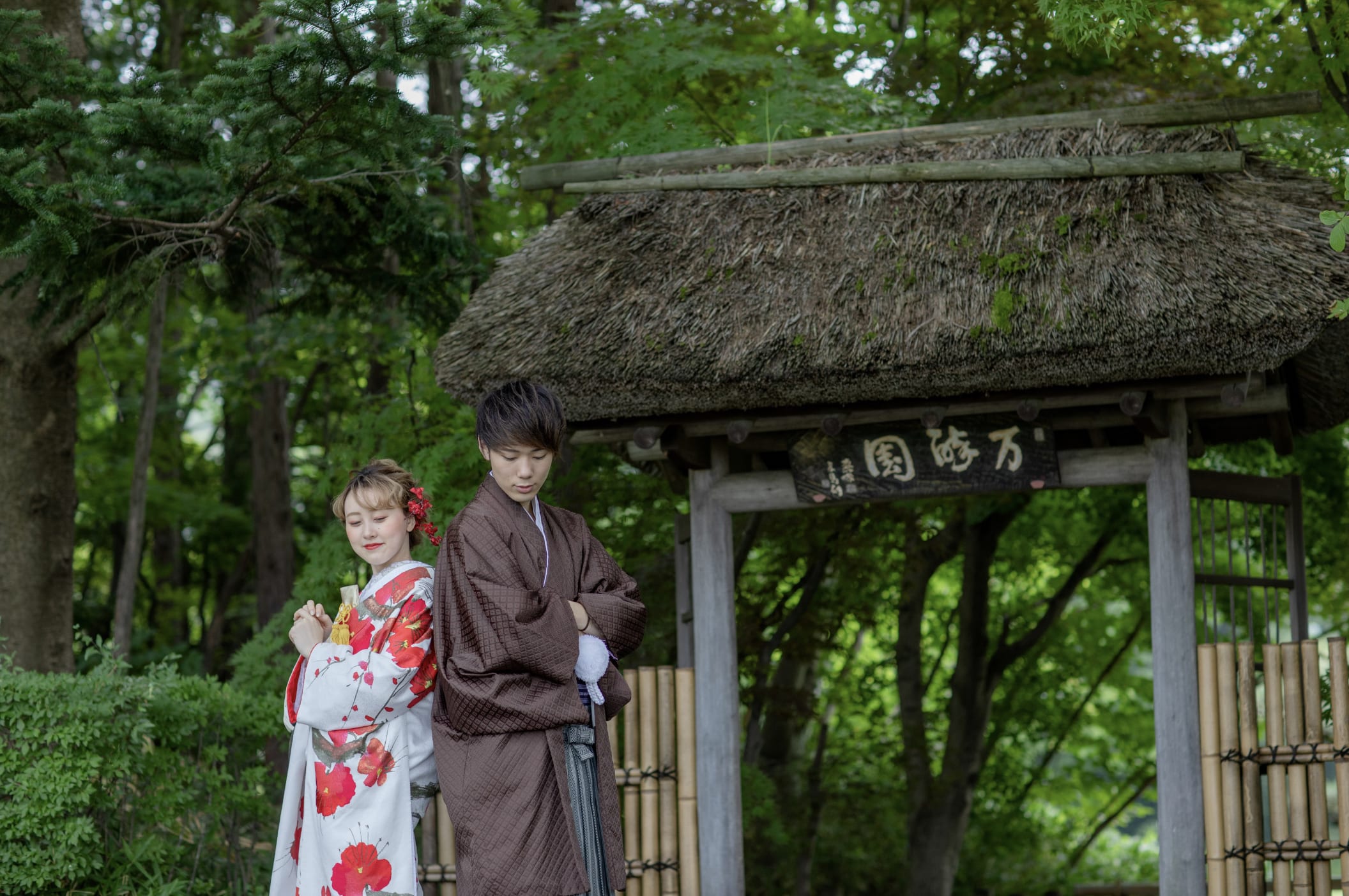 Bansui-en, a classical Japanese garden, harmonizes beautiful greenery with stone bridges. The serene composition pairs exceptionally well with traditional Japanese clothing, allowing for dignified and elegant pre-wedding photographs featuring greenery, moss, and calm water elements.