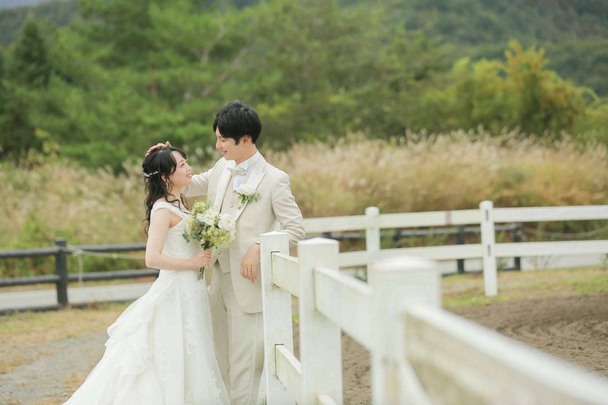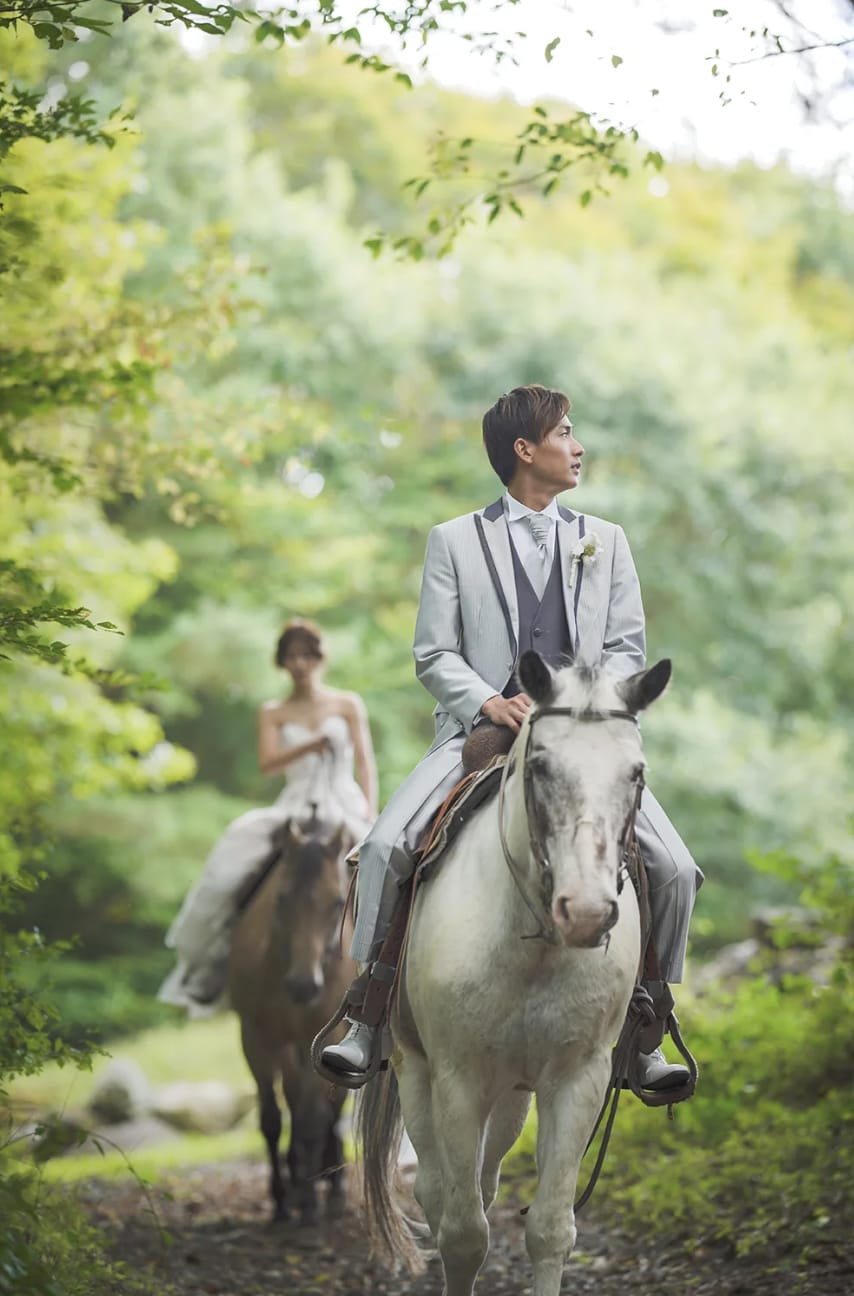 At the foot of Mt. Fuji, horseback riding scenes introduce motion and activity into pre-wedding photography. The vast landscape and Fuji as a backdrop produce dynamic, expressive images filled with natural energy.