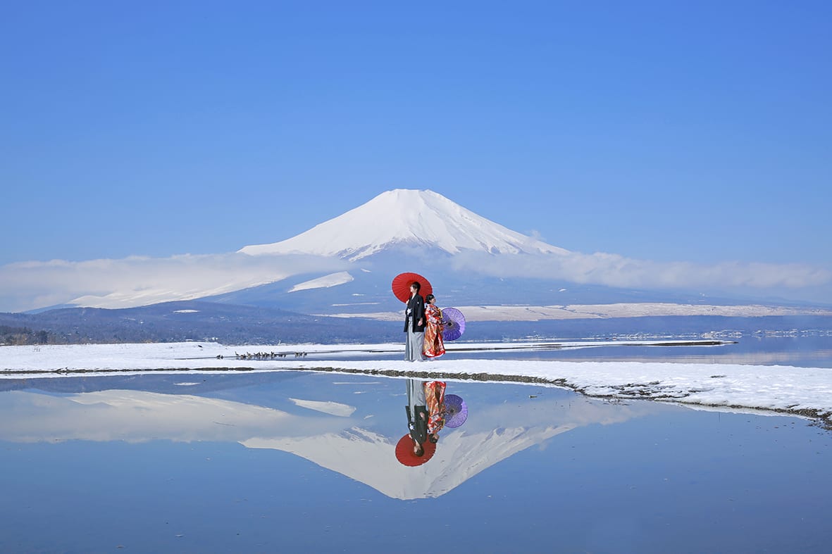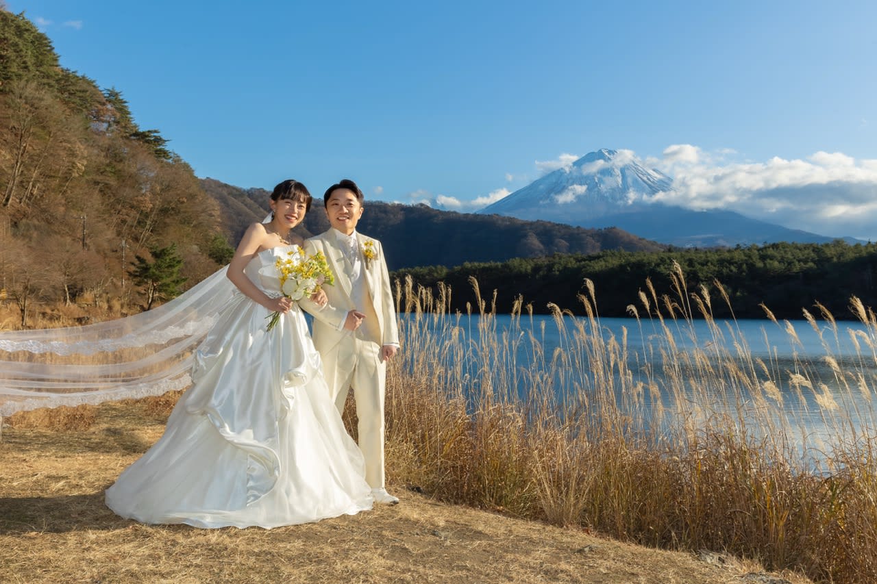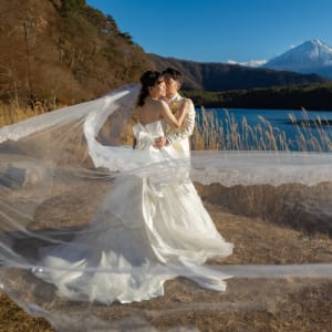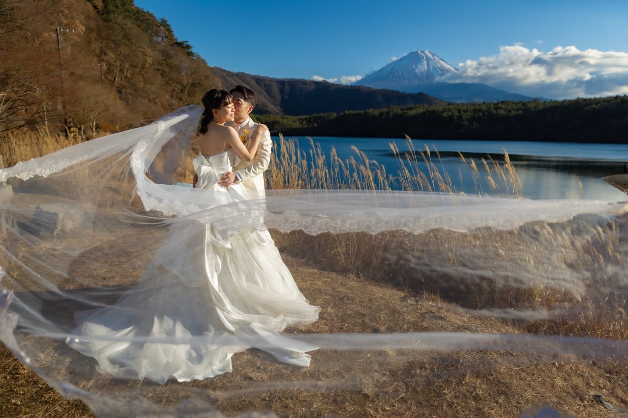 At the foot of Mt. Fuji, horseback riding scenes introduce motion and activity into pre-wedding photography. The vast landscape and Fuji as a backdrop produce dynamic, expressive images filled with natural energy.
