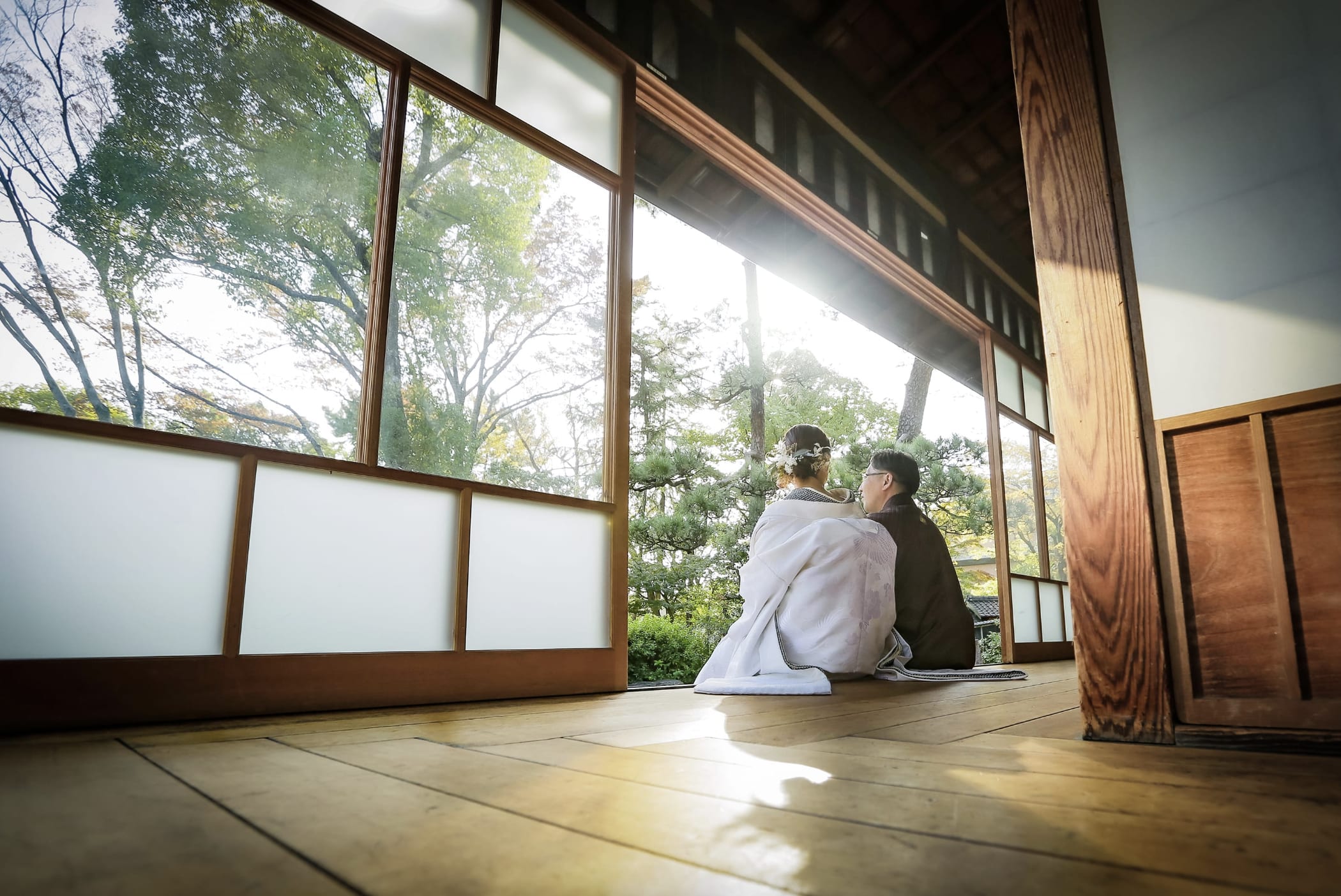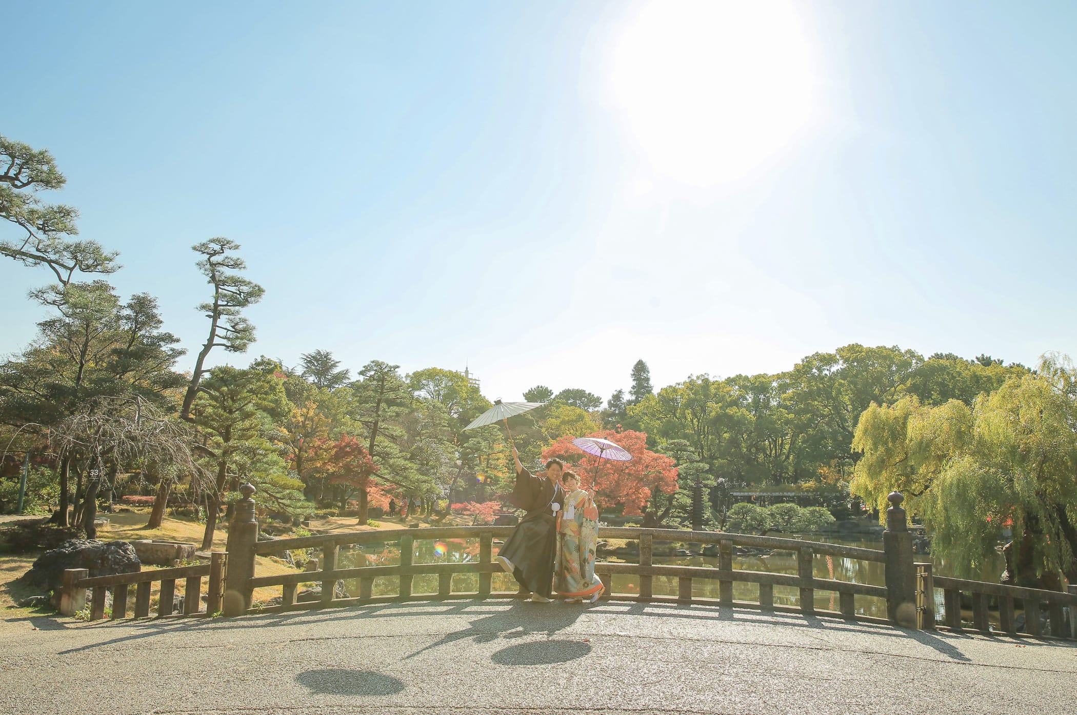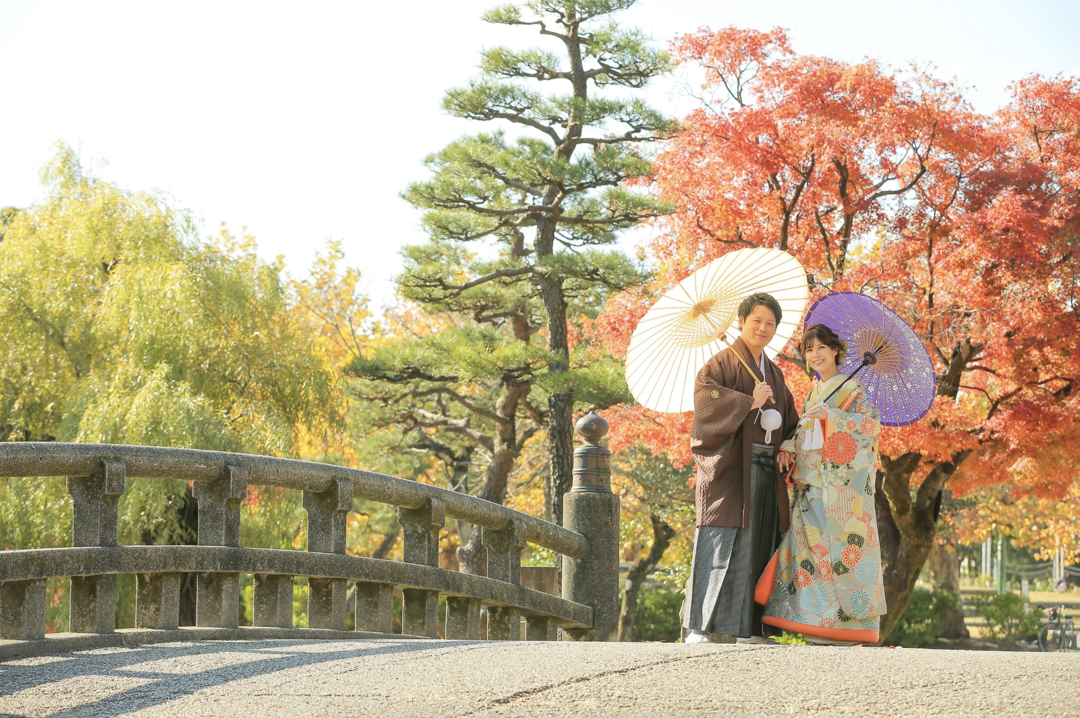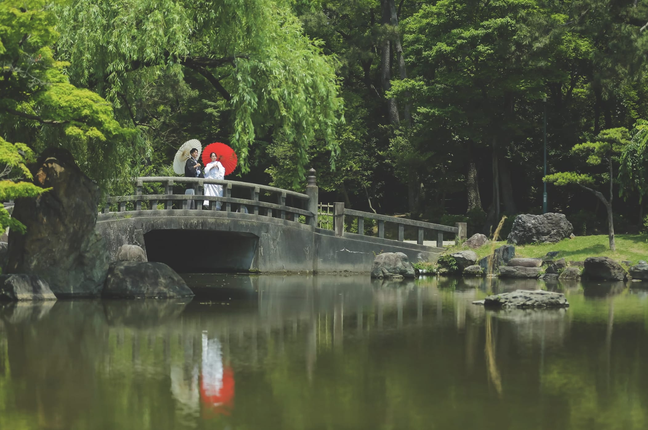 Tokugawaen is a prestigious Japanese garden representing Nagoya, featuring ponds, stone bridges, and seasonal plantings that create a serene backdrop. It complements both traditional and Western attire, allowing elegant pre-wedding photos with natural light.