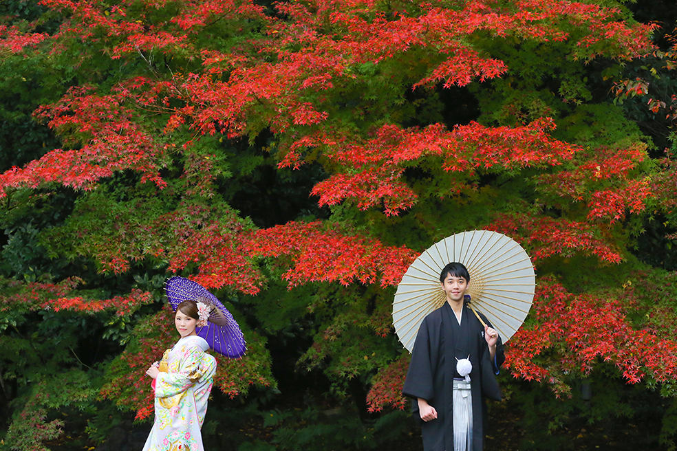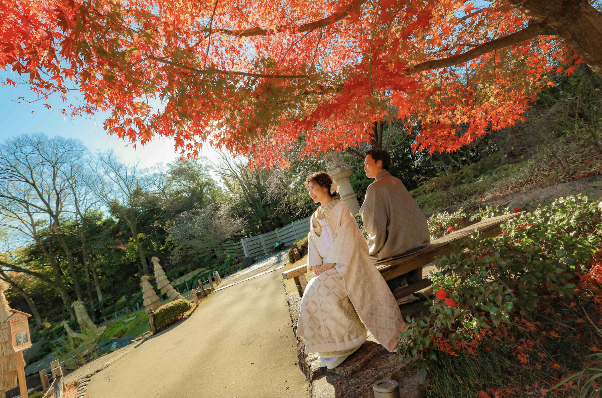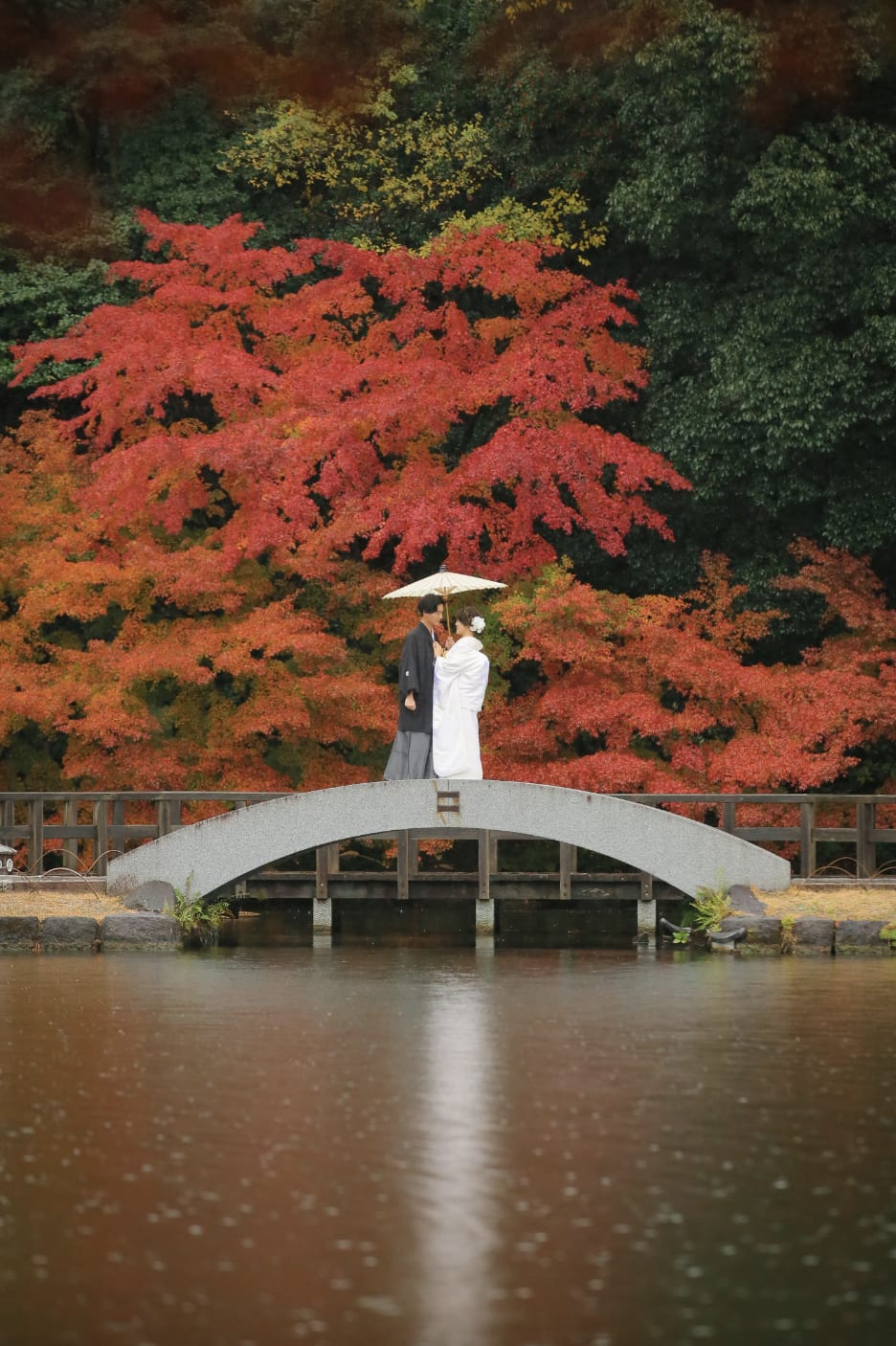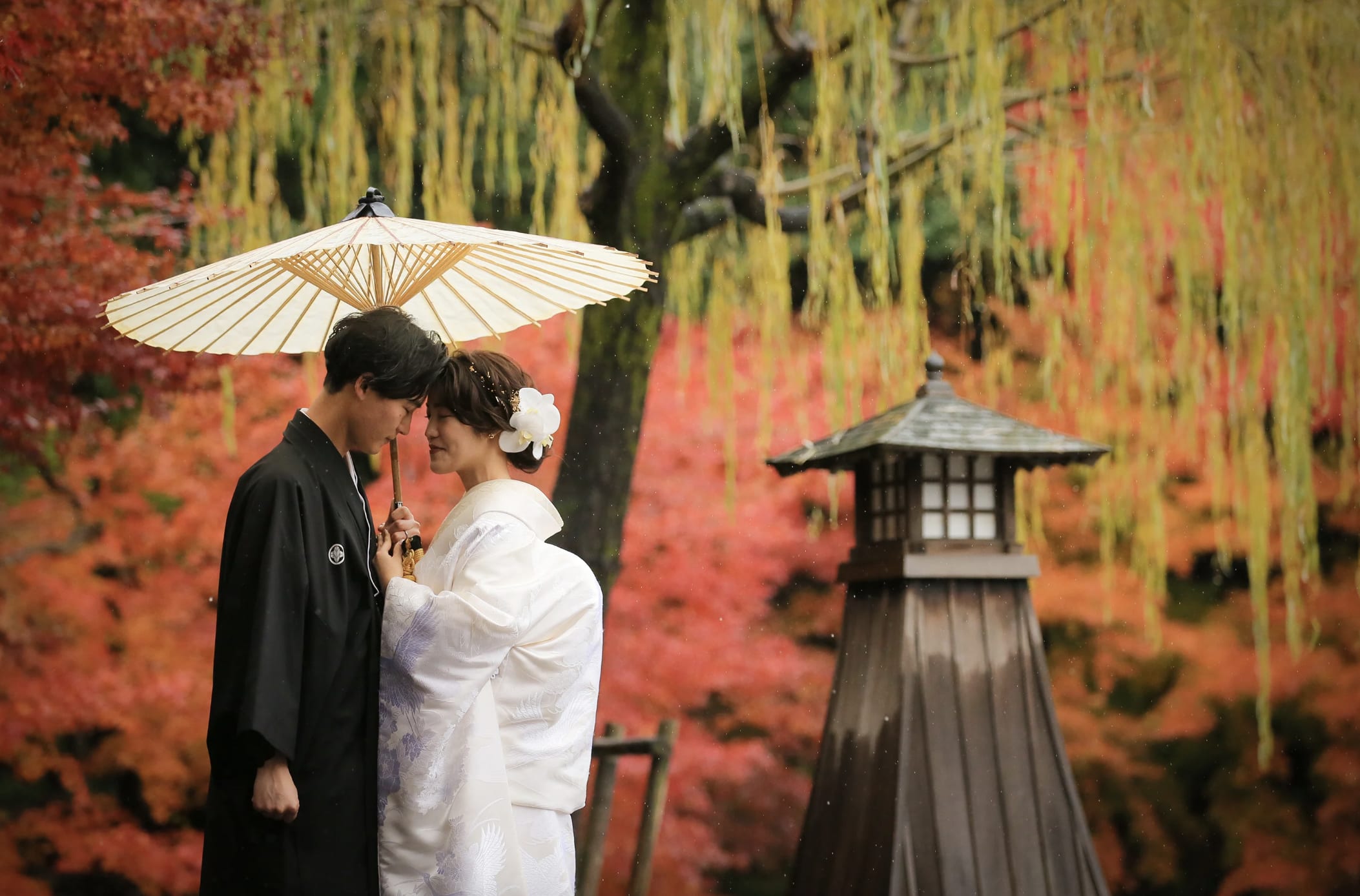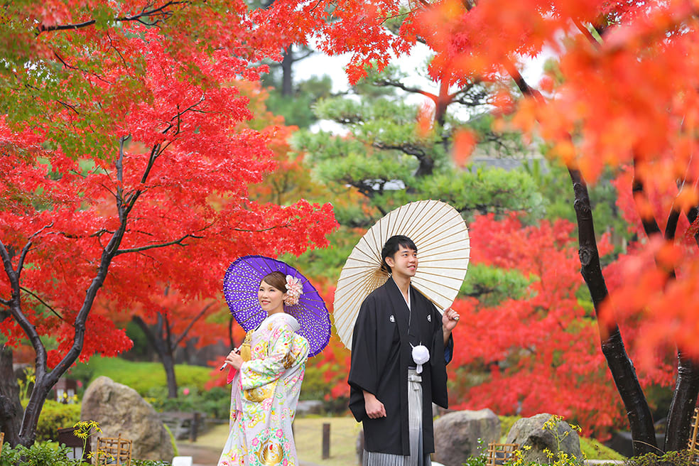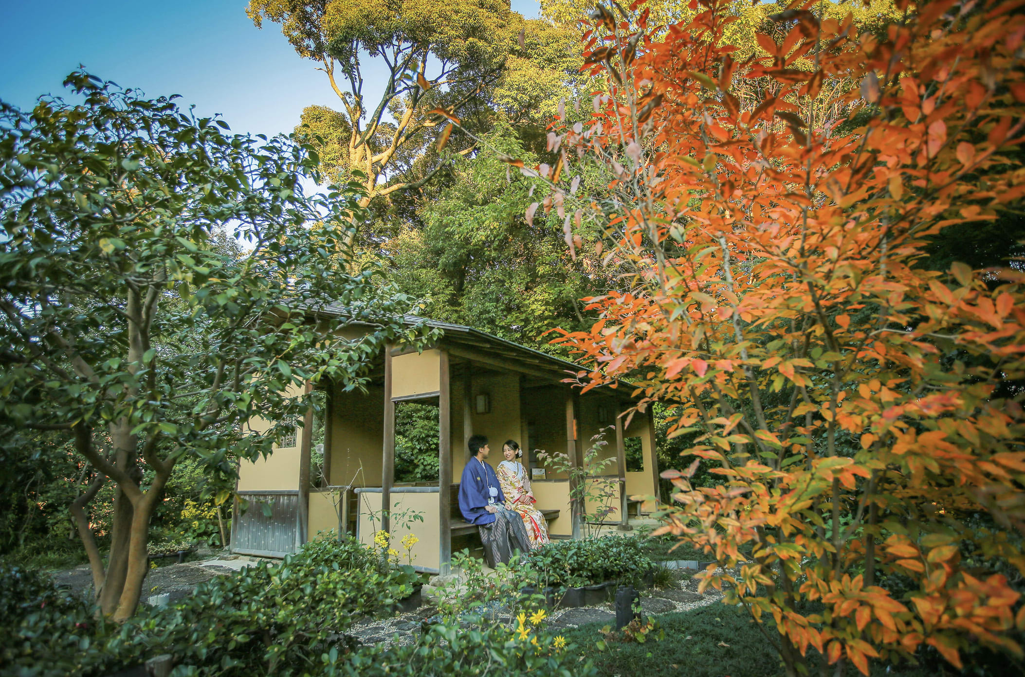 Tokugawaen is a prestigious Japanese garden representing Nagoya, featuring ponds, stone bridges, and seasonal plantings that create a serene backdrop. It complements both traditional and Western attire, allowing elegant pre-wedding photos with natural light.