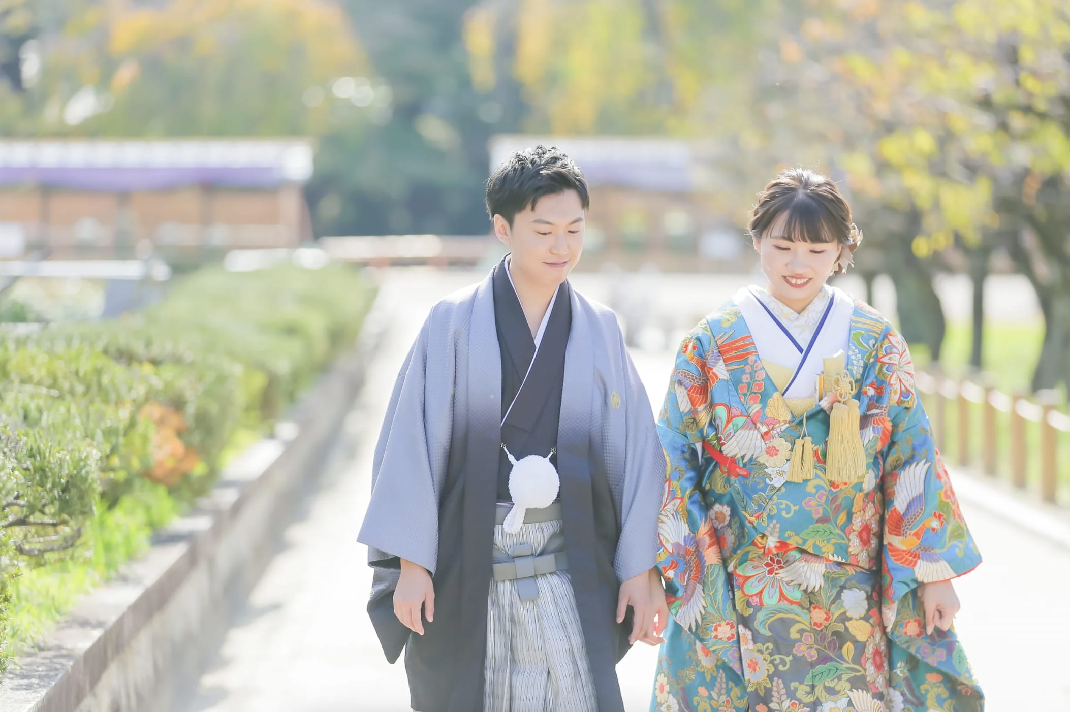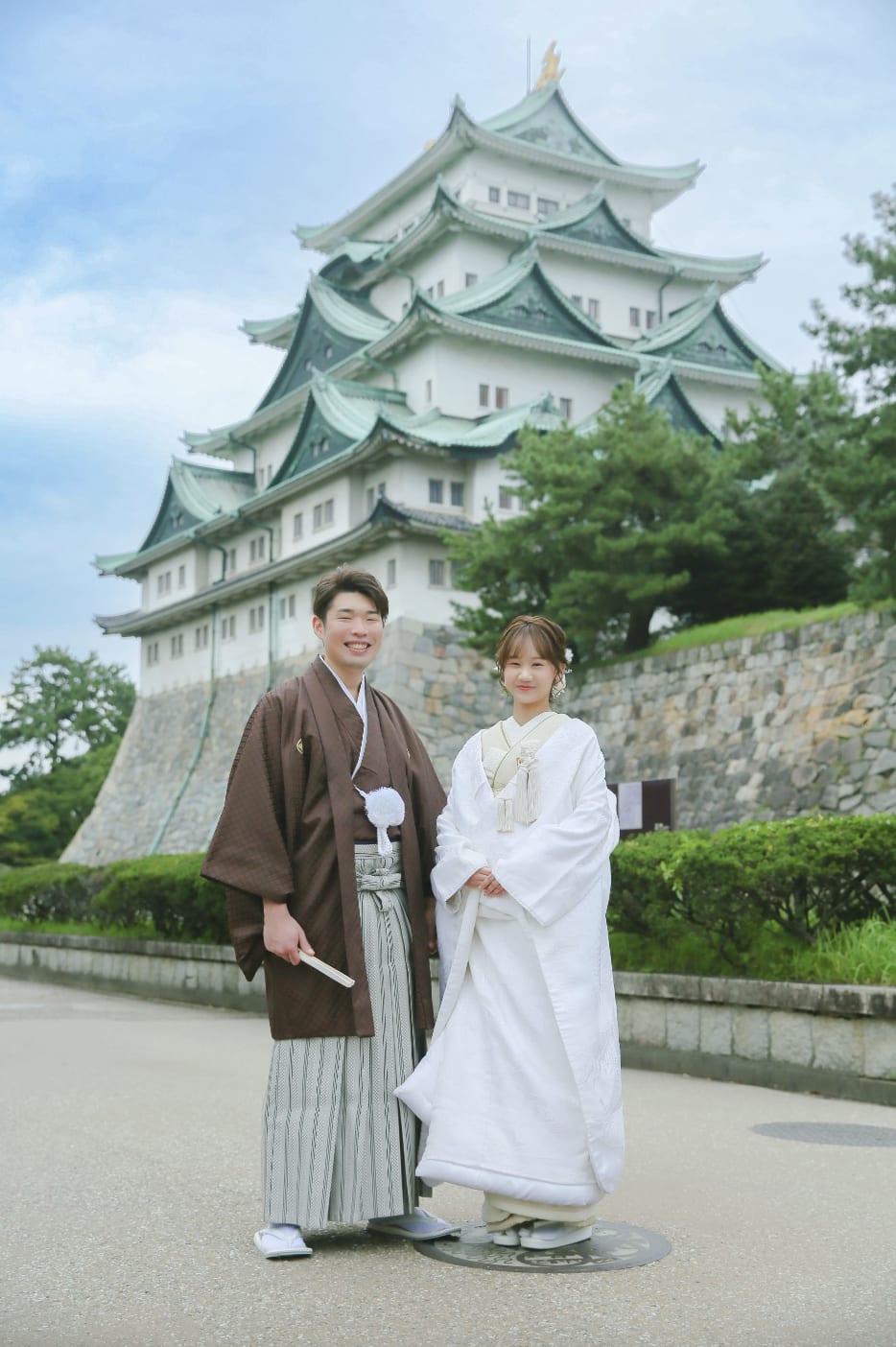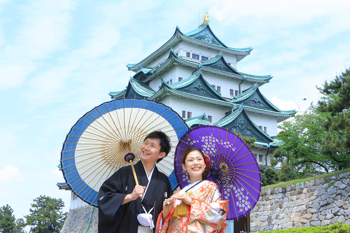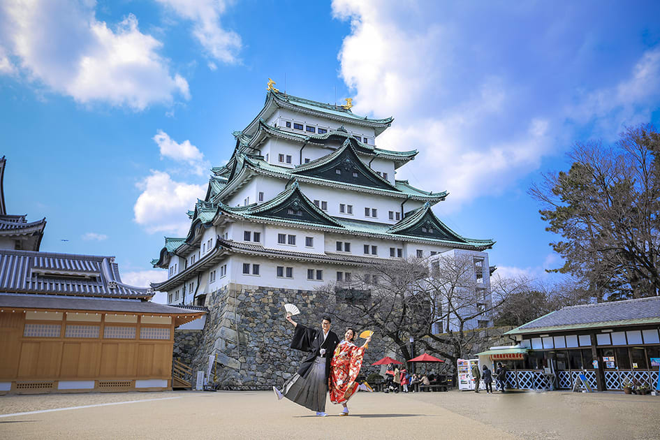 Nagoya Castle is a popular location featuring a majestic keep and stone walls that convey history and grandeur. The sweeping landscape surrounding the castle provides a sense of scale, ideal for pre-wedding photography that highlights Japanese culture.