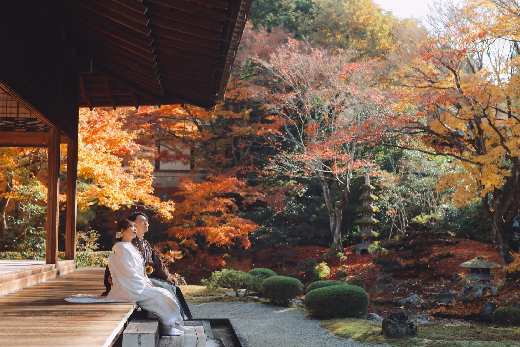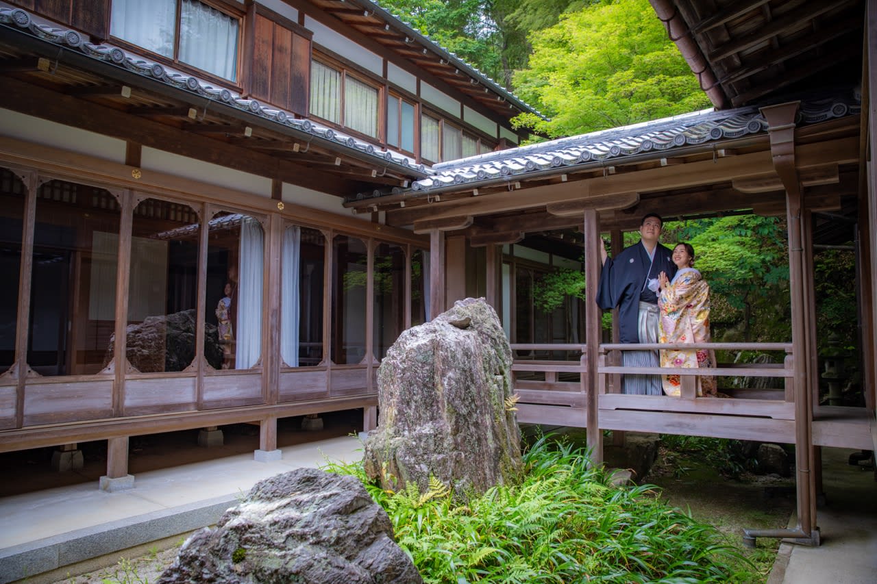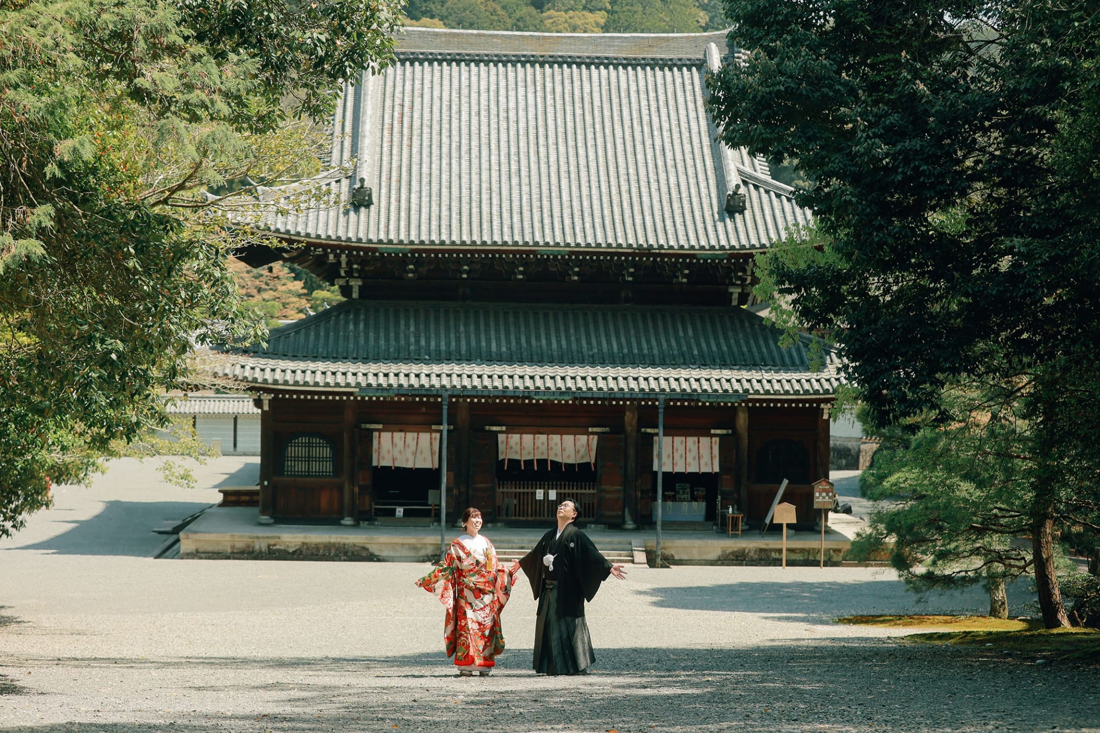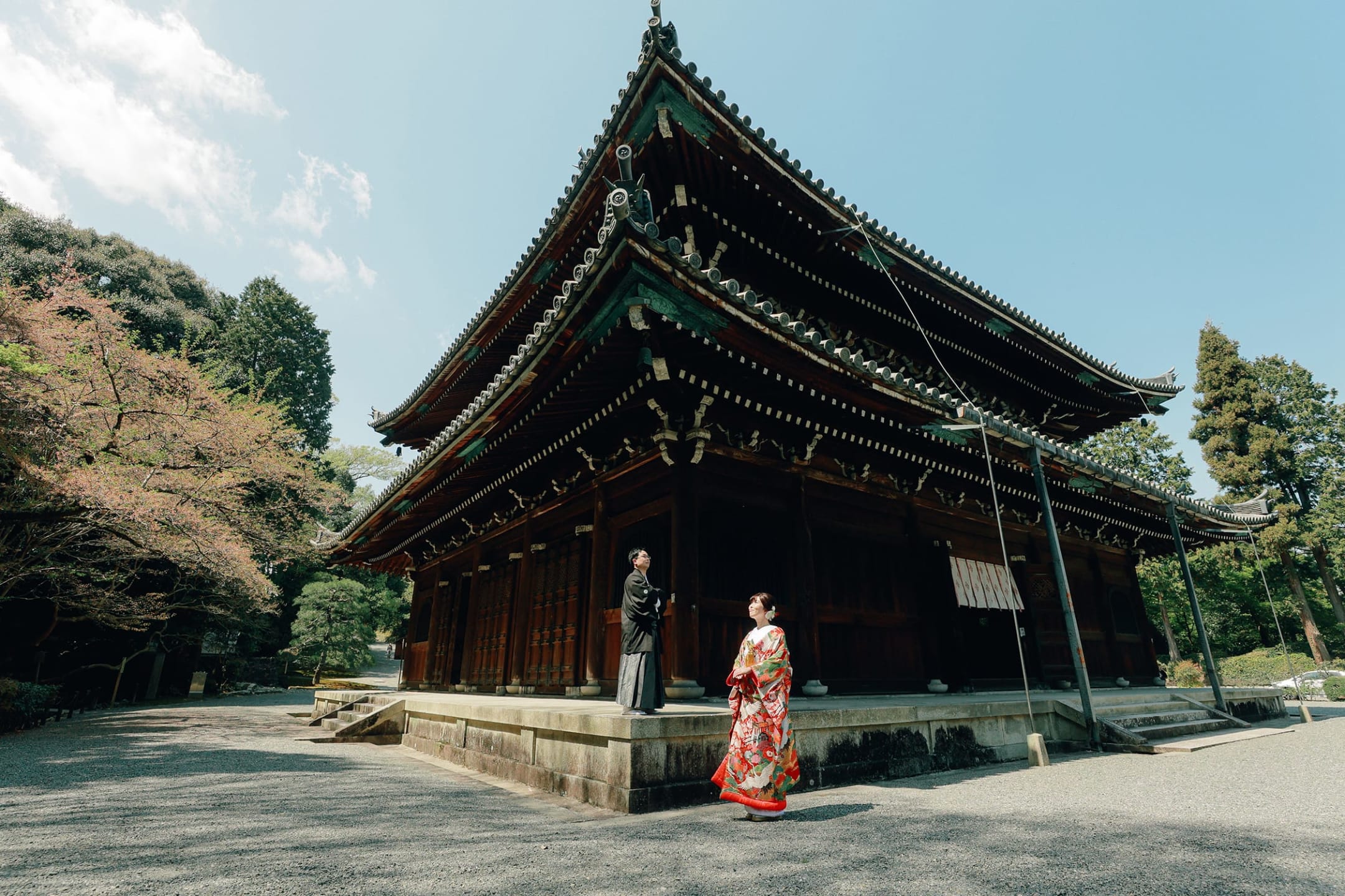 Sennyu-ji harmonizes dignified temple buildings with lush moss gardens. The tranquil, seasonally colored grounds suit both Japanese and Western attire, offering portraits with a sense of depth.