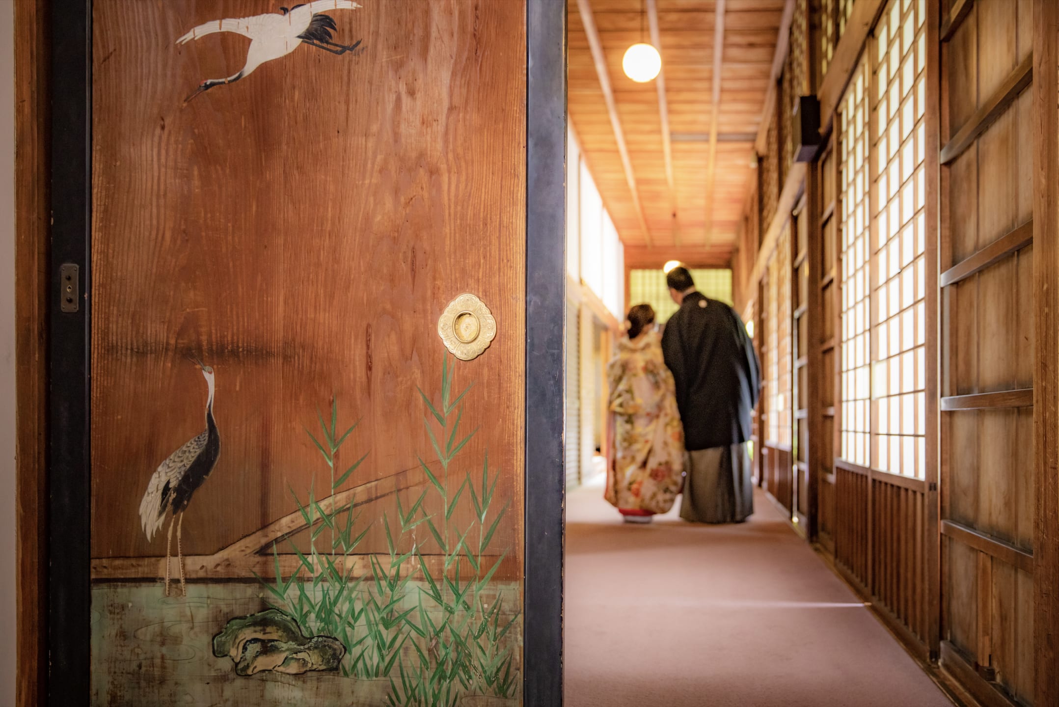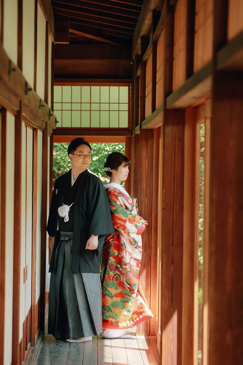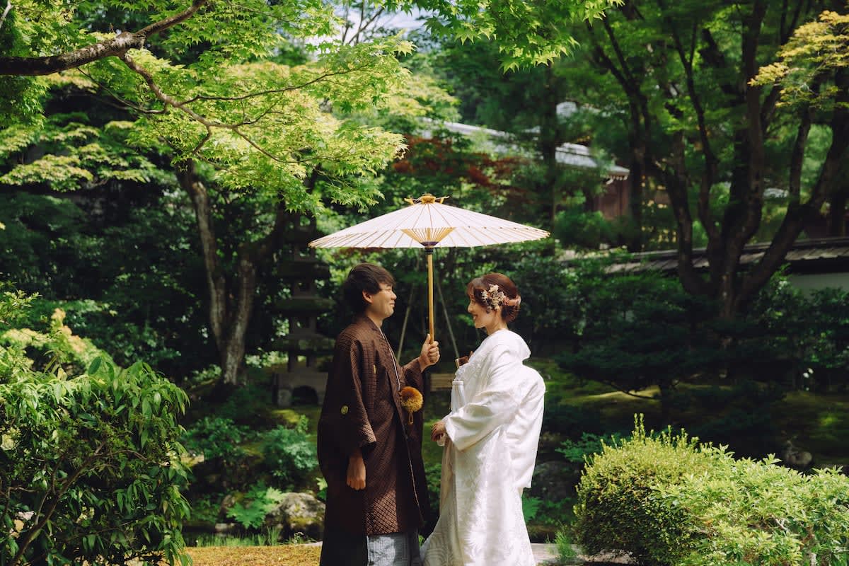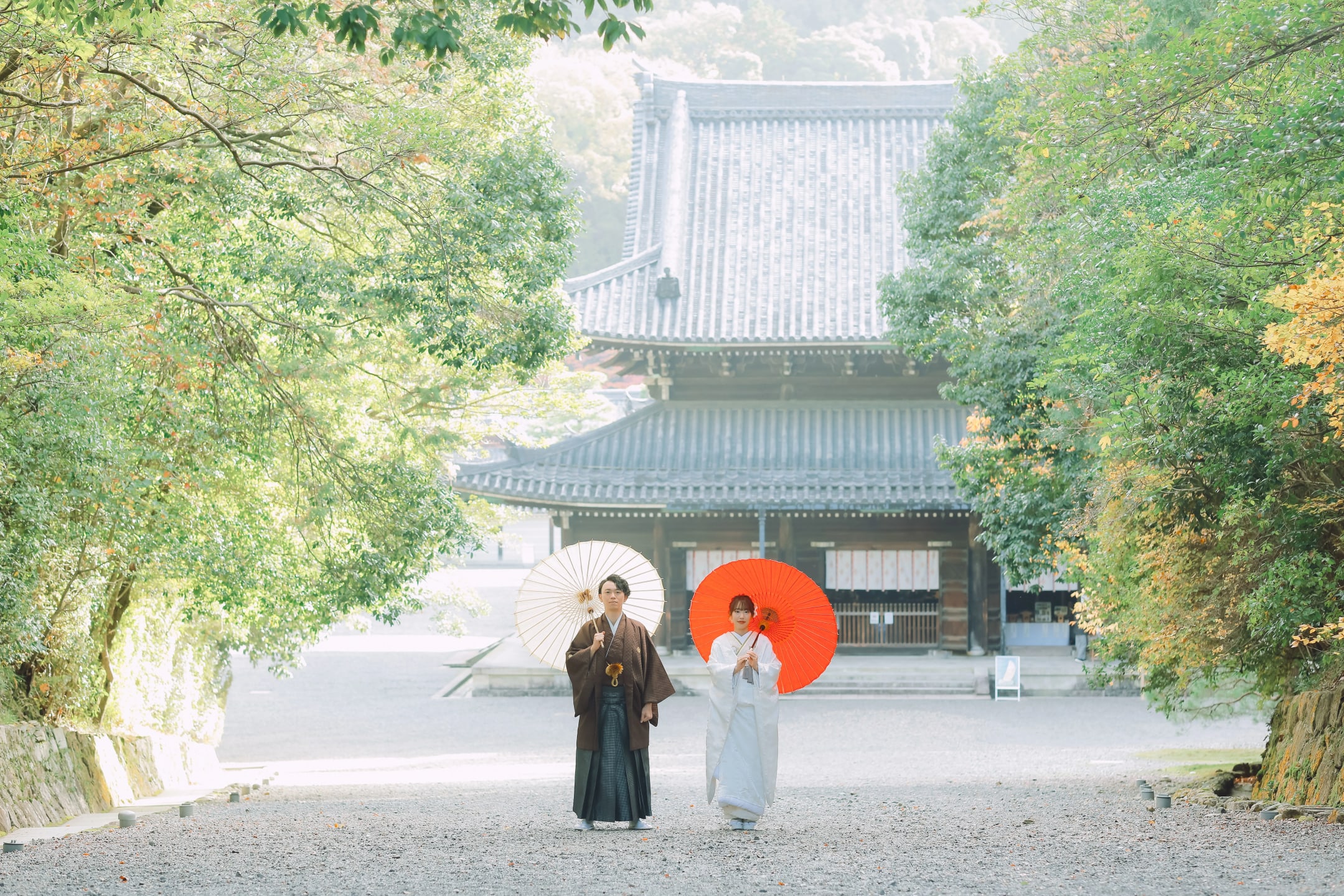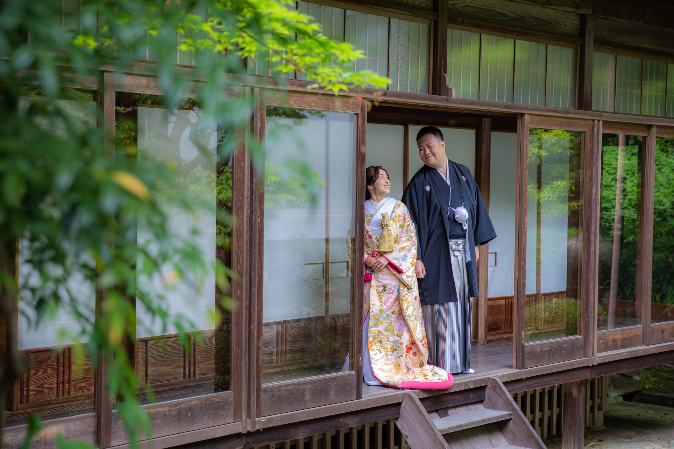 Sennyu-ji harmonizes dignified temple buildings with lush moss gardens. The tranquil, seasonally colored grounds suit both Japanese and Western attire, offering portraits with a sense of depth.