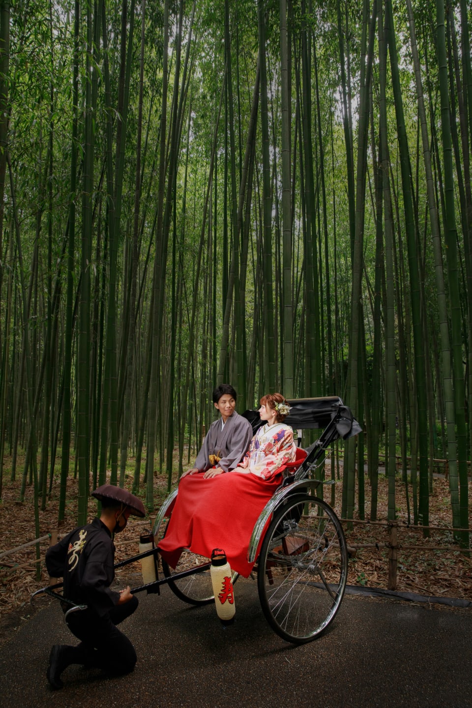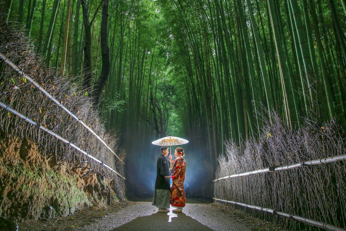 The Arashiyama bamboo grove forms a magical green tunnel, creating a dreamy background that complements both Japanese and Western outfits. The changing light throughout the seasons allows for serene and natural portraits.