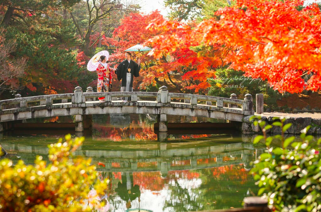 Maruyama Park is one of Kyoto’s most scenic green spaces, offering ponds, walking paths, and seasonal foliage. Its gentle light and lush nature are perfect for natural, relaxed pre-wedding photography.