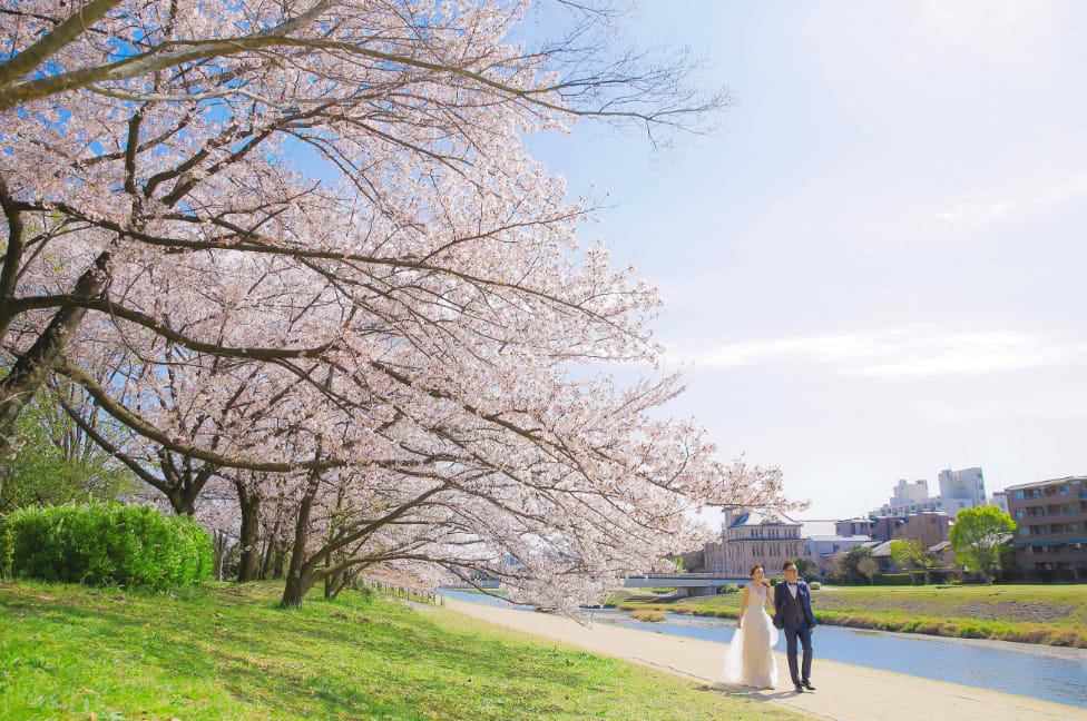 The Kamo River is an iconic Kyoto location, perfect for relaxed pre-wedding photography. Its riverside paths and seasonal scenery provide natural, expressive backgrounds throughout the year.