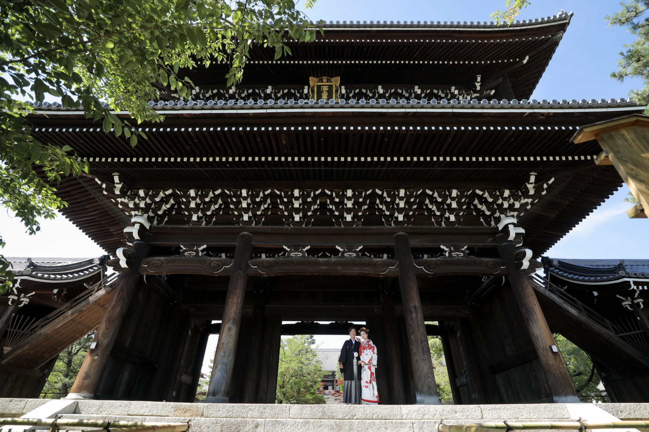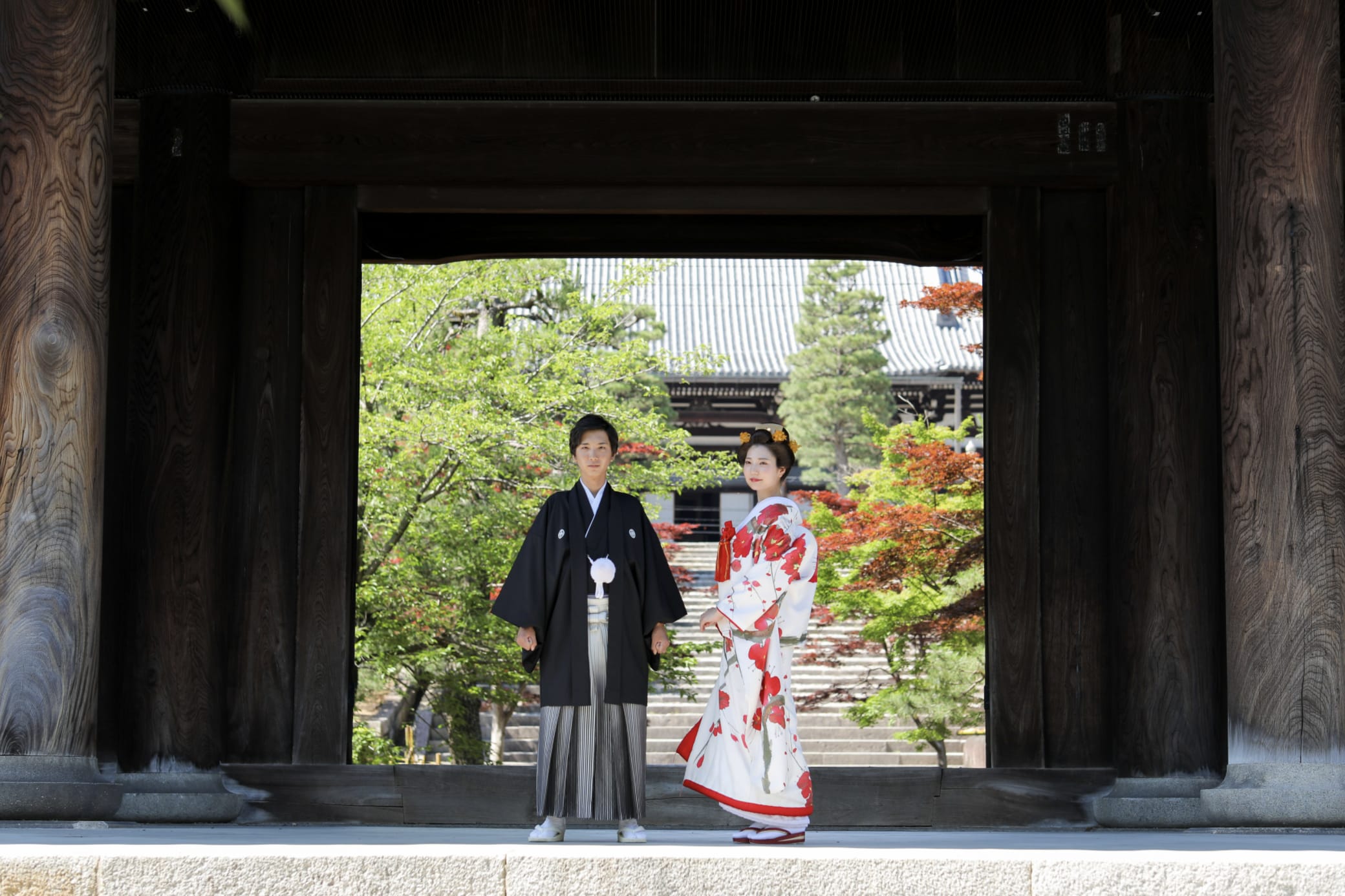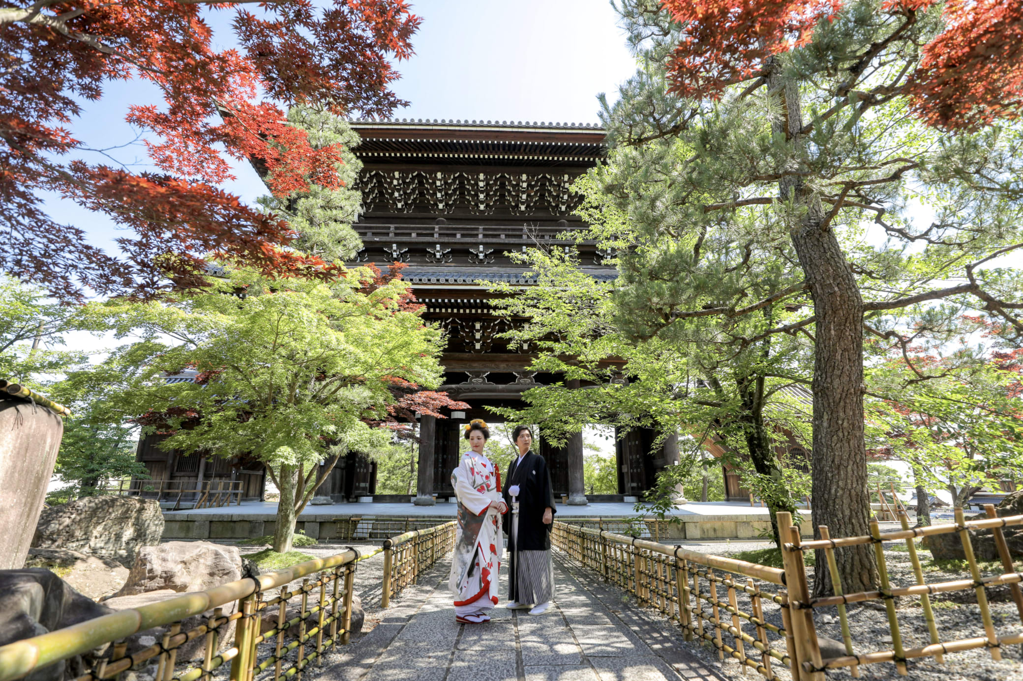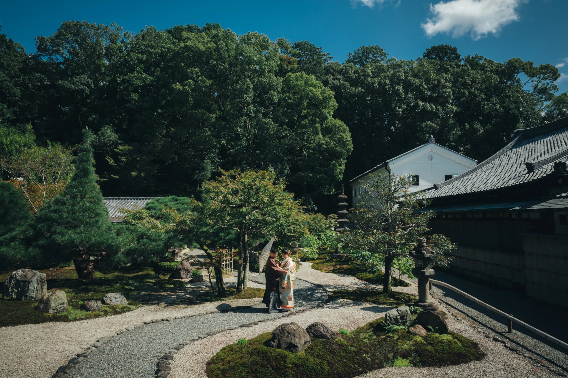 Konkai Komyo-ji is a historic temple with imposing stone structures and moss gardens that create a calm, dignified backdrop. Its strong affinity with Japanese attire brings out the temple’s refined and solemn atmosphere.
