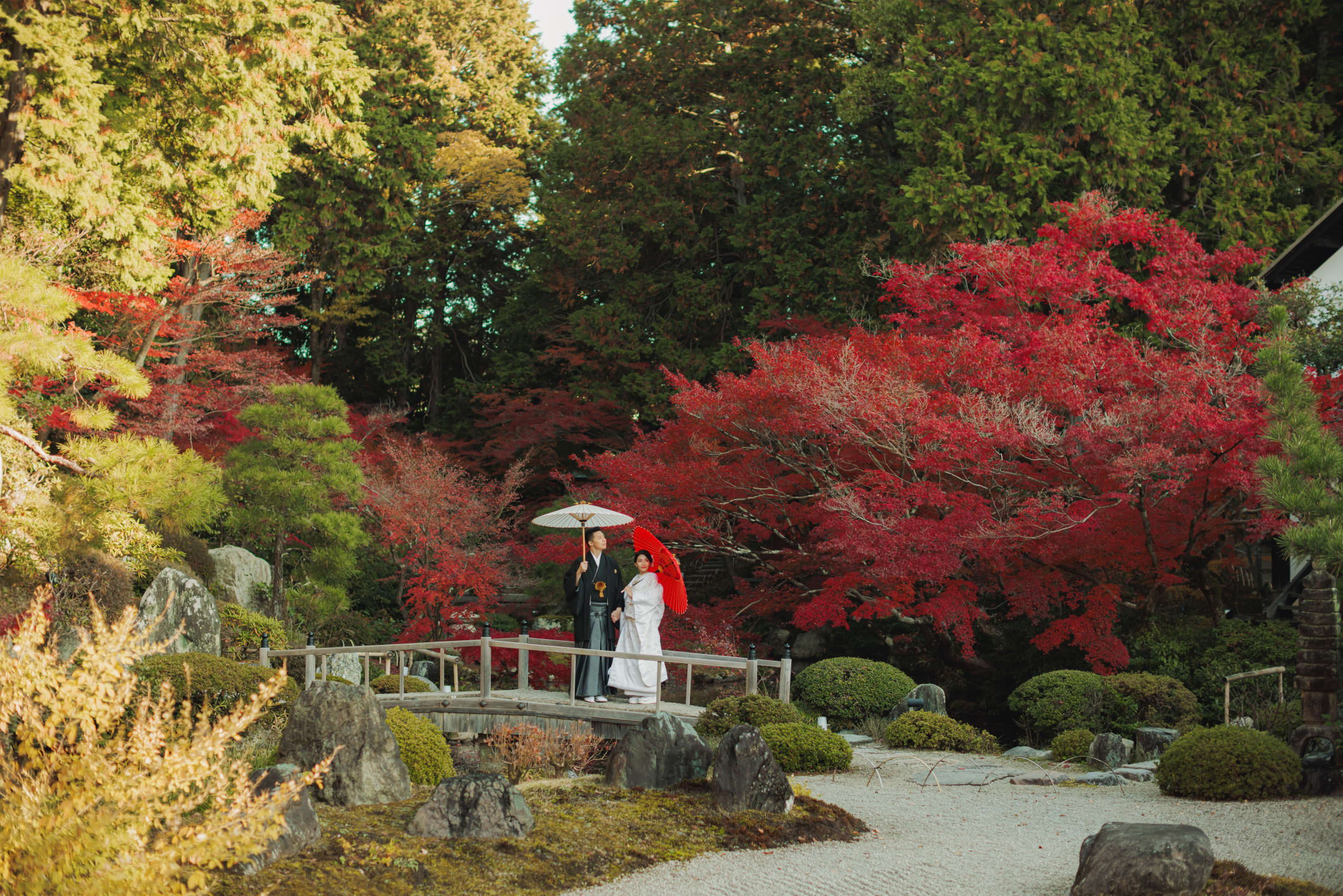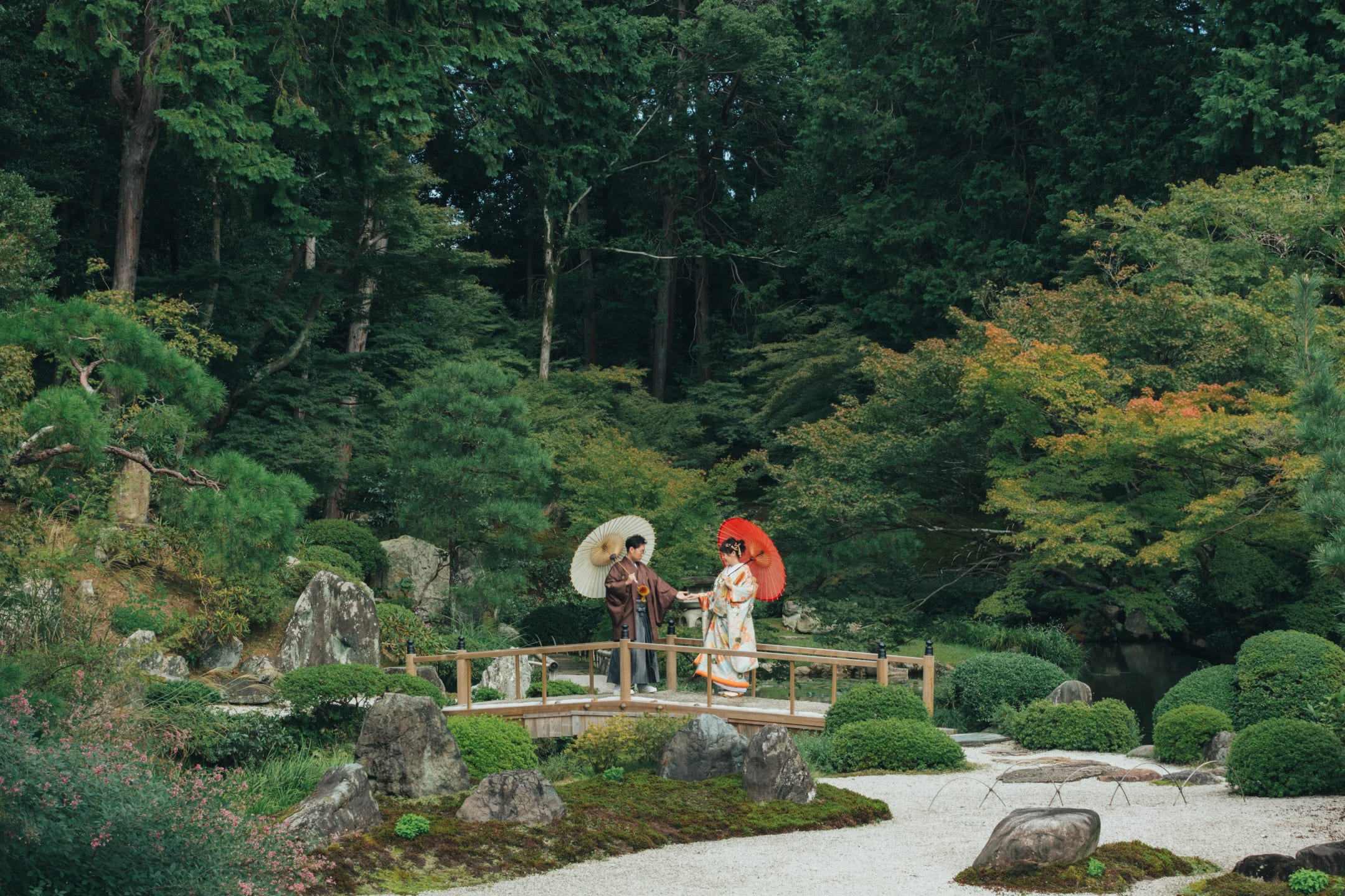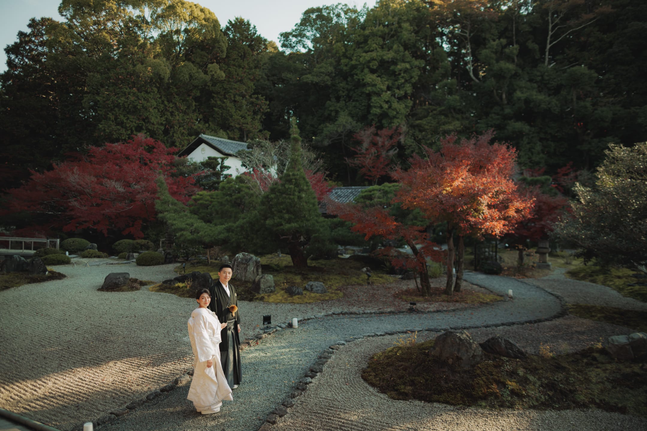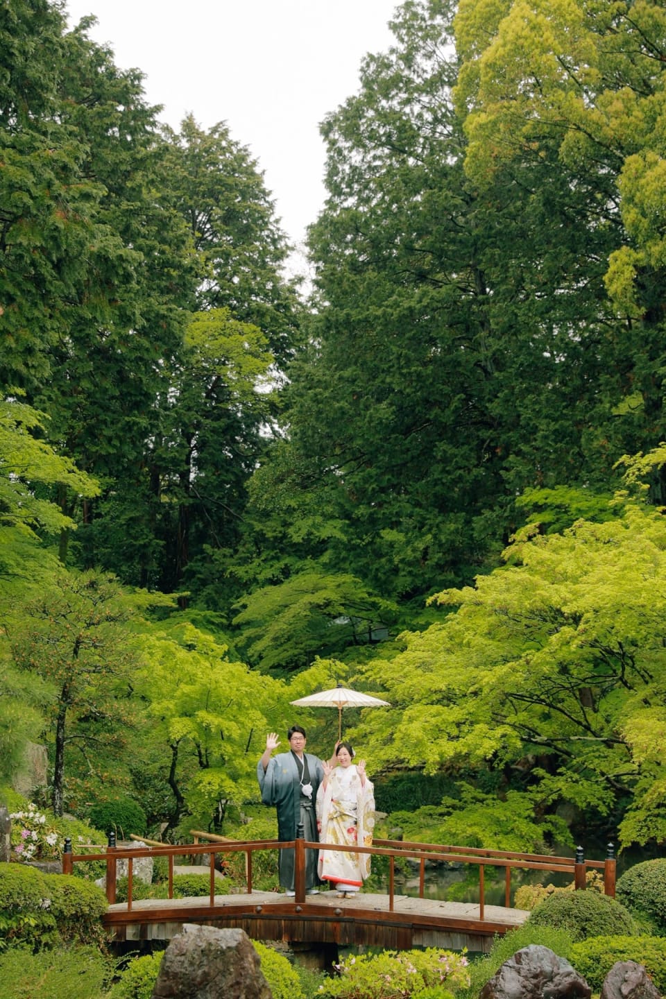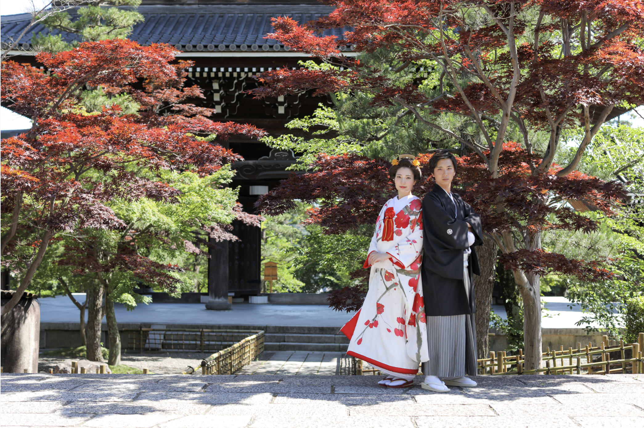 Konkai Komyo-ji is a historic temple with imposing stone structures and moss gardens that create a calm, dignified backdrop. Its strong affinity with Japanese attire brings out the temple’s refined and solemn atmosphere.