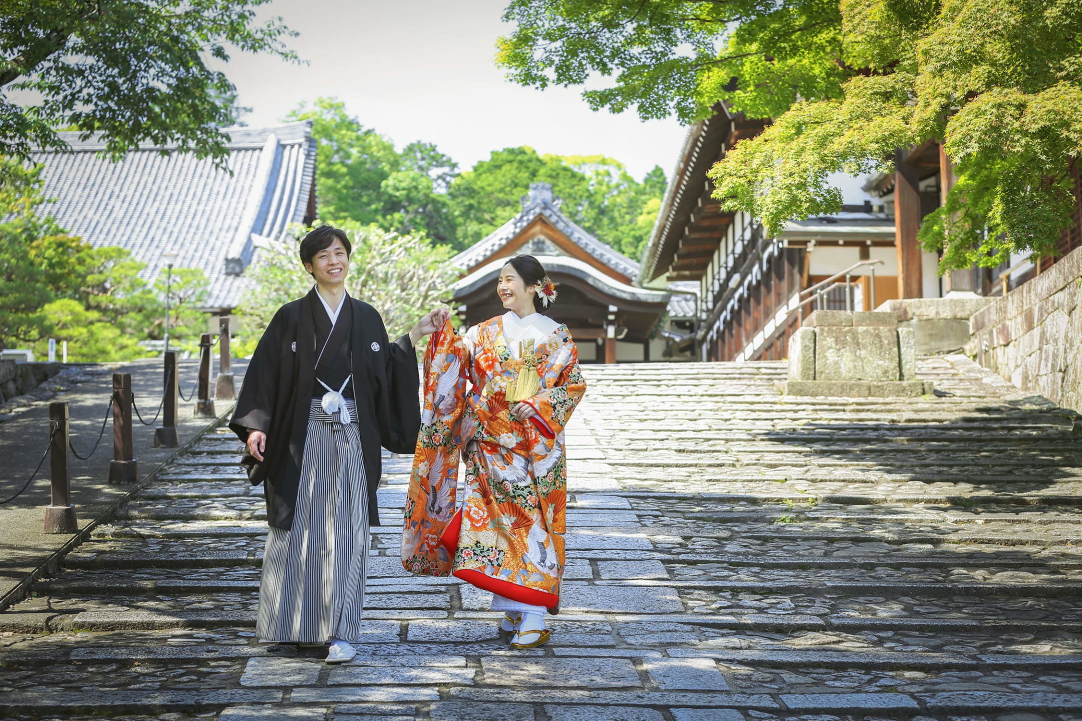 Konkai Komyo-ji is a historic temple with imposing stone structures and moss gardens that create a calm, dignified backdrop. Its strong affinity with Japanese attire brings out the temple’s refined and solemn atmosphere.
