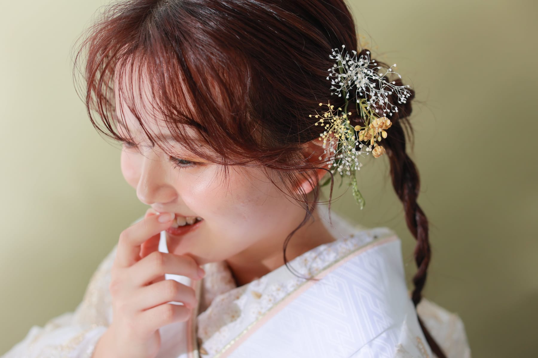 ワンポイント色味のあるメイク 最近はリボンを使ったヘアスタイルが好きです! 和装のカラーコーディネートも得意なので、 挑戦してみたいという方、ぜひお任せください^ ^ おふたりにとって素敵な思い出になるよう精一杯お手伝いさせていただきます!