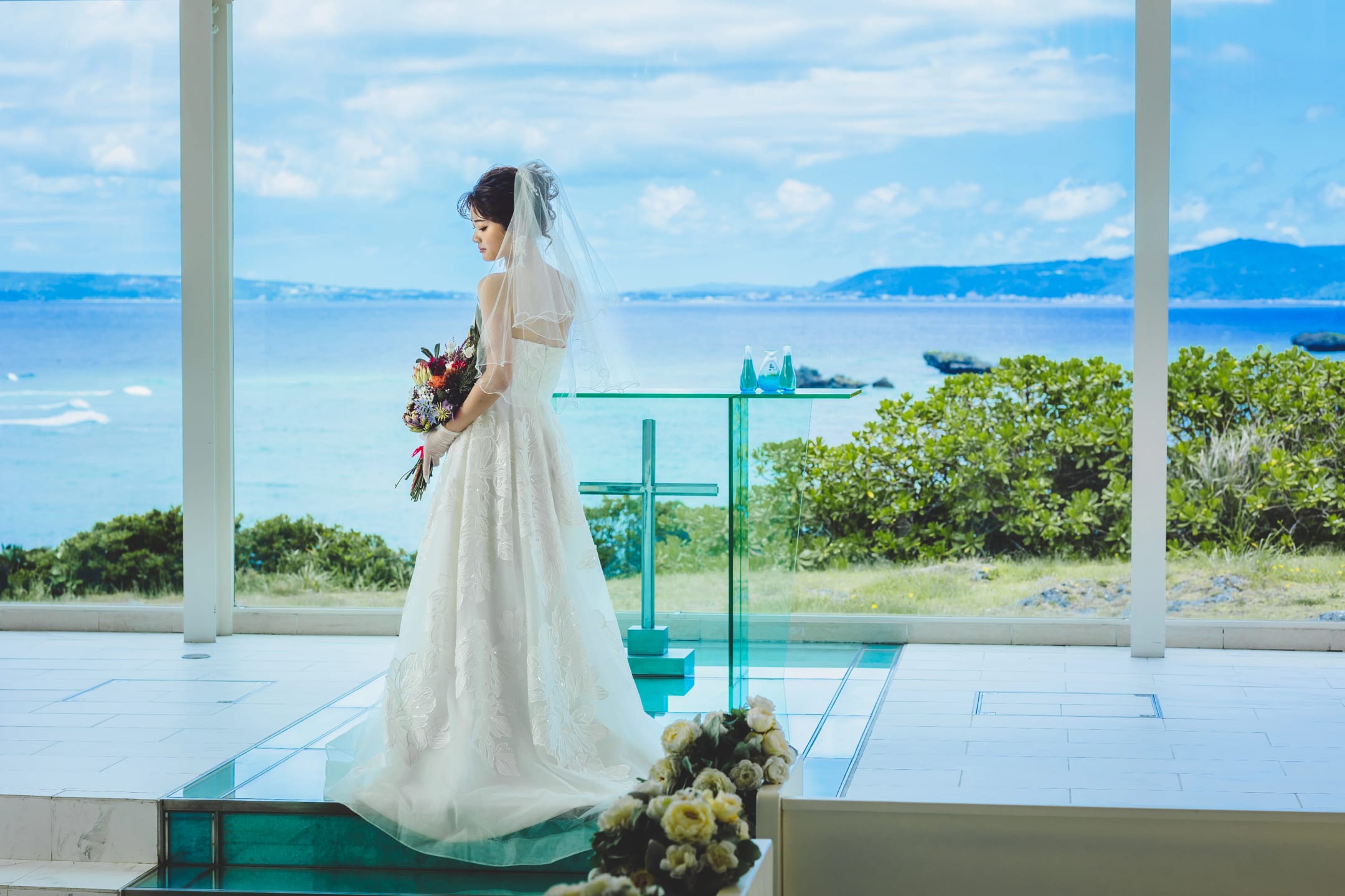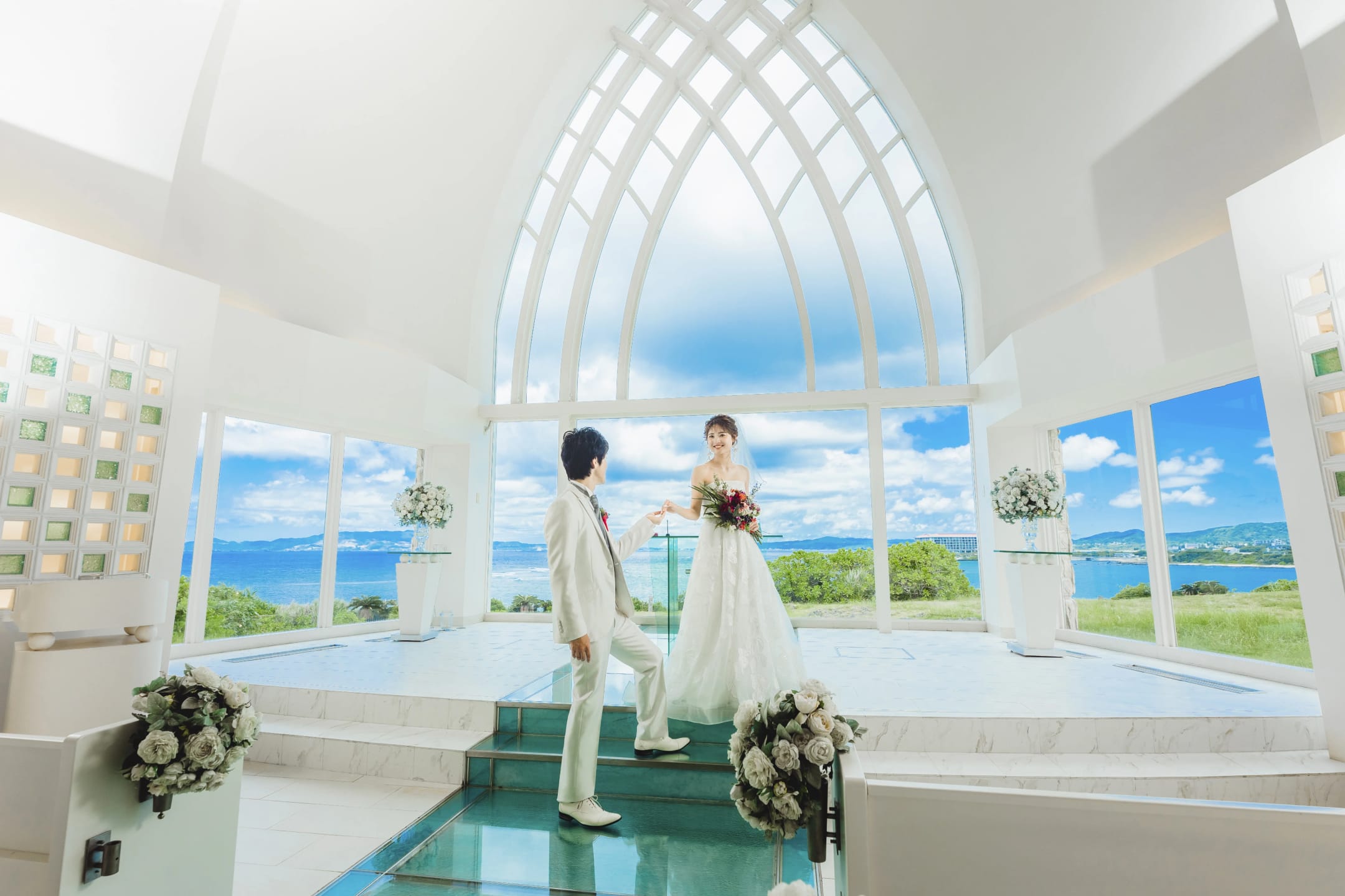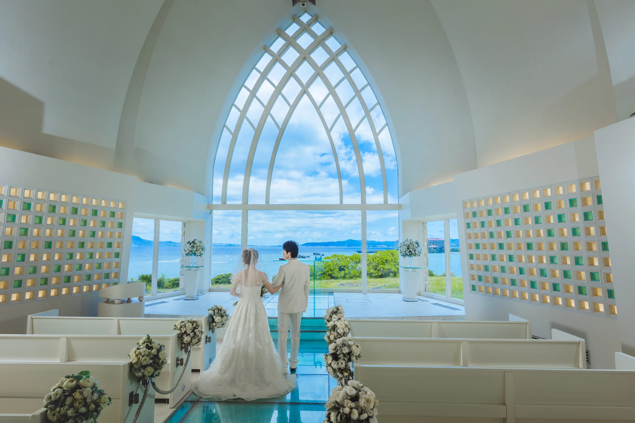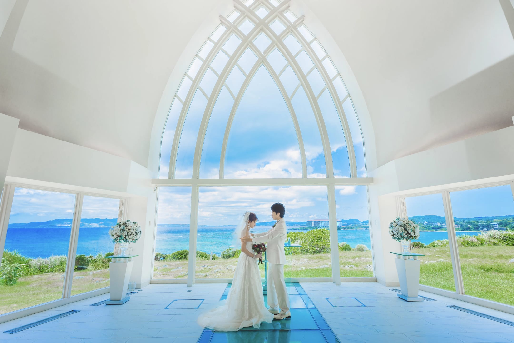 位於萬座毛附近的教堂能以廣闊的海景與天空為背景,拍攝充滿度假氛圍的婚紗照片,呈現與日常截然不同的特別畫面。