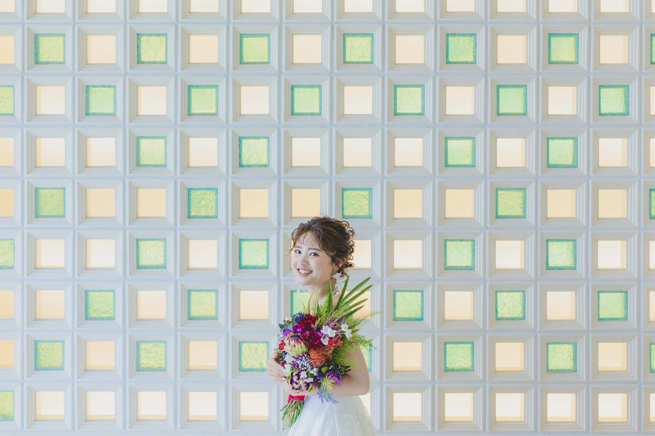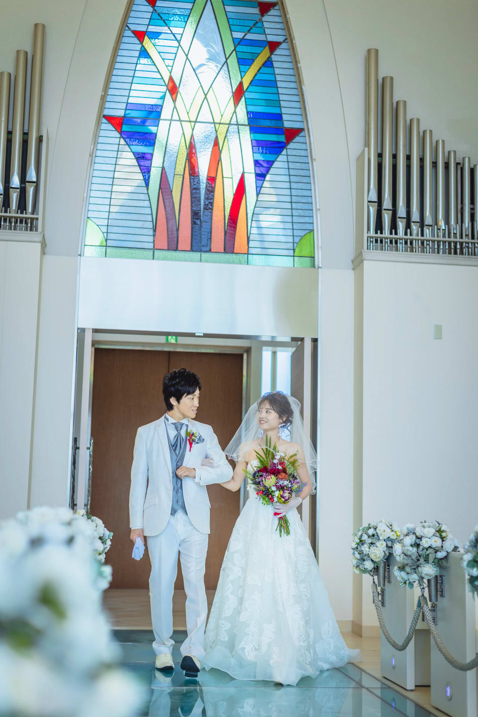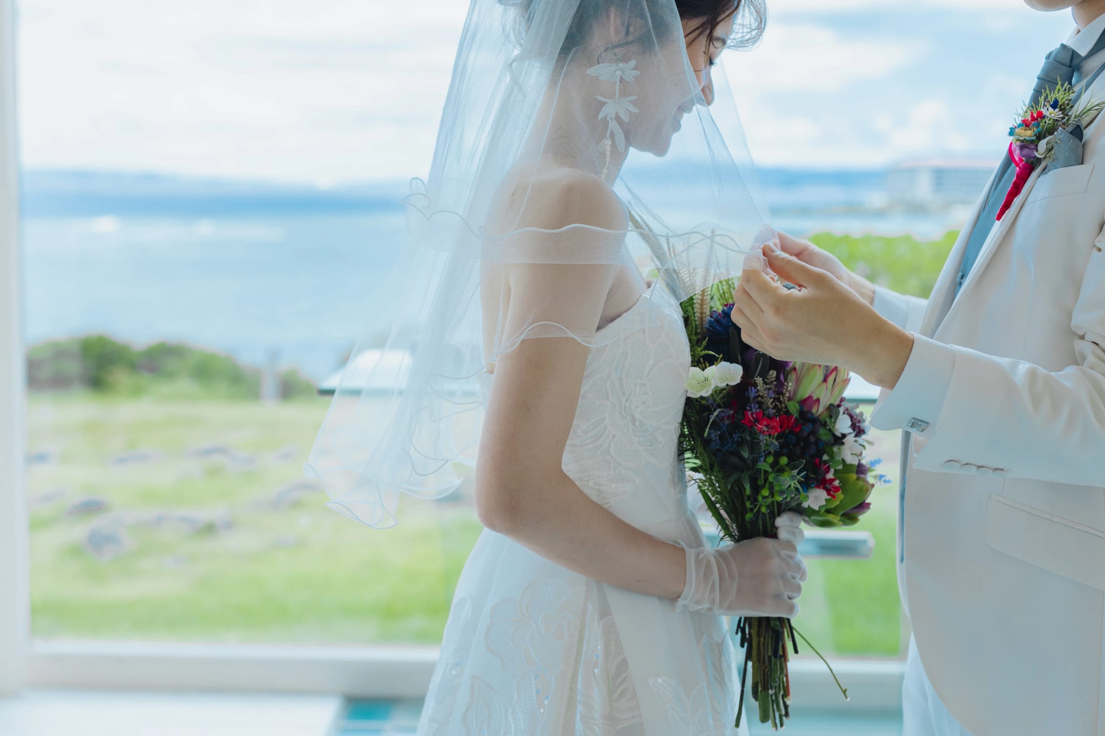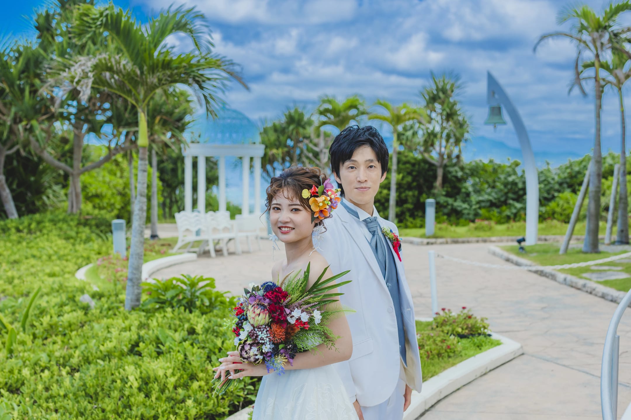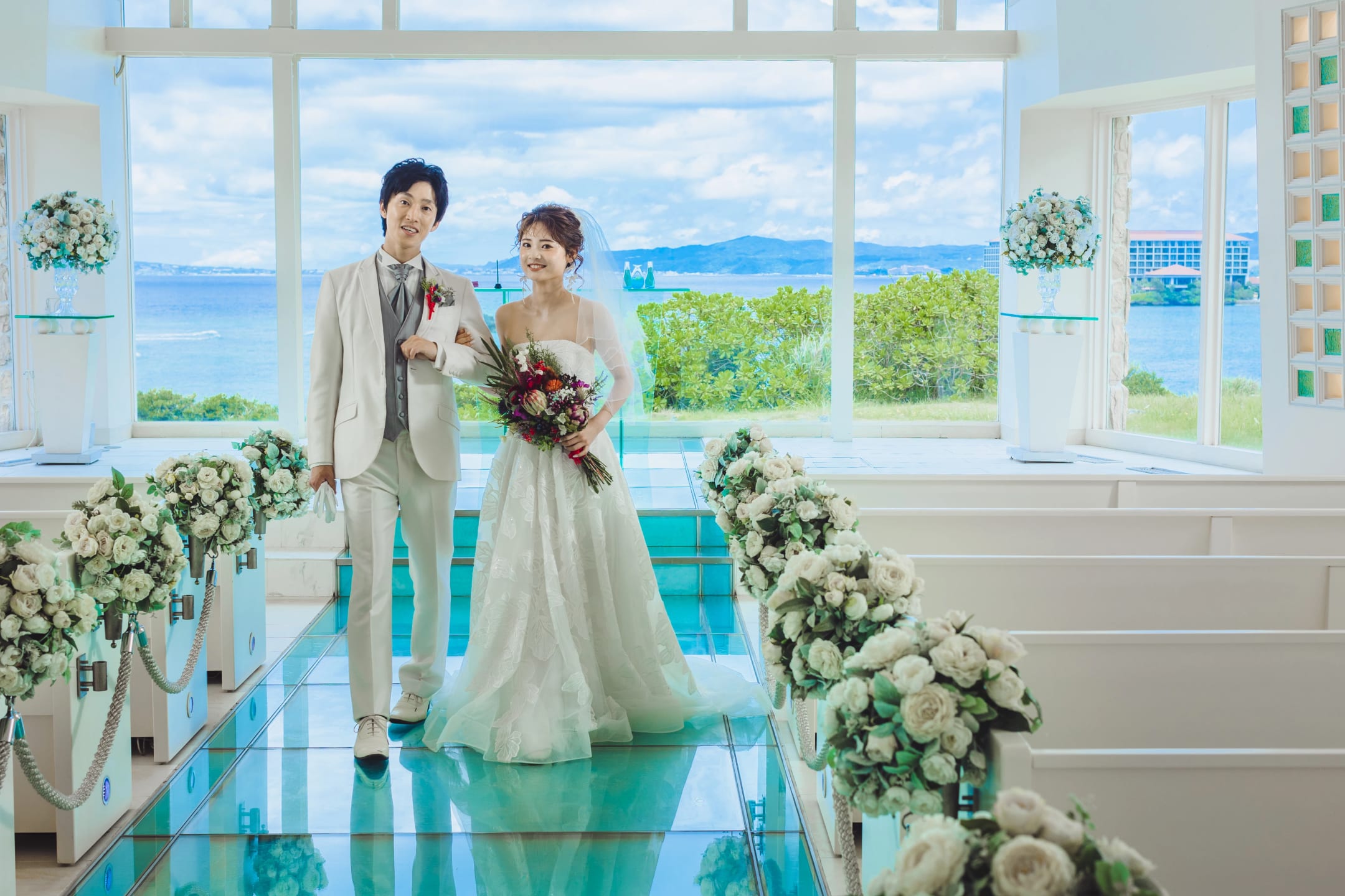 位於萬座毛附近的教堂能以廣闊的海景與天空為背景,拍攝充滿度假氛圍的婚紗照片,呈現與日常截然不同的特別畫面。