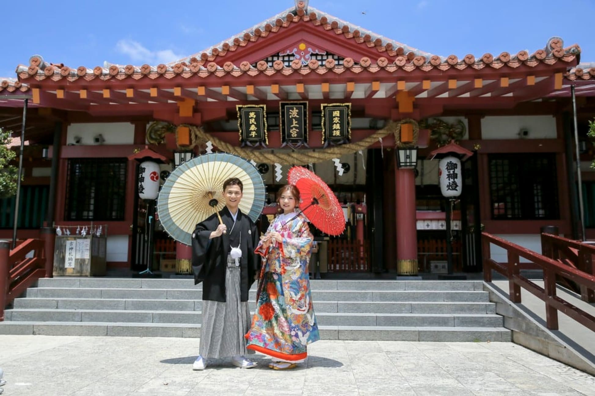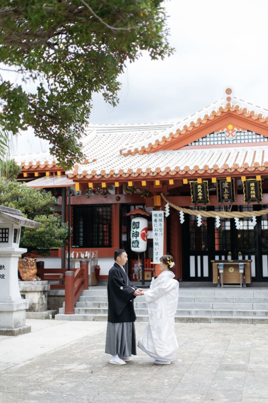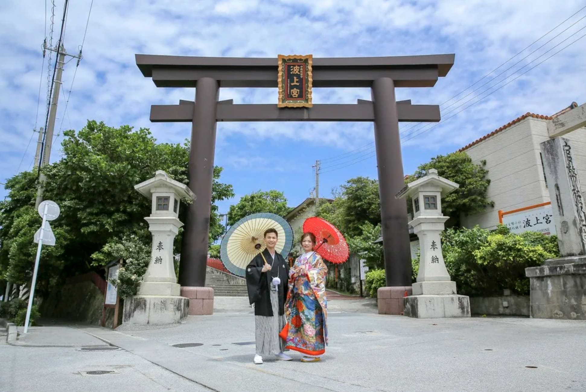 建於俯瞰大海的懸崖上的波上宮,可同時捕捉神聖氛圍與海景。特別適和服拍攝,神社的靜謐與海景的動態相互融合,呈現平衡又豐富的畫面。