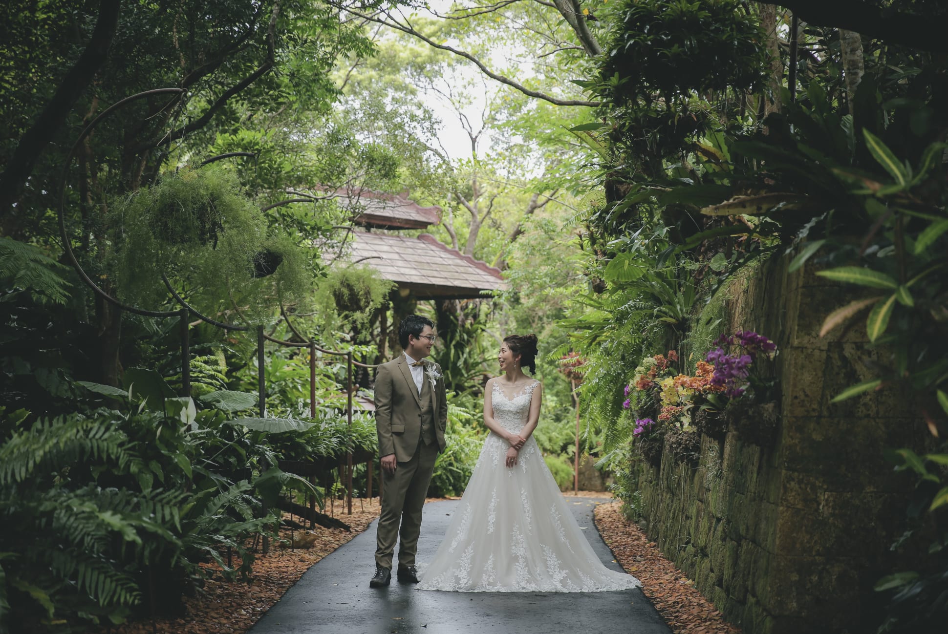 被熱帶植物環繞的 Bios Hill,適合拍攝自然風格的婚紗照。四季花卉與灑落的光線營造柔和氛圍。