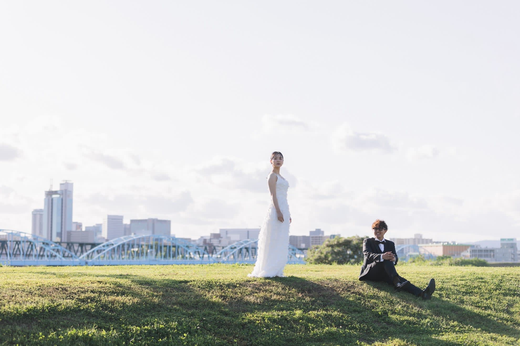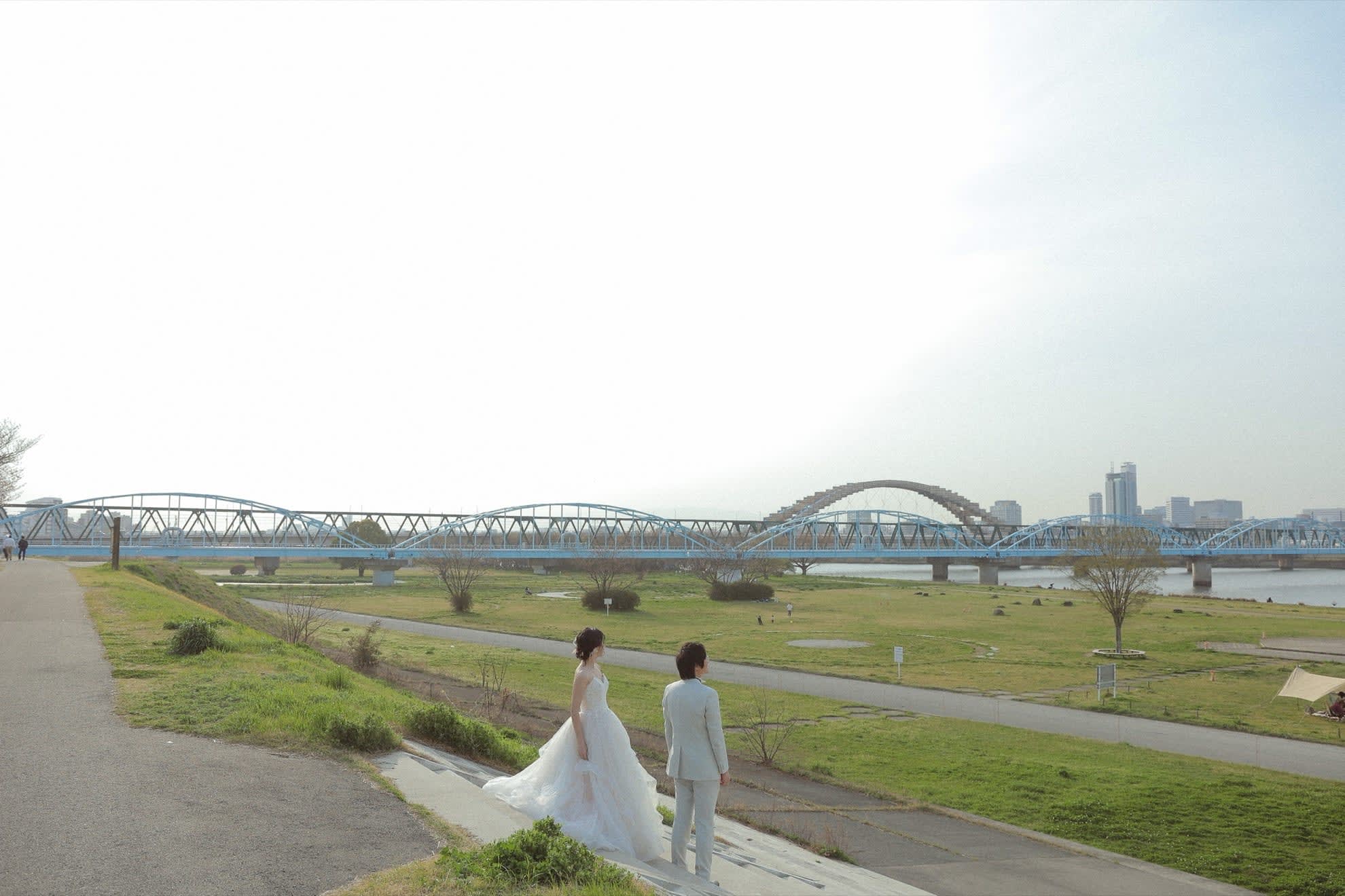 毛馬的河川堤岸以河畔自然景觀為特色,是適合婚紗拍攝的地點。寬廣的水邊景緻能運用柔和光線與天空,呈現自然純淨的照片。