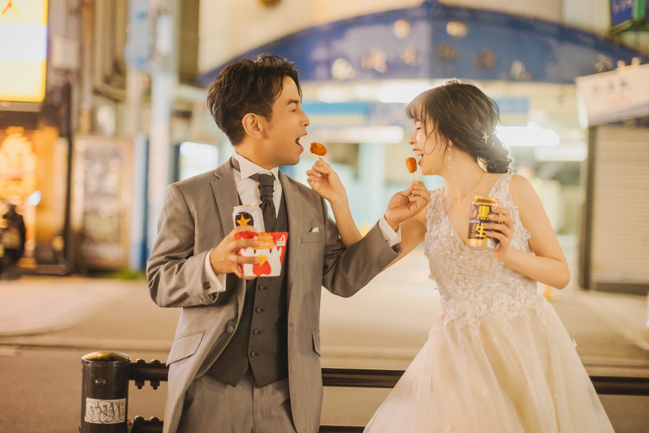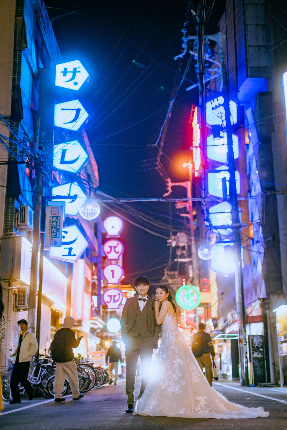 象徵大阪的名城「大阪城」,以雄偉的石垣與天守閣作為背景,是極具震撼力的拍攝地點。歷史的威嚴與公園寬廣的綠意相互襯托,可拍出具有壯觀尺度感的婚紗照。
