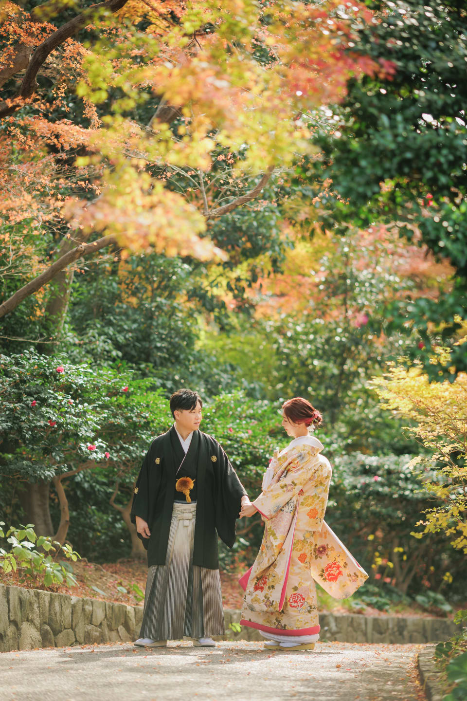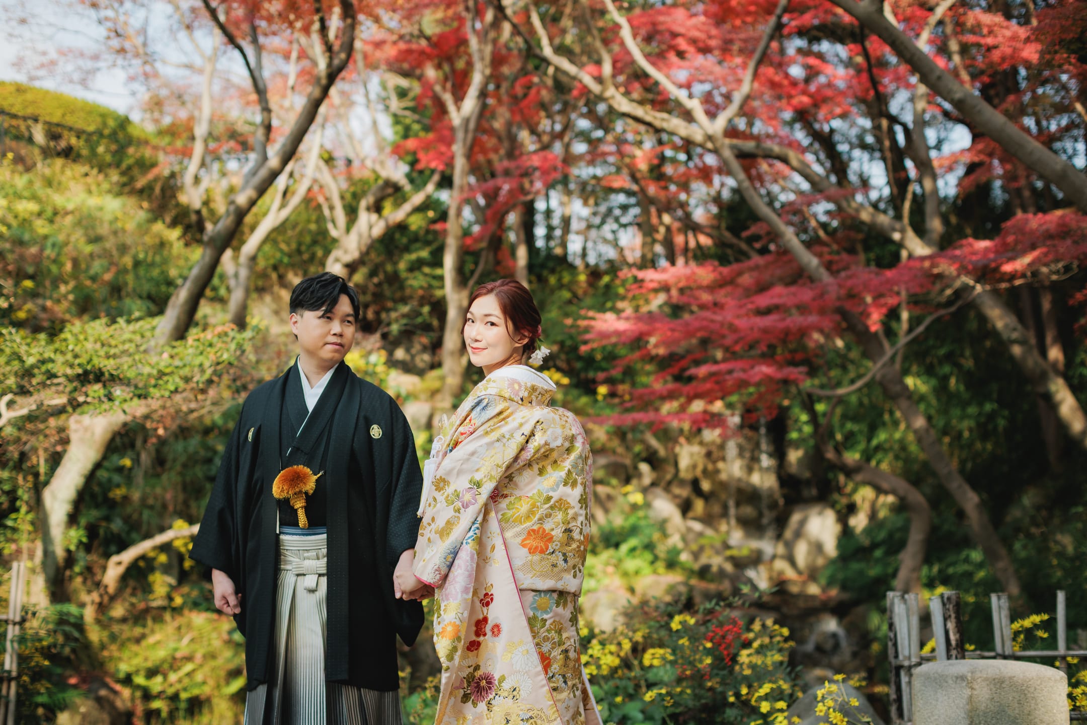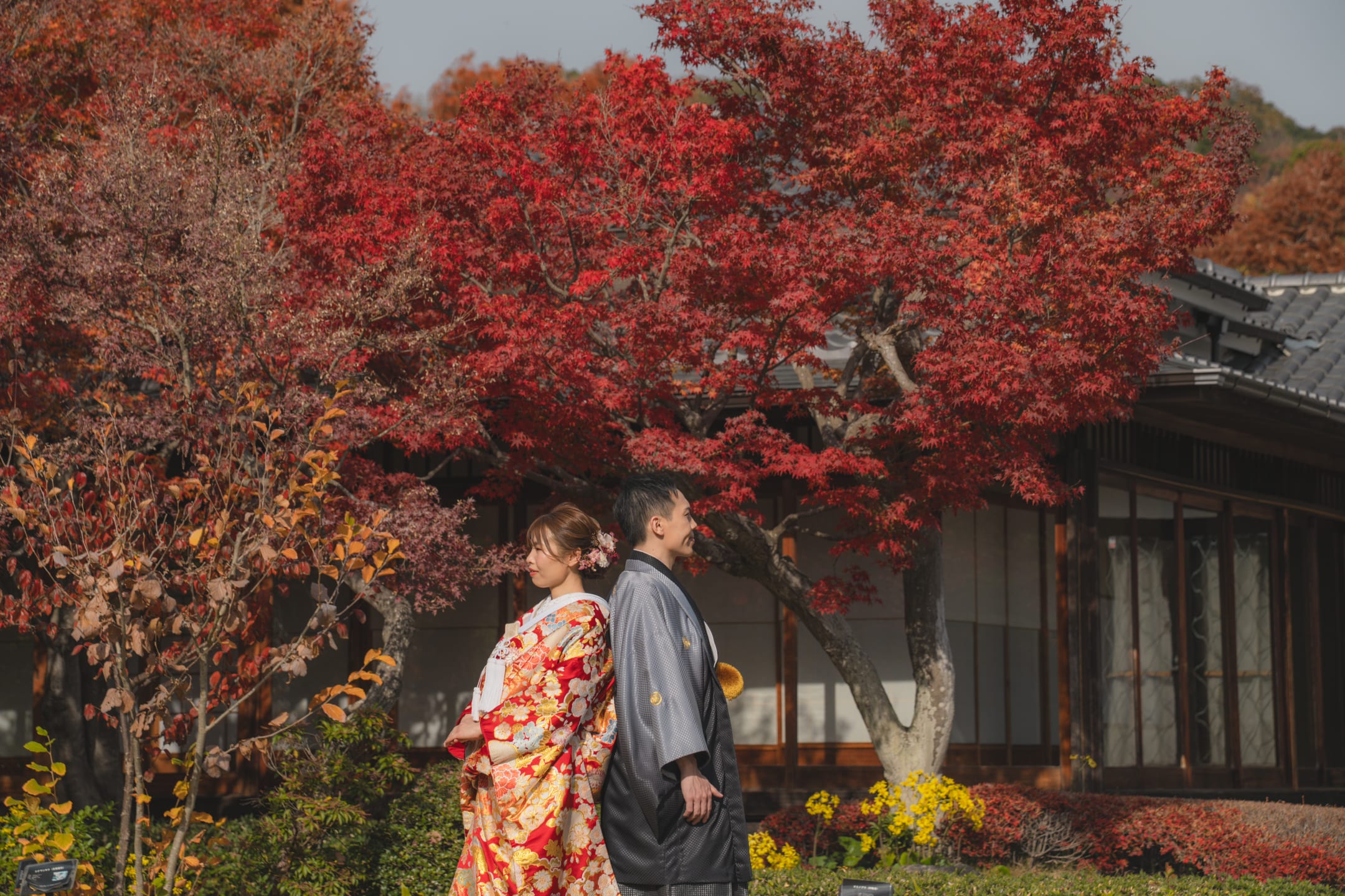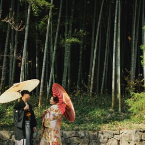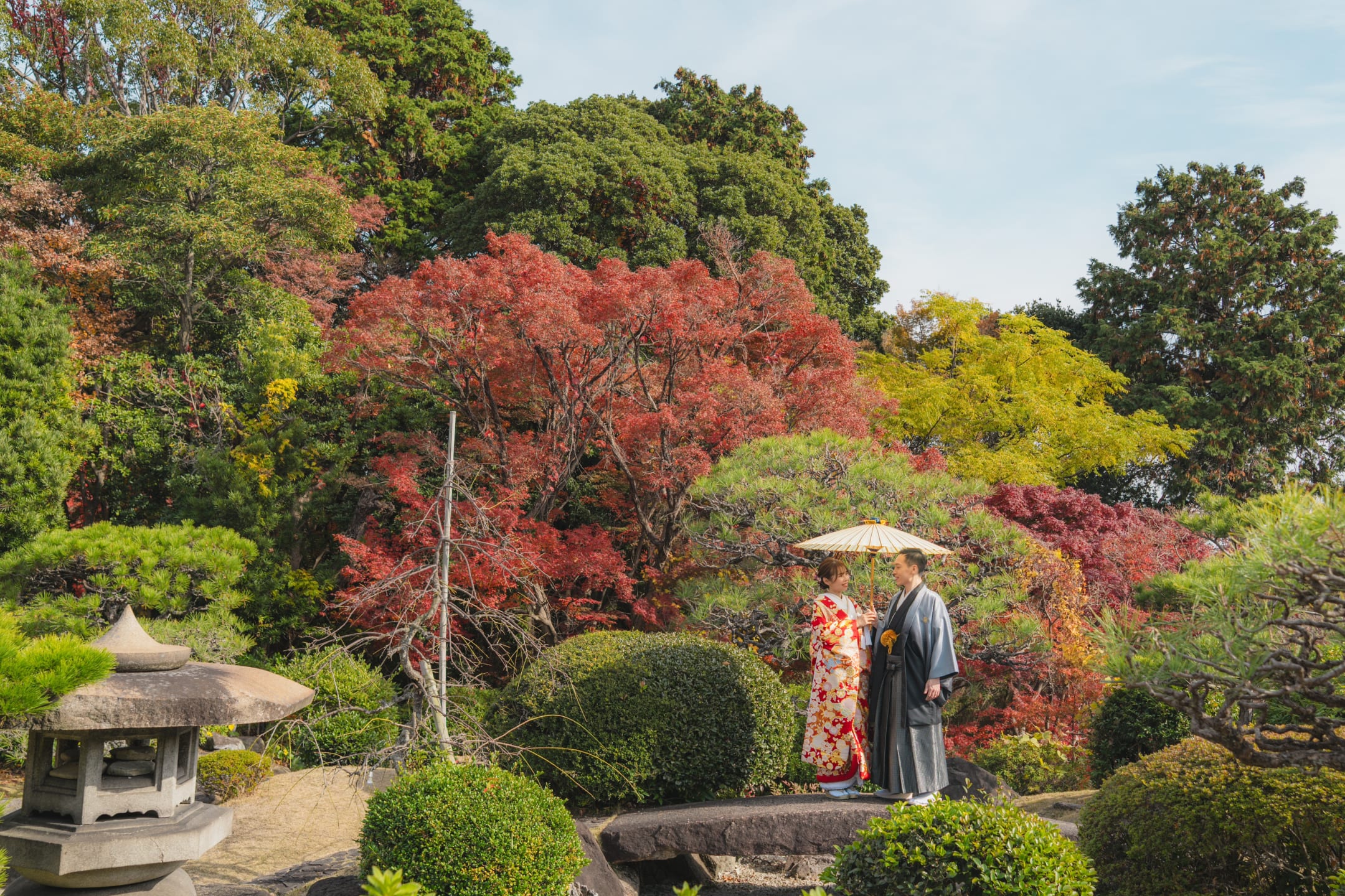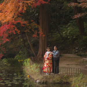 相樂園為四季植栽美麗的日本庭園,以池泉與傳統建築構圖,能拍攝雅致的和裝預拍。自然光與靜謐環境相互襯托。