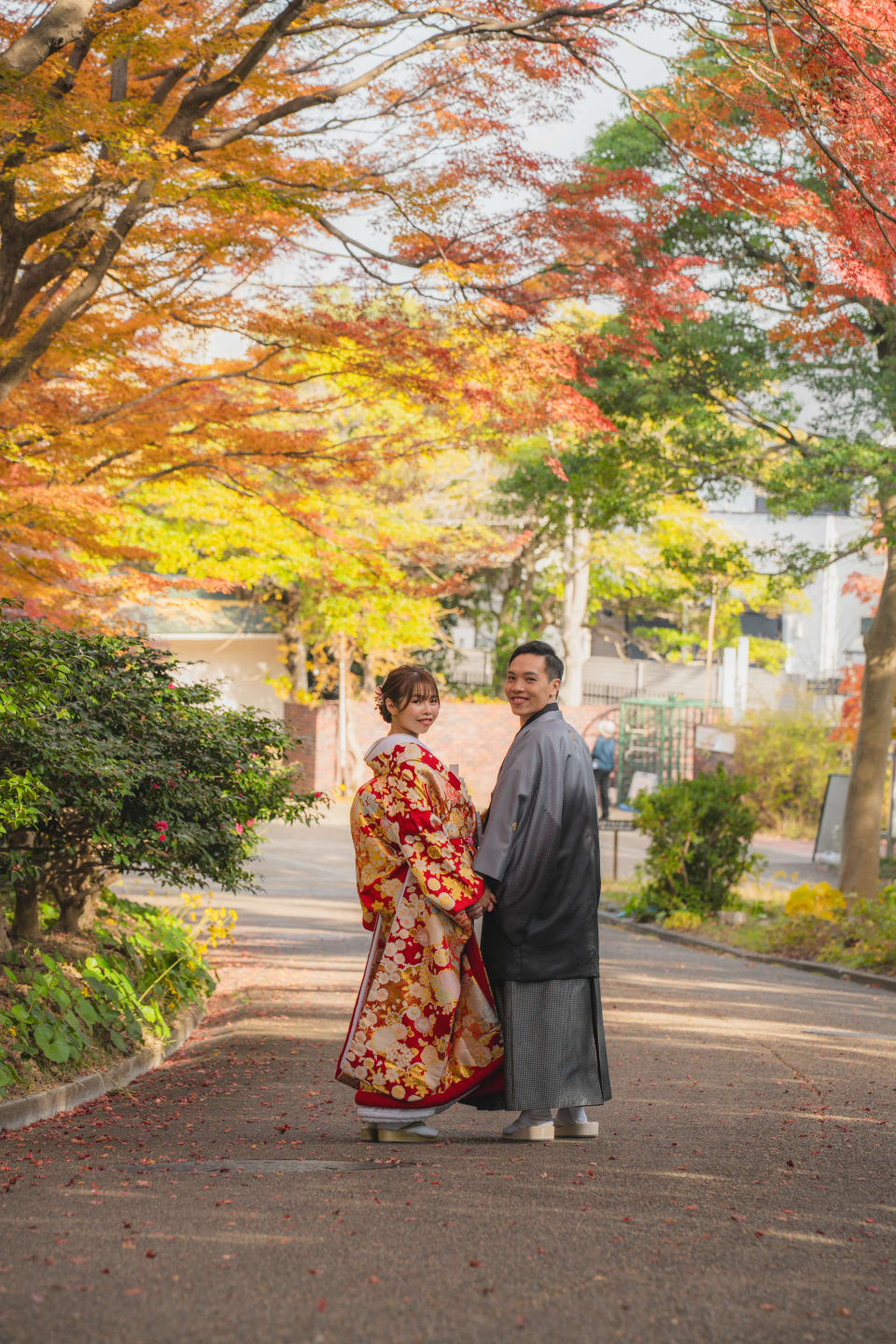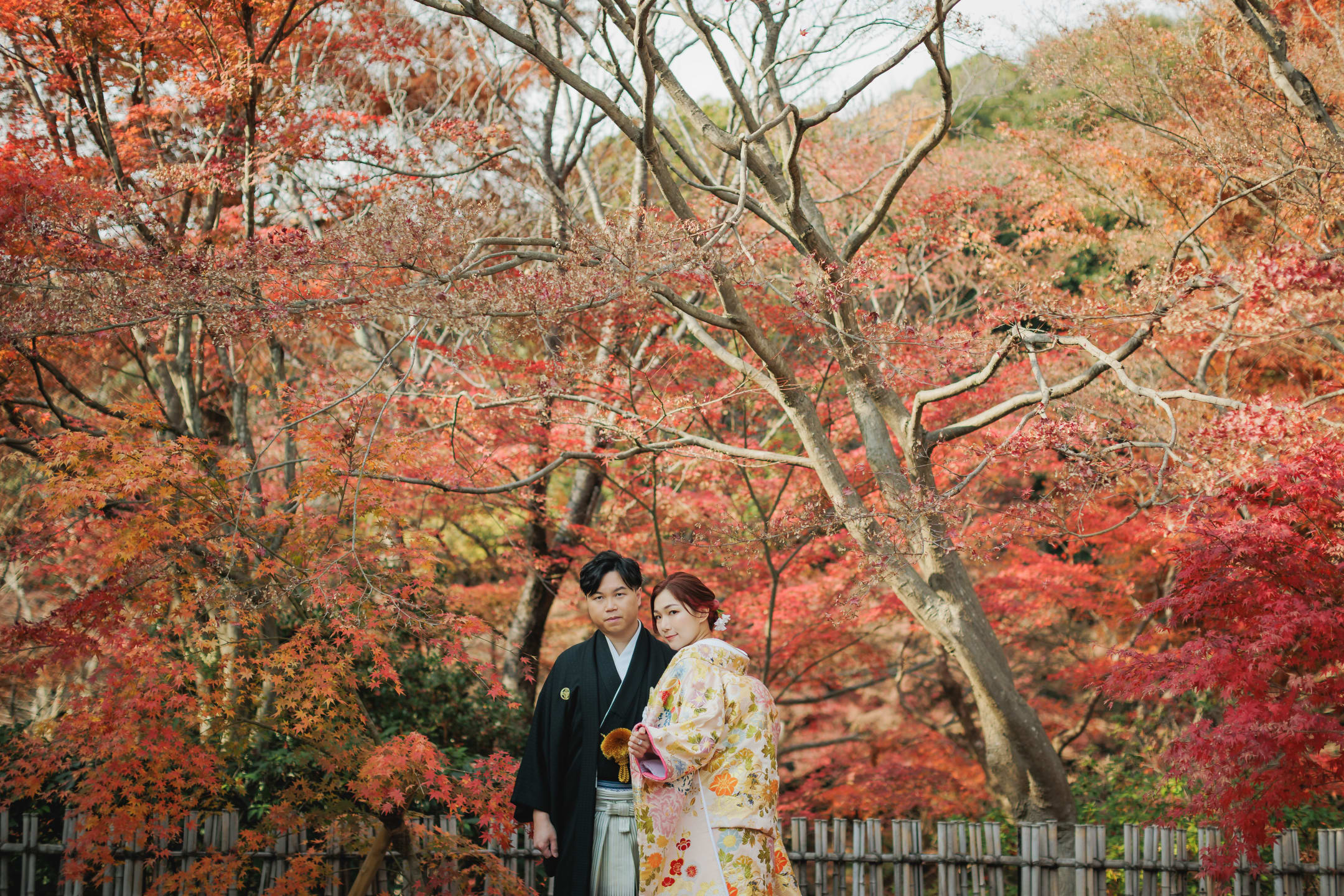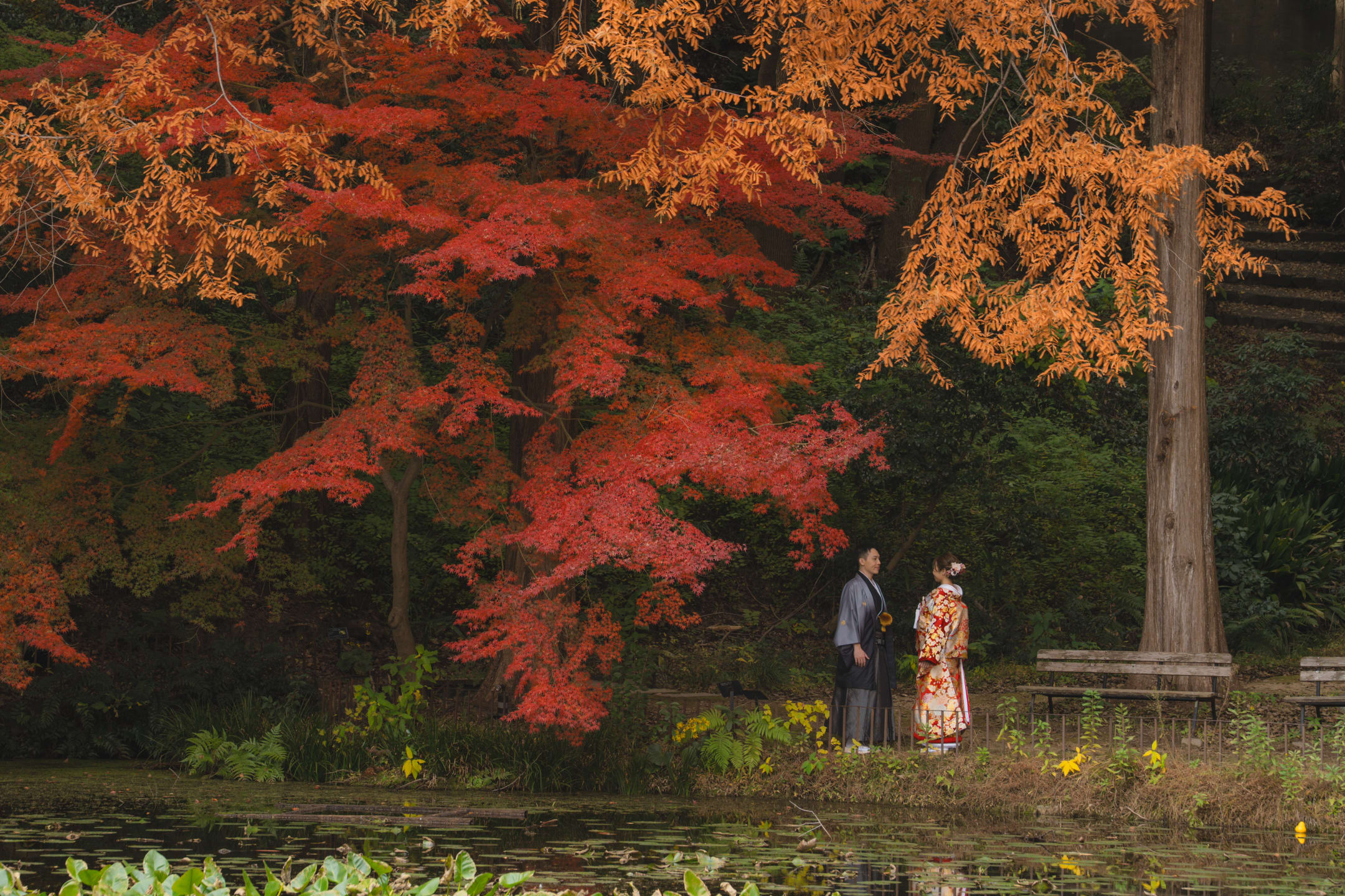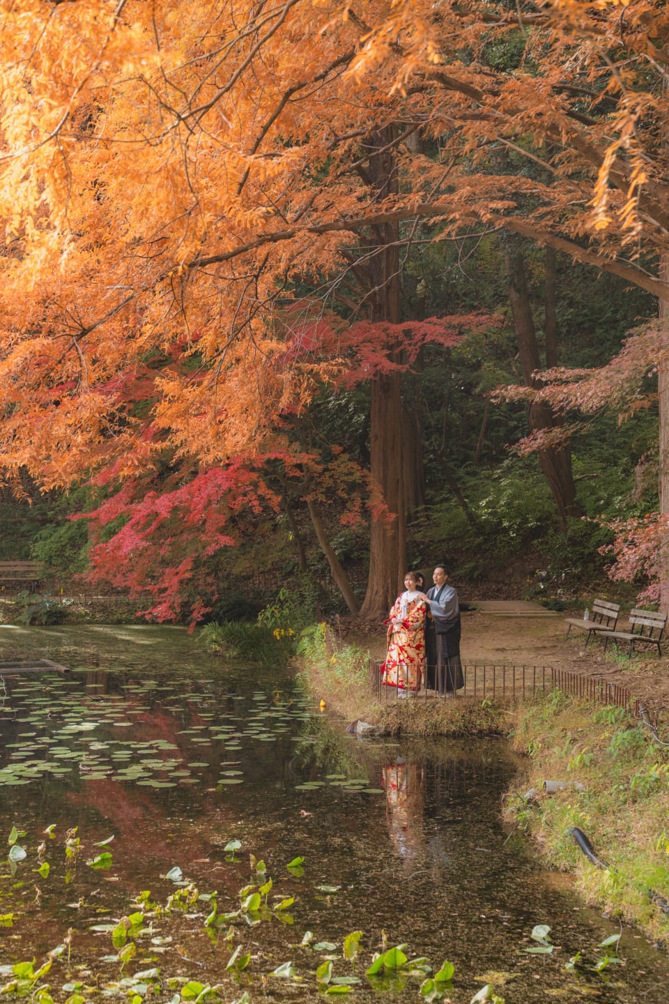 相樂園為四季植栽美麗的日本庭園,以池泉與傳統建築構圖,能拍攝雅致的和裝預拍。自然光與靜謐環境相互襯托。