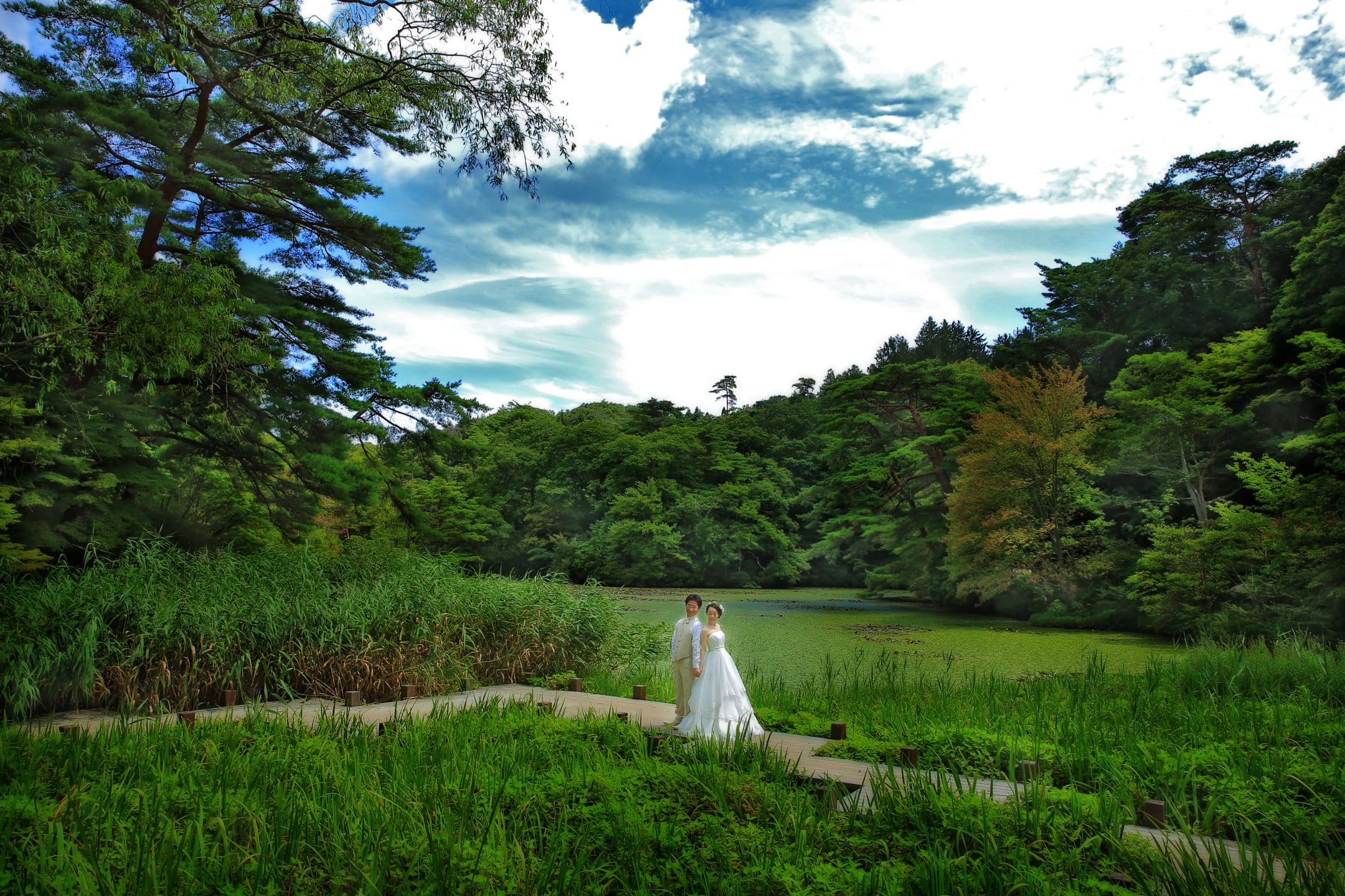 相樂園為四季植栽美麗的日本庭園,以池泉與傳統建築構圖,能拍攝雅致的和裝預拍。自然光與靜謐環境相互襯托。